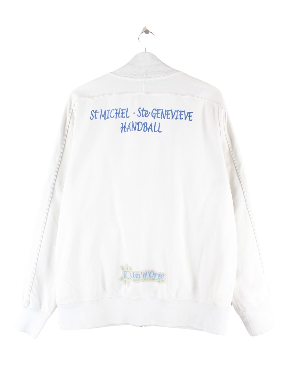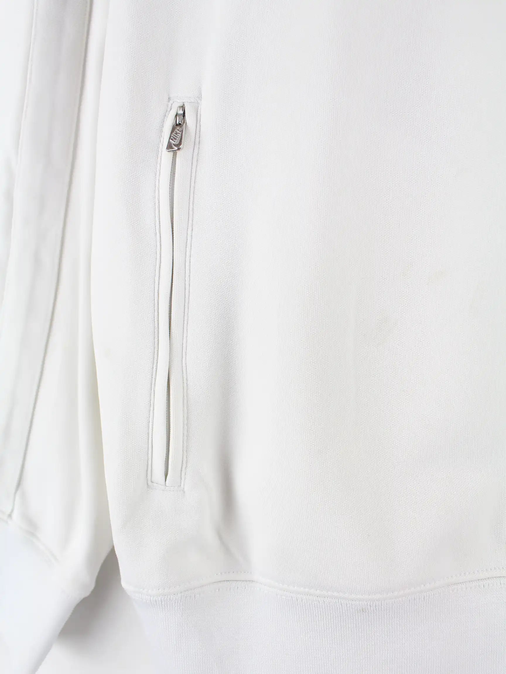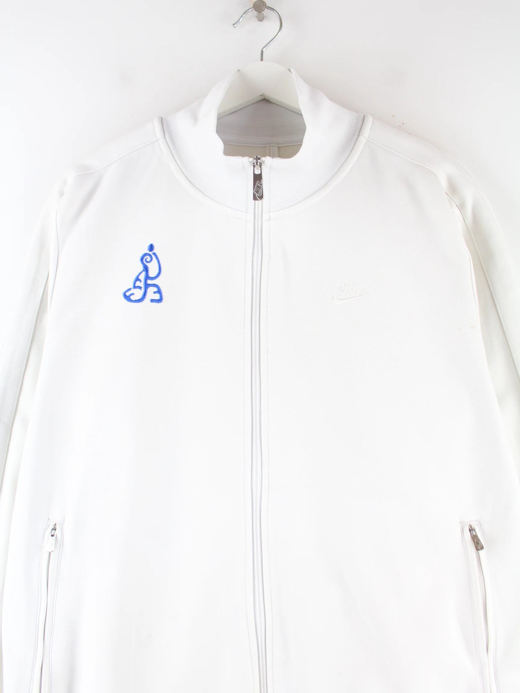 Trainingsjacke der Marke Nike mit gestickten Motiven in Größe L. Sie ist aus Synthetik gefertigt und in Weiß zu haben.
