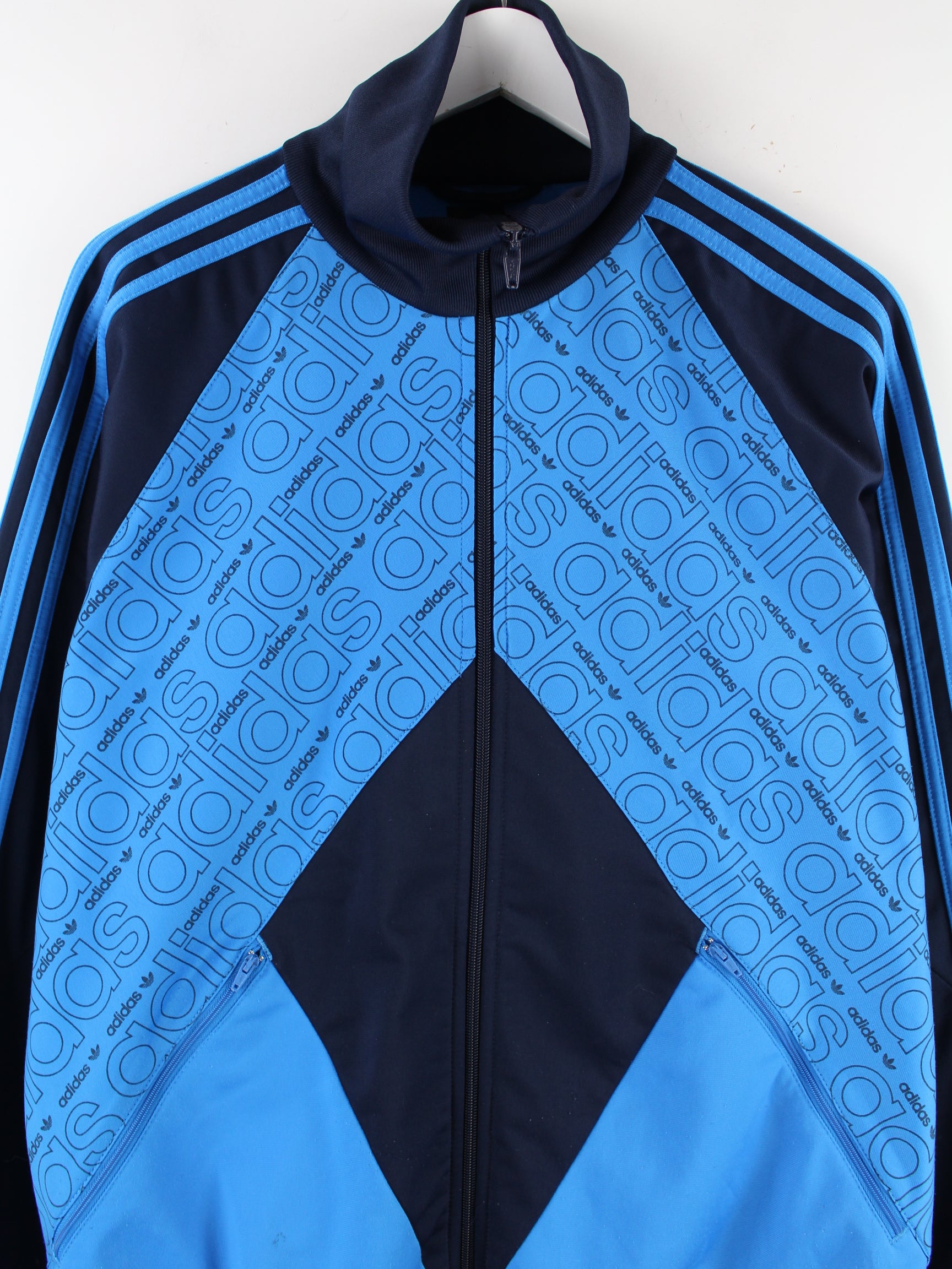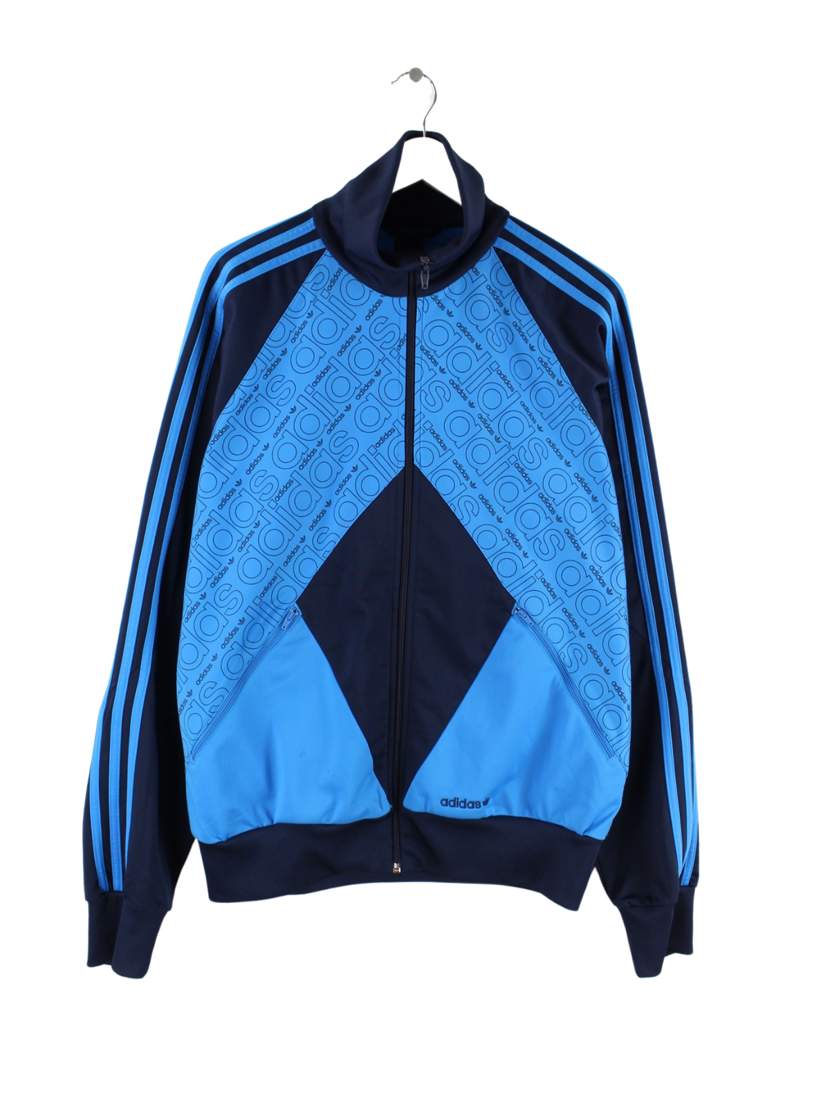 Trainingsjacke aus dem Hause Adidas in Größe L. Sie ist aus Synthetik gefertigt und in Blau zu haben.