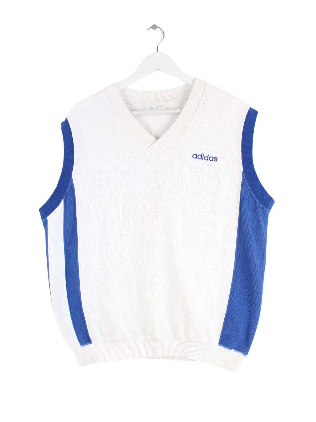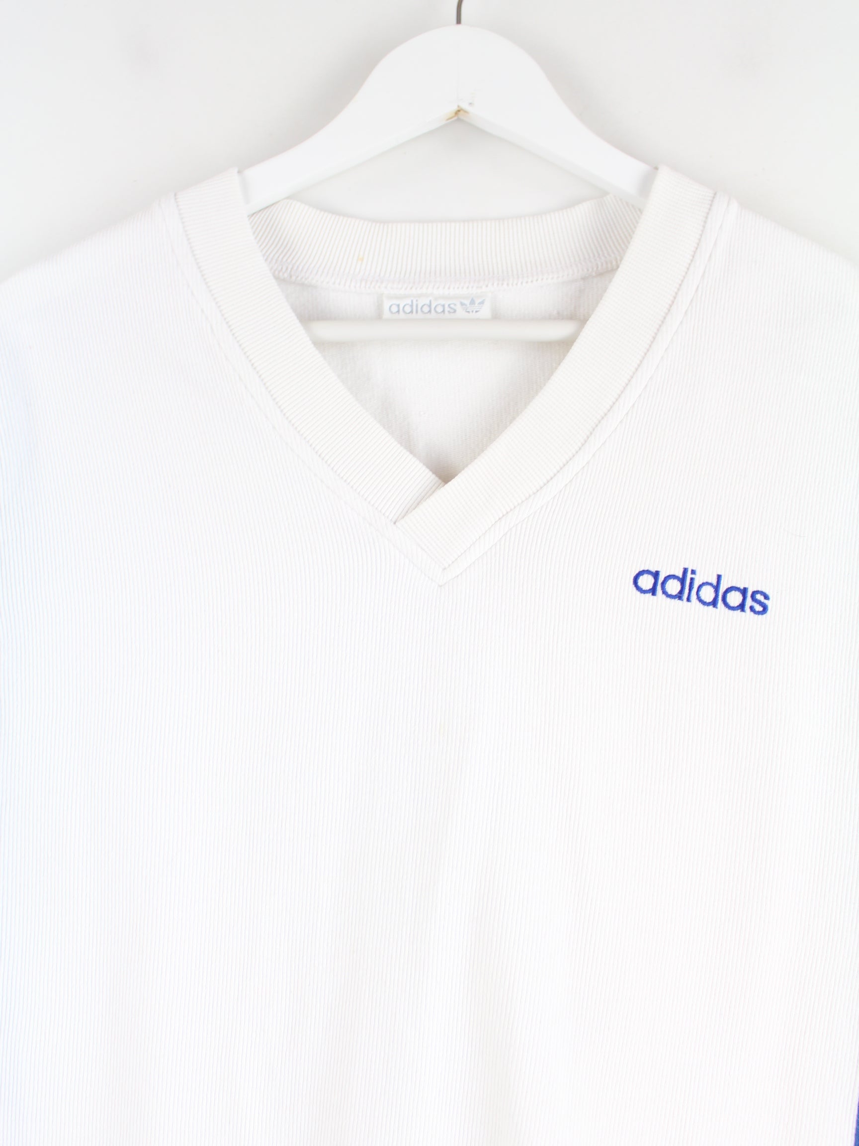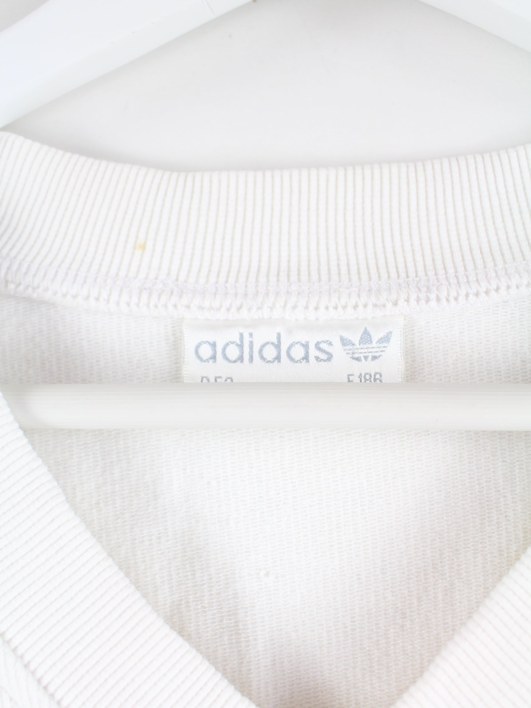 Adidas pullover with embroidered motifs in size M from the 80's. It is made of cotton and is available in white.