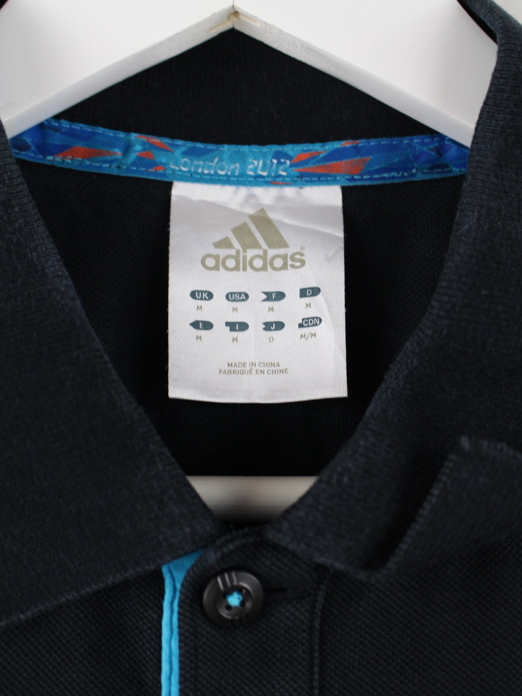 Schwarzes Poloshirt mit Stickereien des Labels Adidas in Größe M. Es ist aus Baumwolle gemacht und in sehr gutem Zustand in Stock.