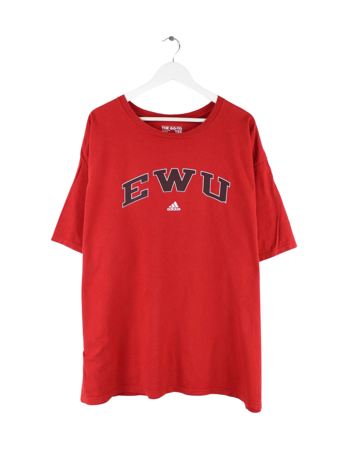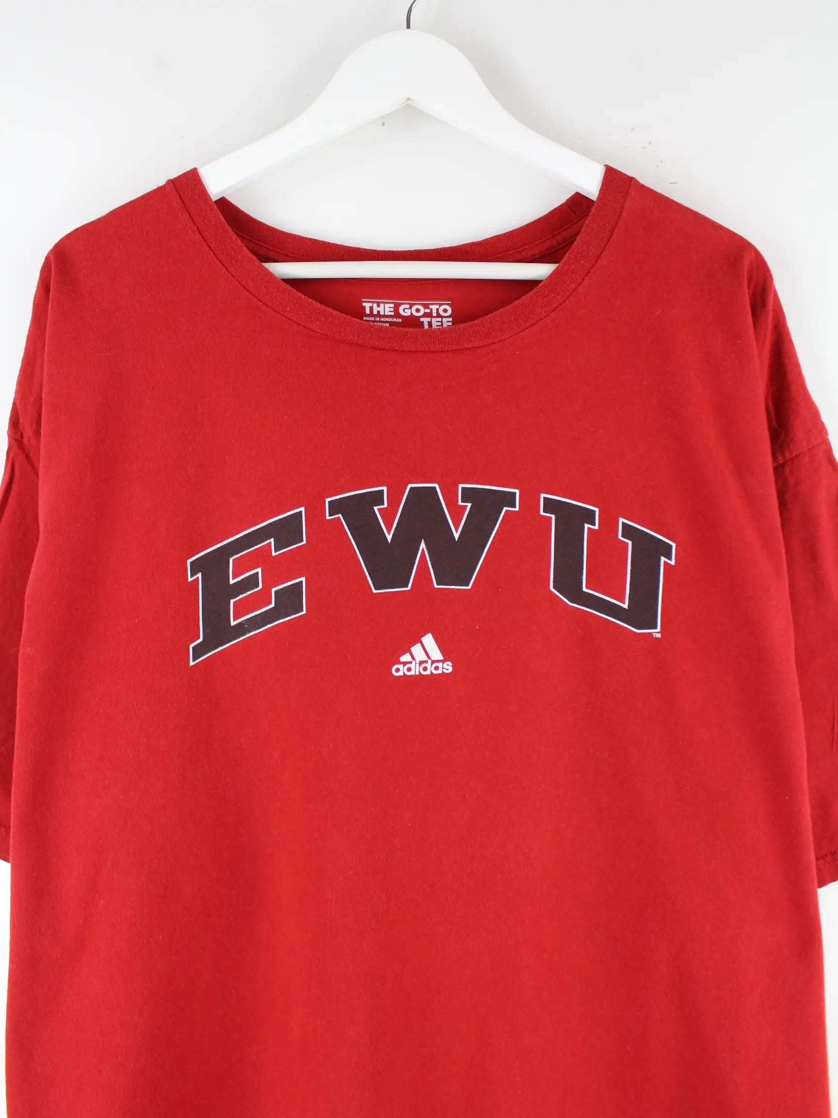 Rotes T-Shirt von Adidas in Größe 3XL. Es ist aus einer Baumwollmischung hergestellt und in sehr gutem Zustand im Bestand. Mit schickem EWU Print.