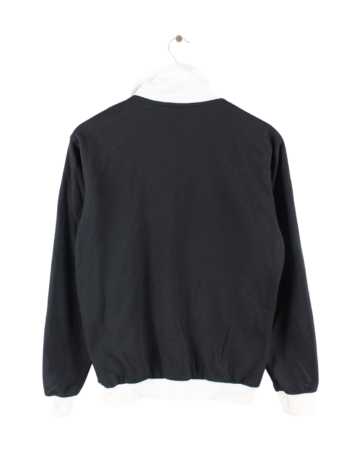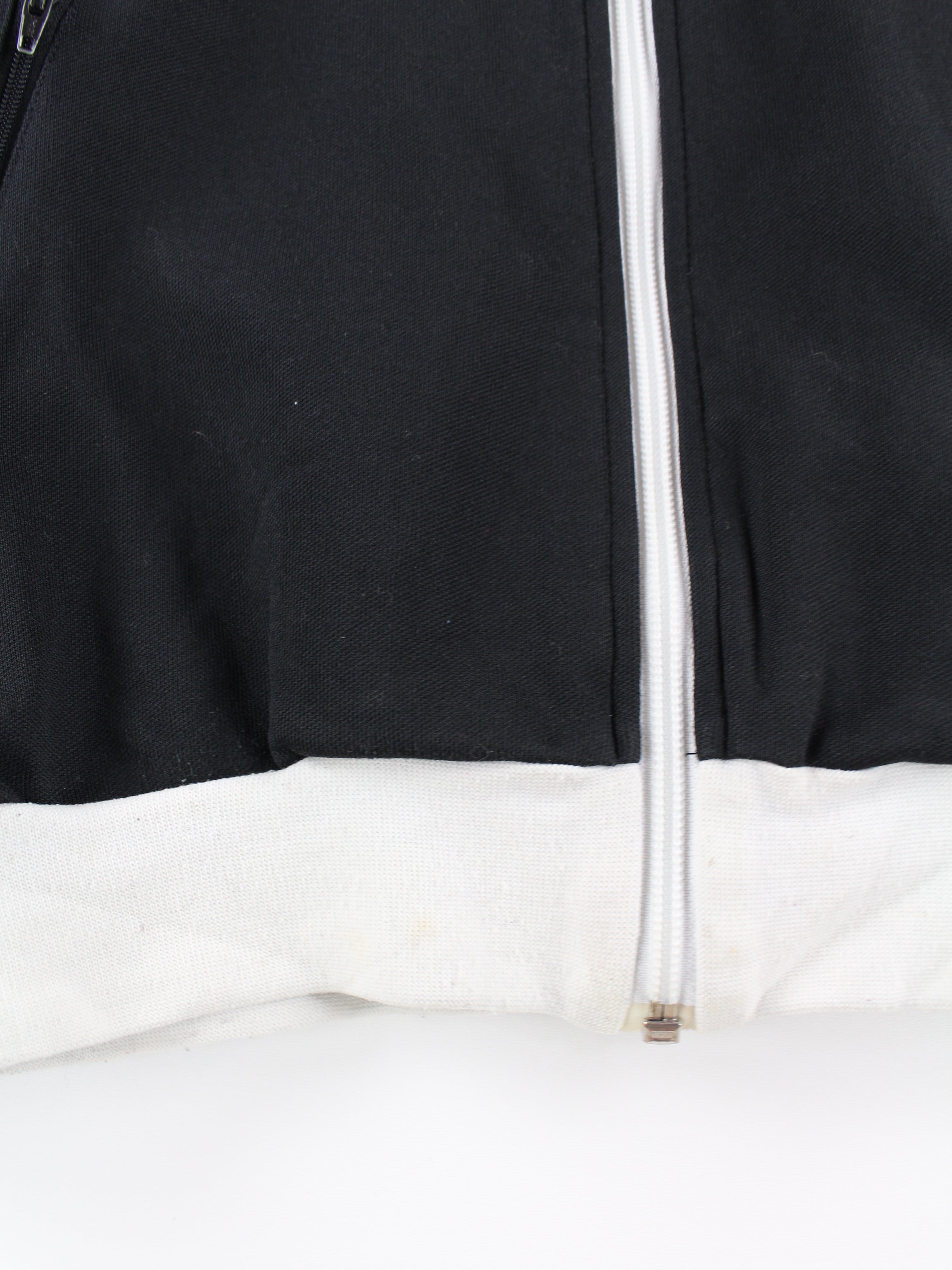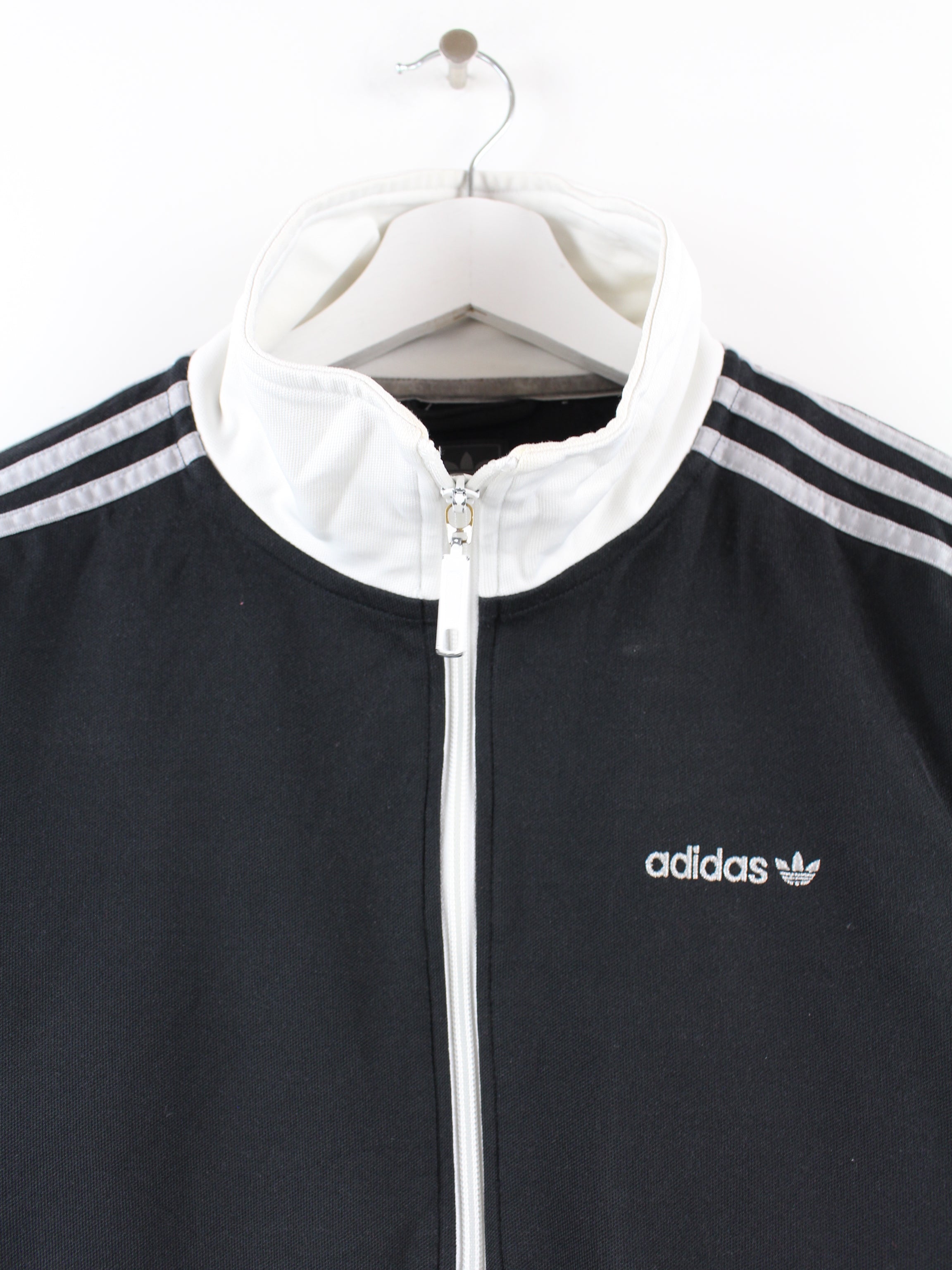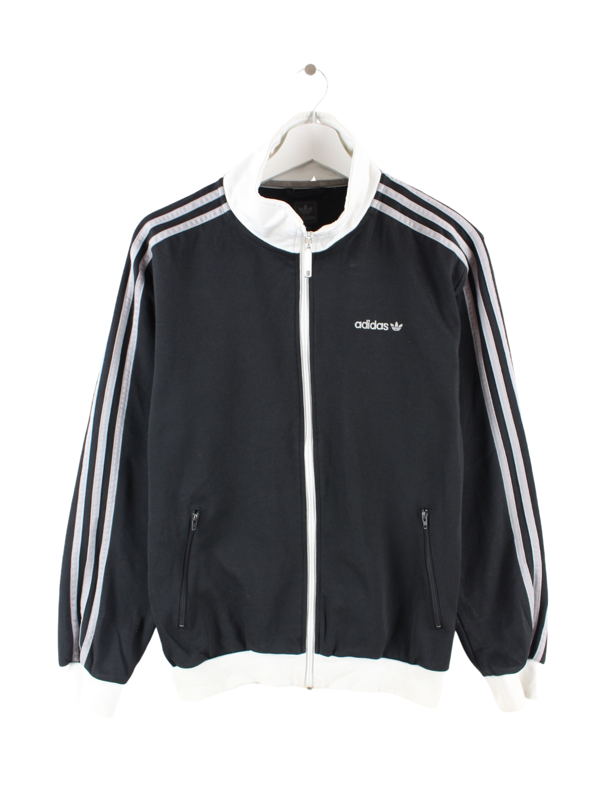 Black Adidas training jacket with the typical three stripes on the sleeves.