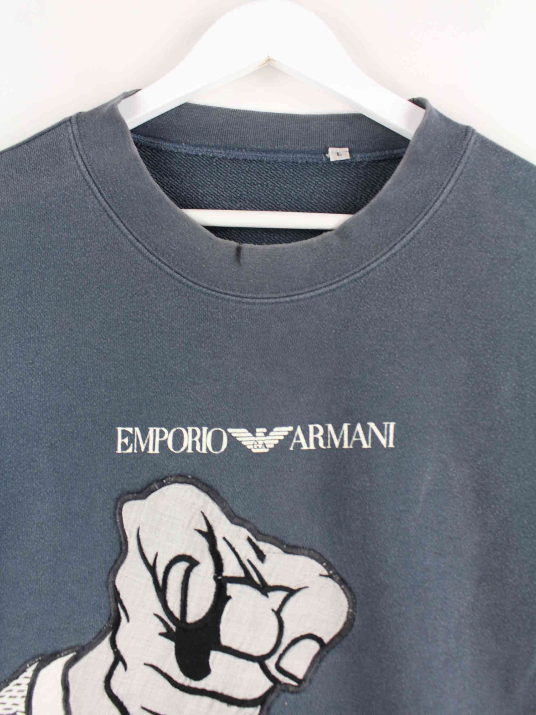 Sweater from the Armani label with embroidery in size M. It is made from a cotton blend and is available in blue.