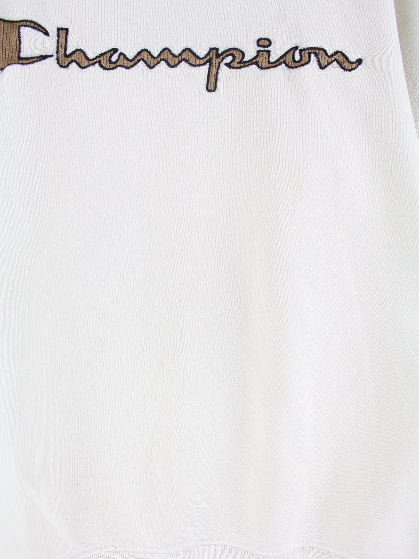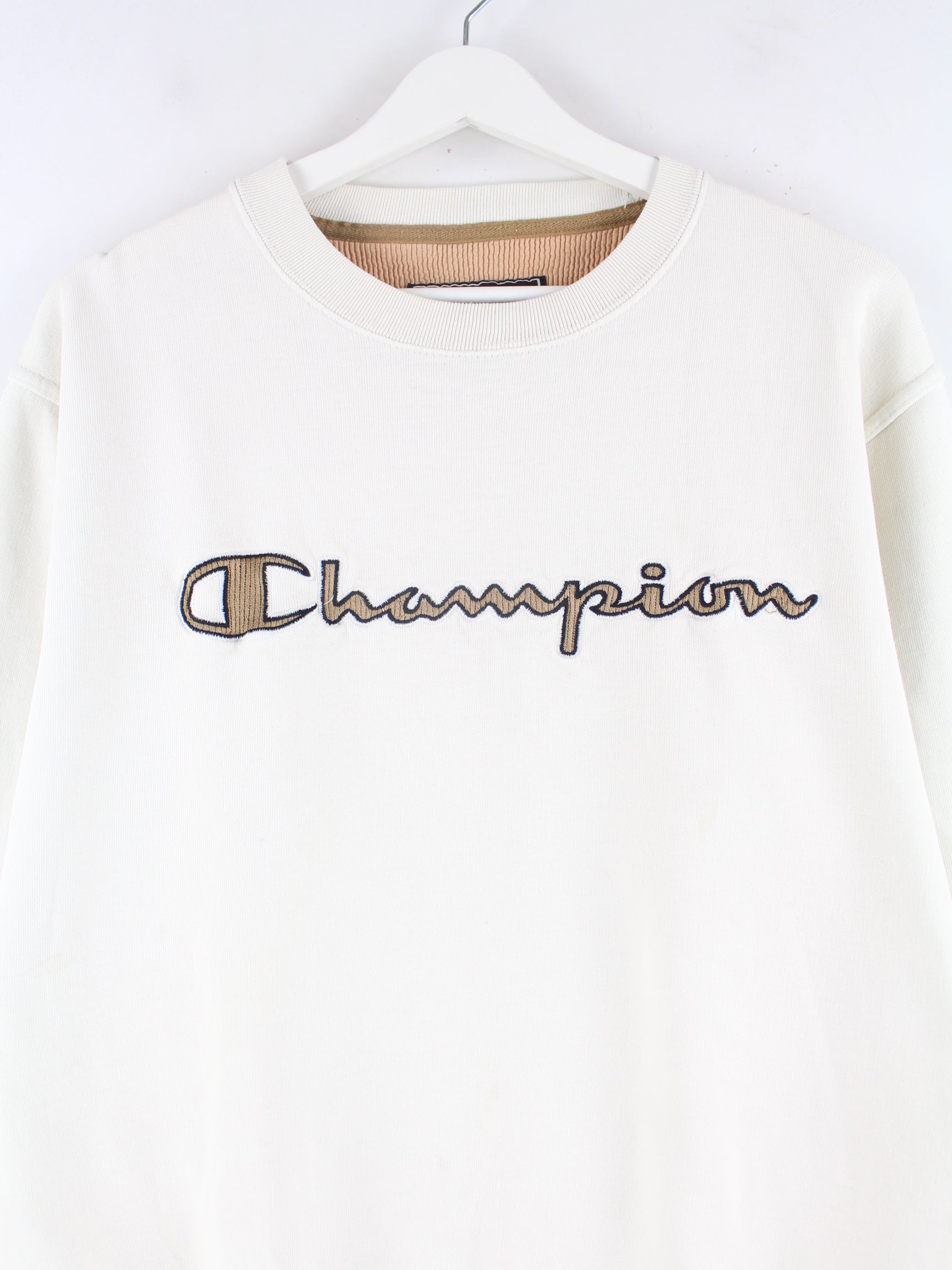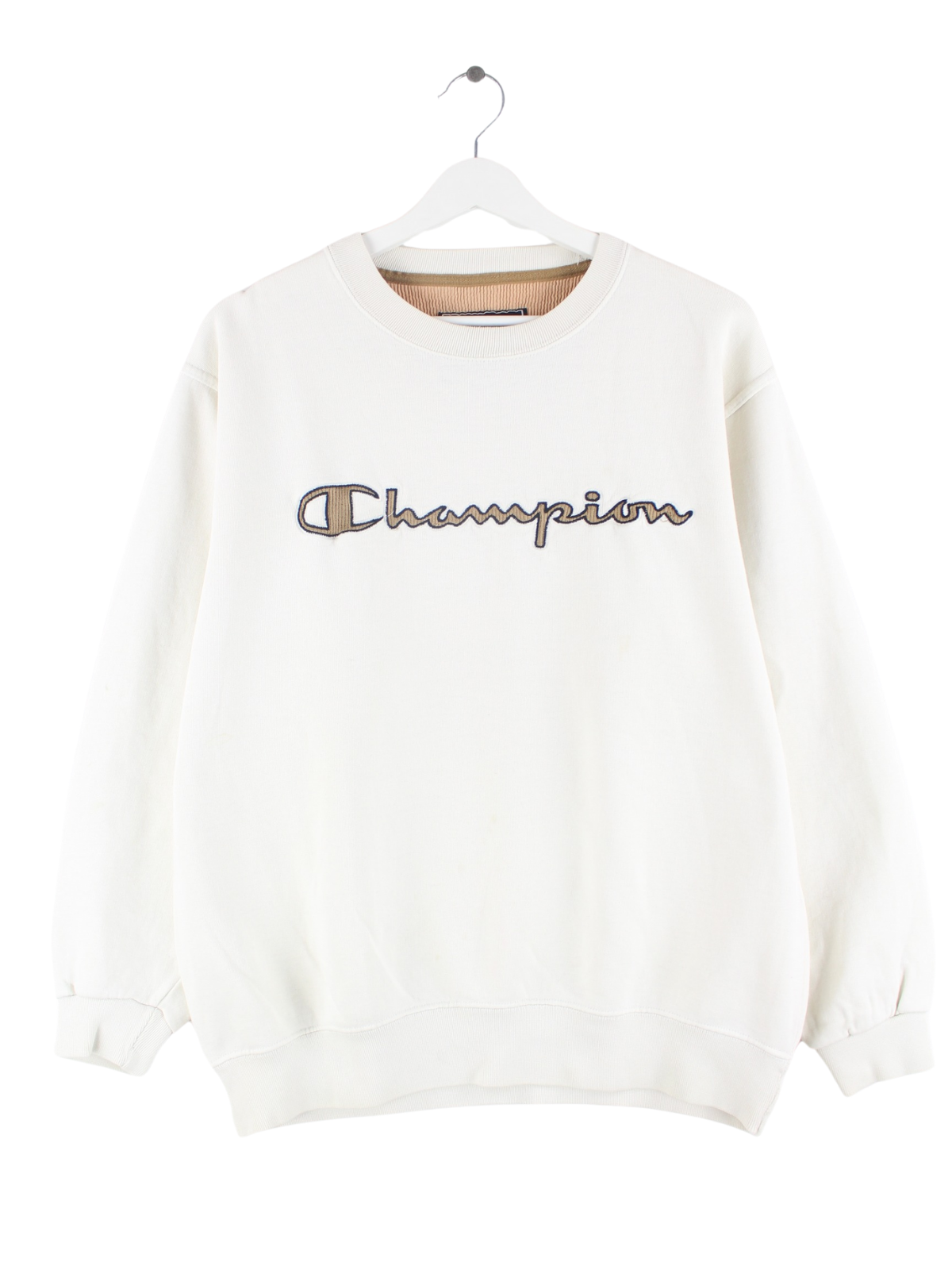 Sweater von Champion mit Stick in Größe M. Er ist aus einer Baumwollmischung produziert und in Beige lieferbar.