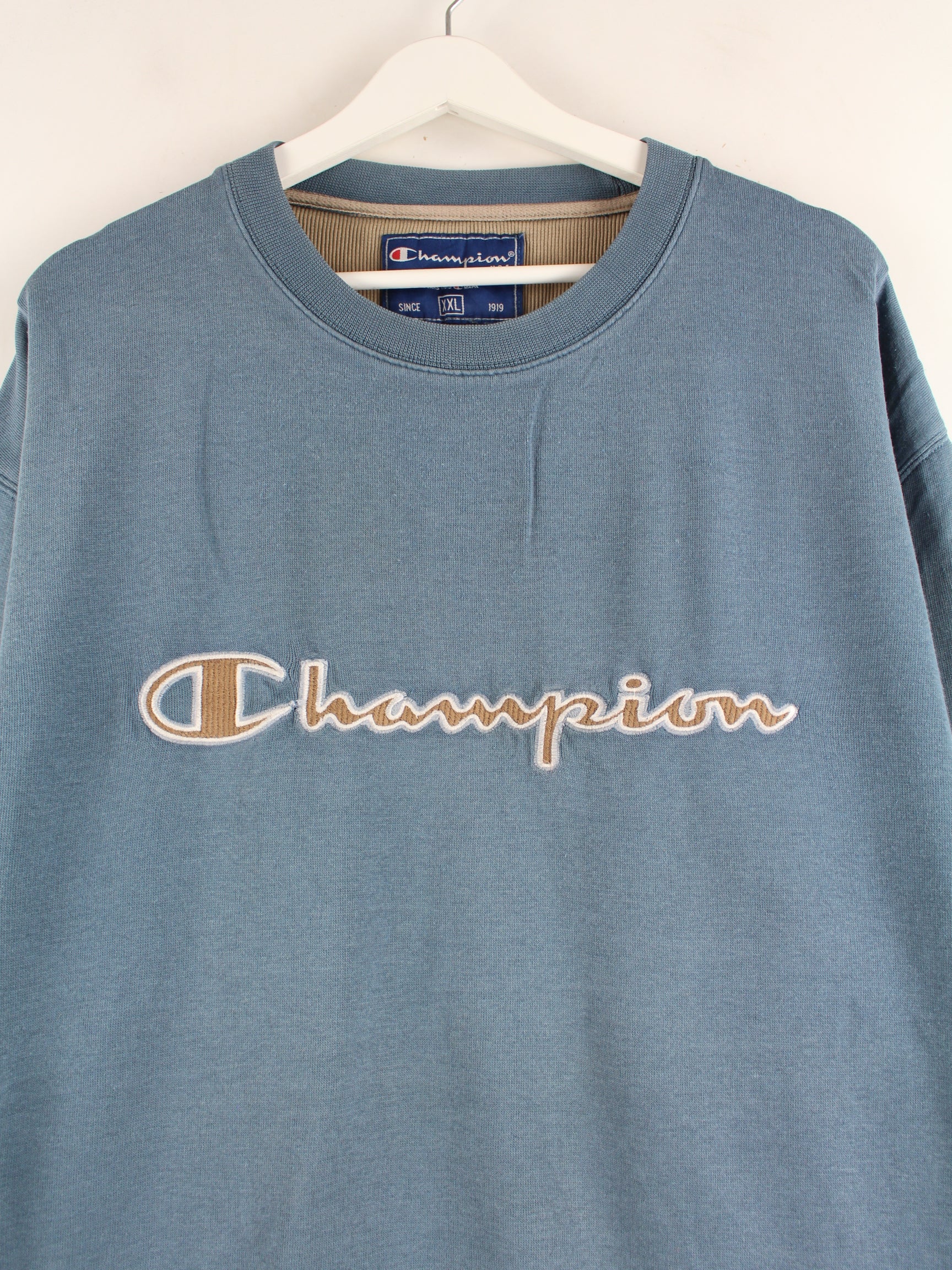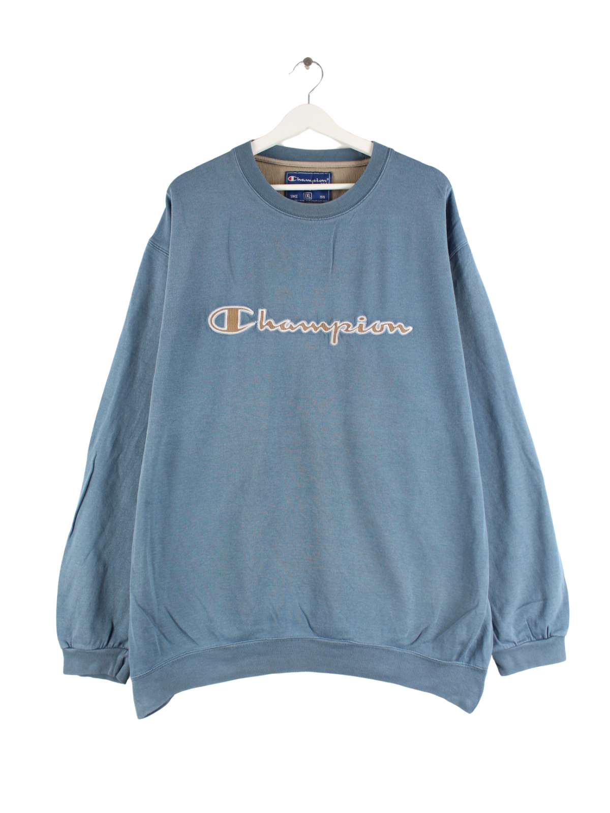 Blue sweater with embroidery from the label Champion in size XXL. It is made of a cotton blend. We would describe the condition as 'fine' (see pictures).