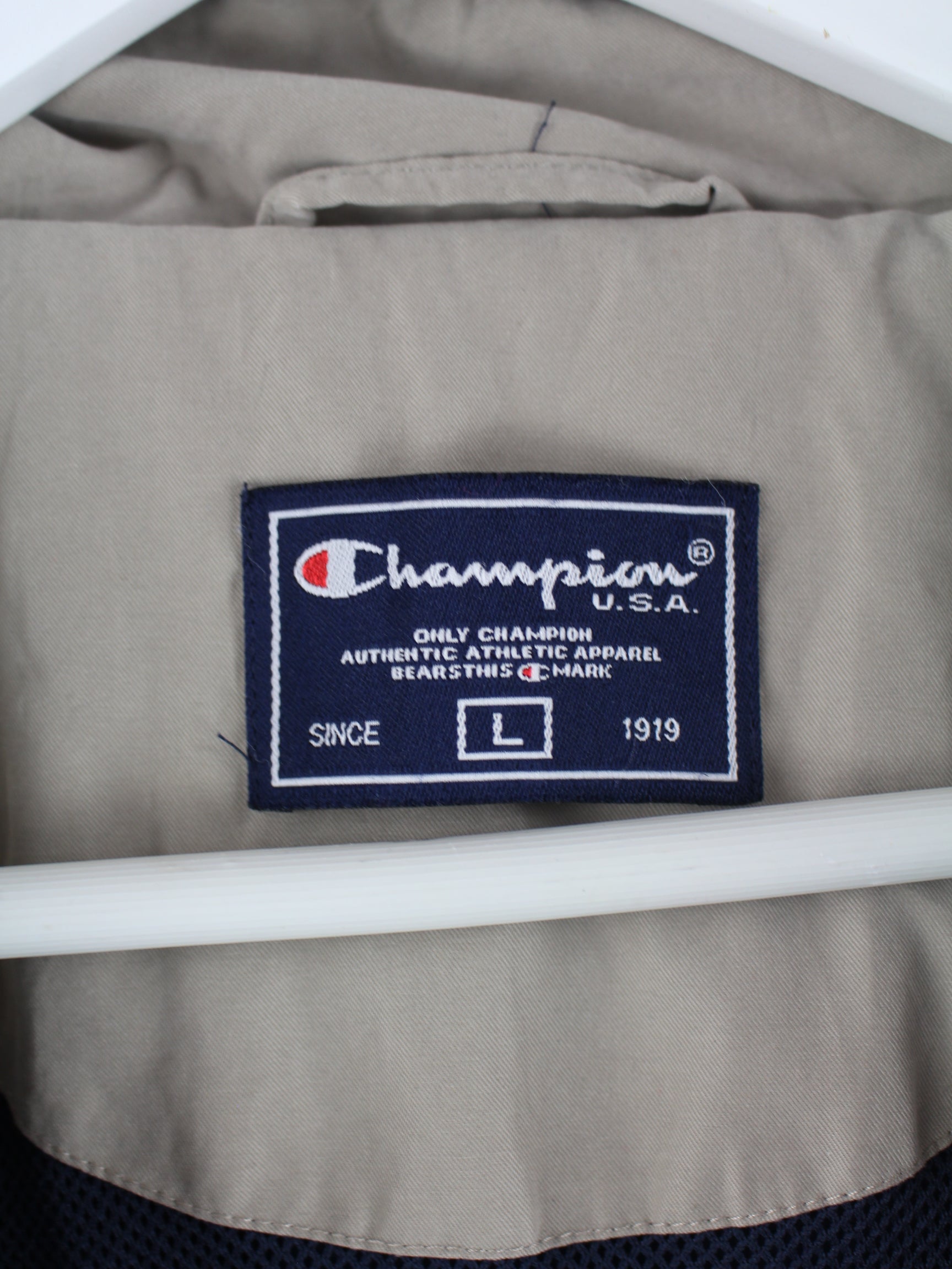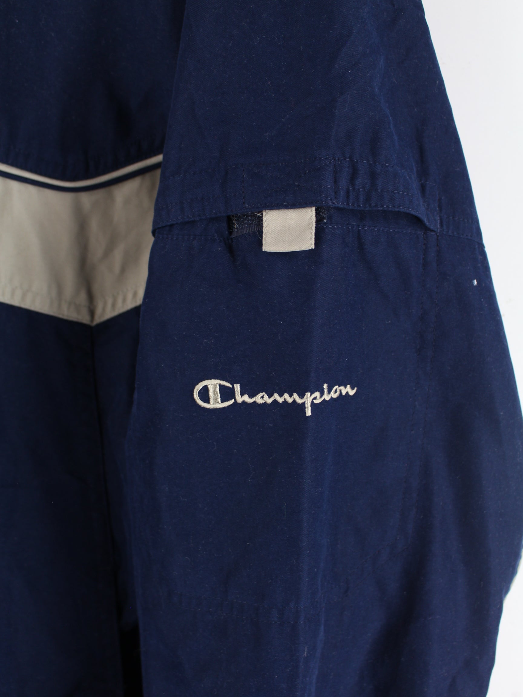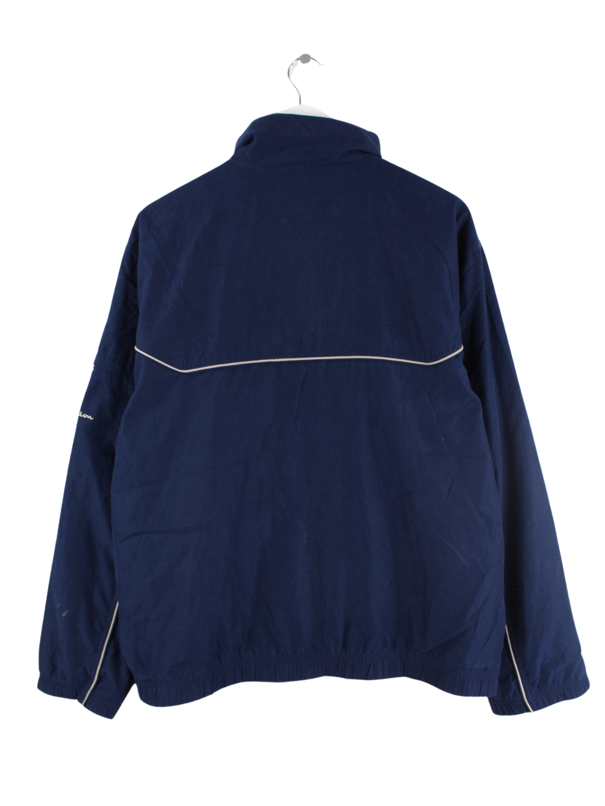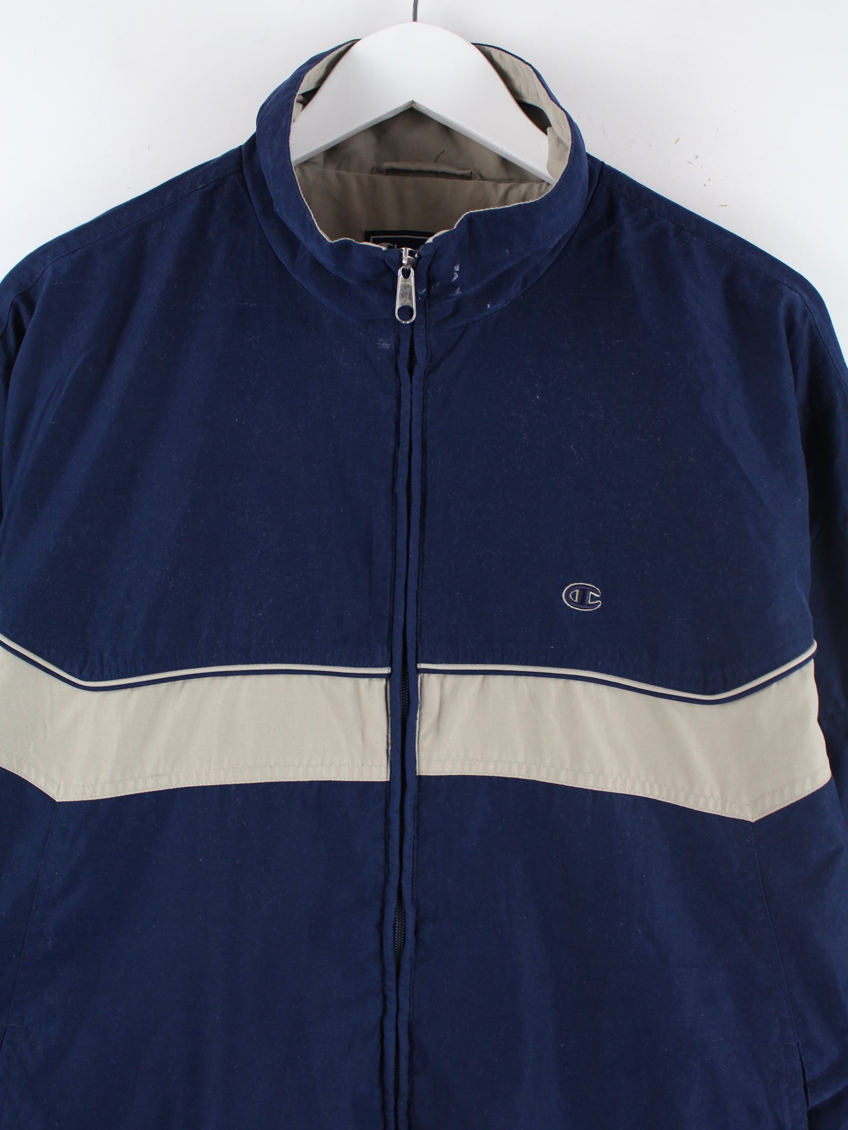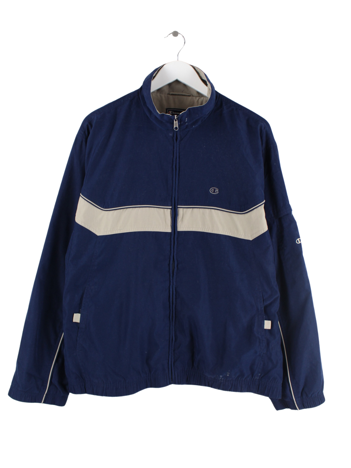 Blaue Trainingsjacke aus dem Hause Champion in Größe L. Sie ist aus Synthetik produziert. Den Zustand würden wir als 'In Ordnung' bezeichnen (vergl. Bilder).