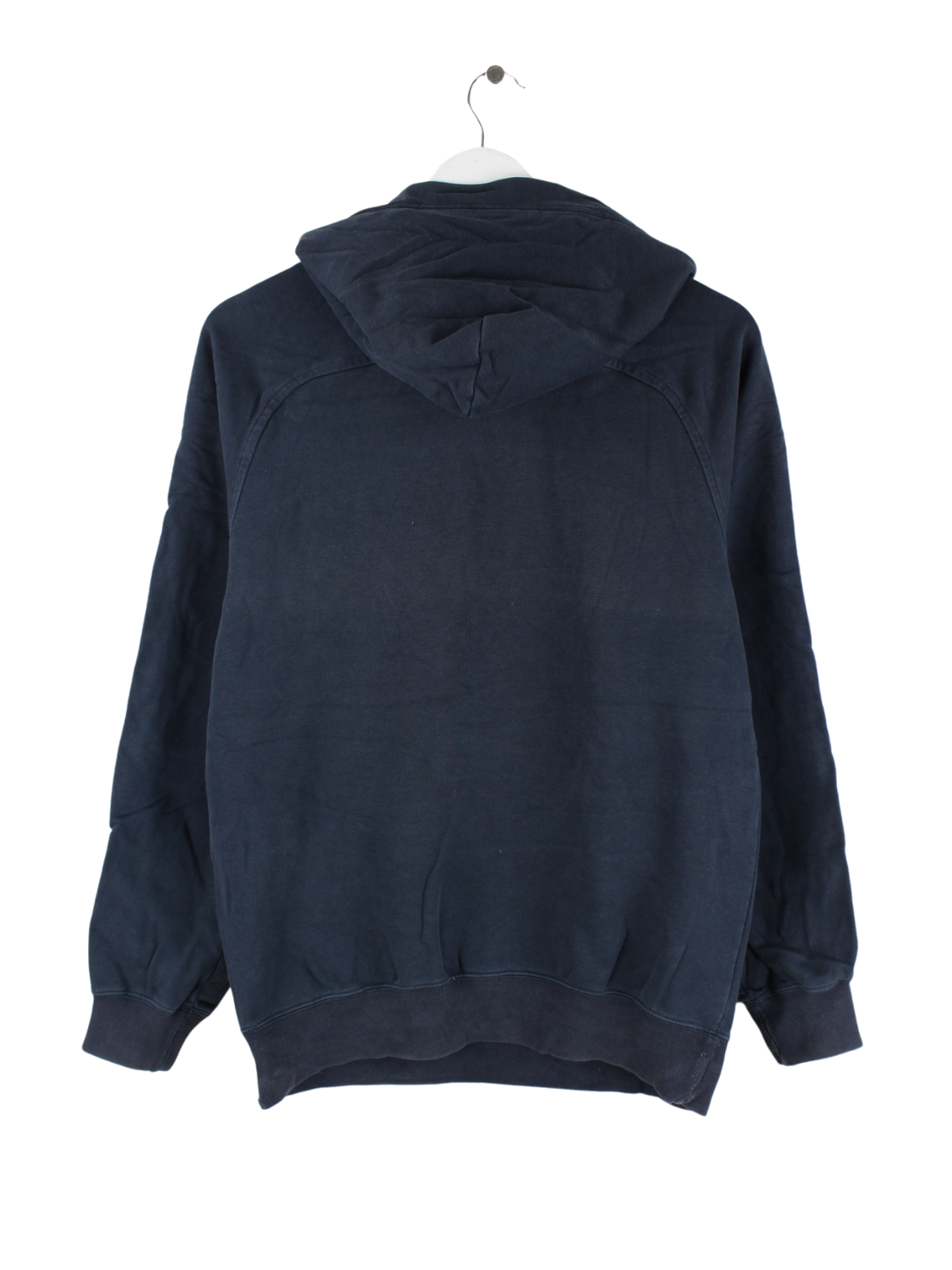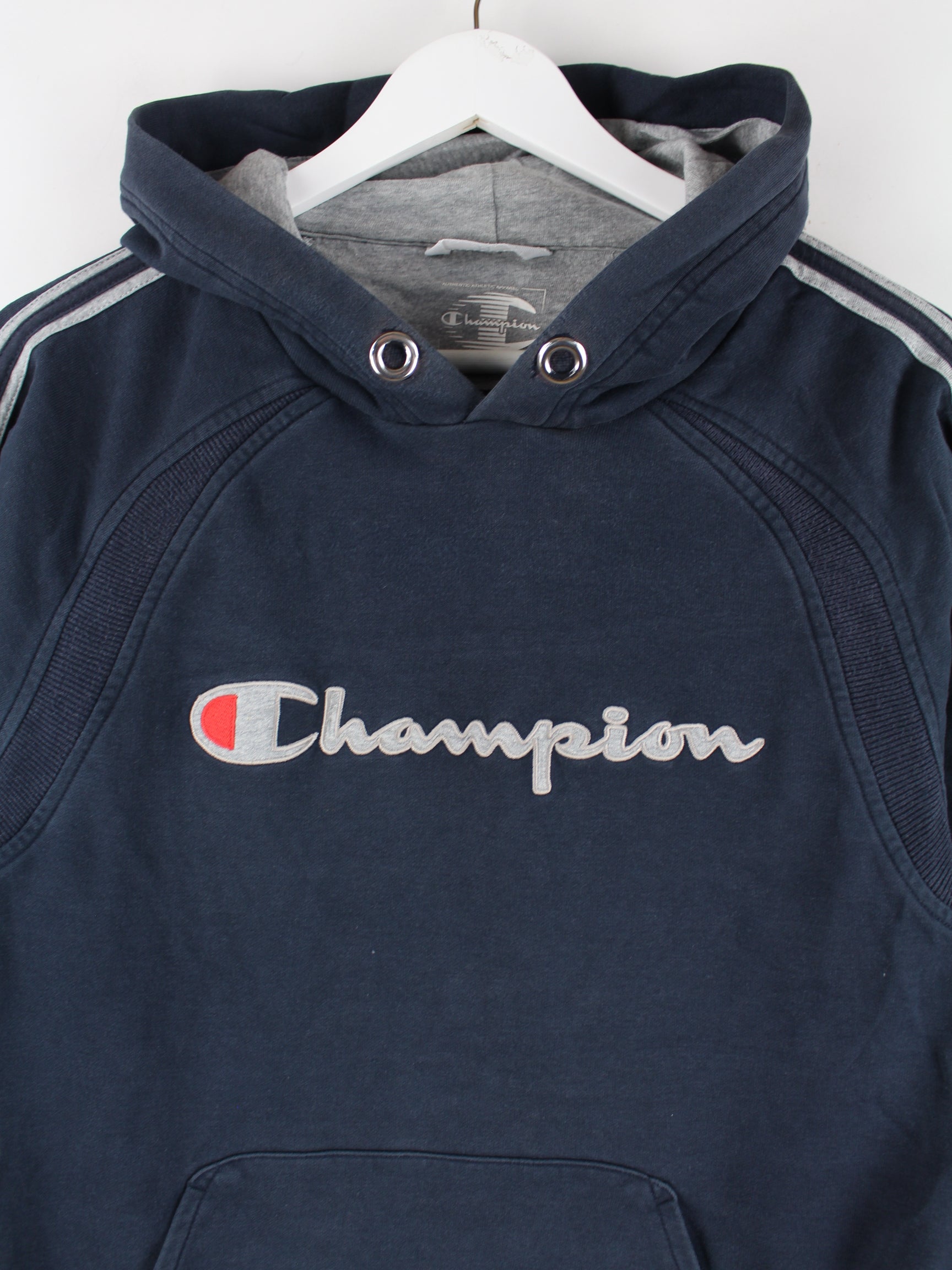 Blauer Hoodie mit Stick der Marke Champion in Größe M. Er ist aus einer Baumwollmischung gefertigt und in sehr gutem Zustand lieferbar.
