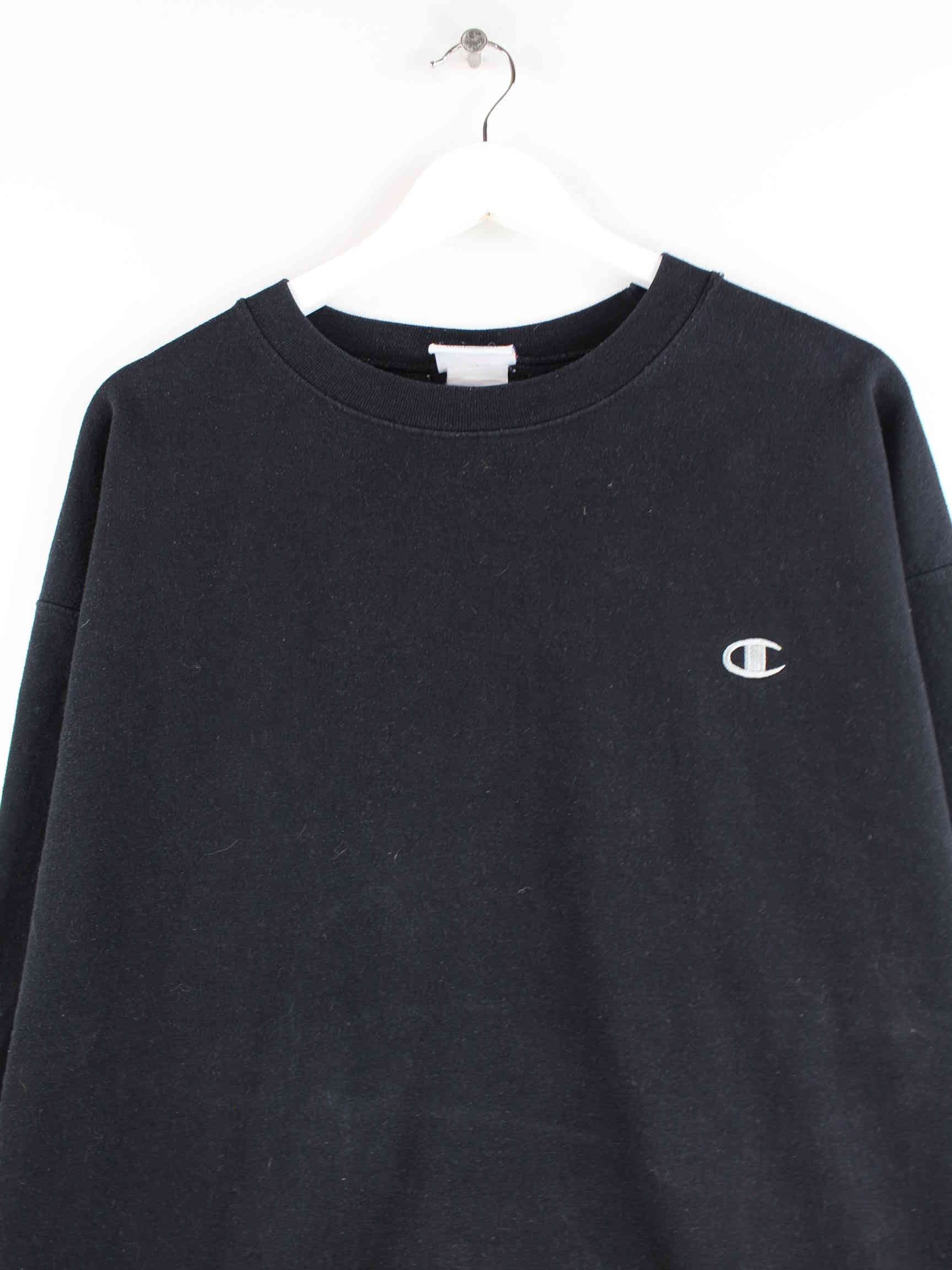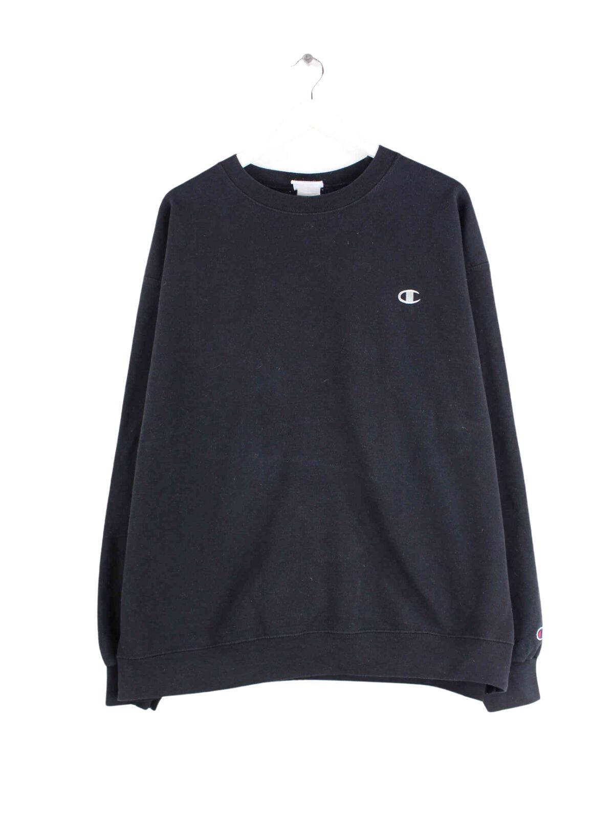 Black sweater with embroidered logo from Champion in size XXL. It is made from a cotton blend and is in good condition in stock.