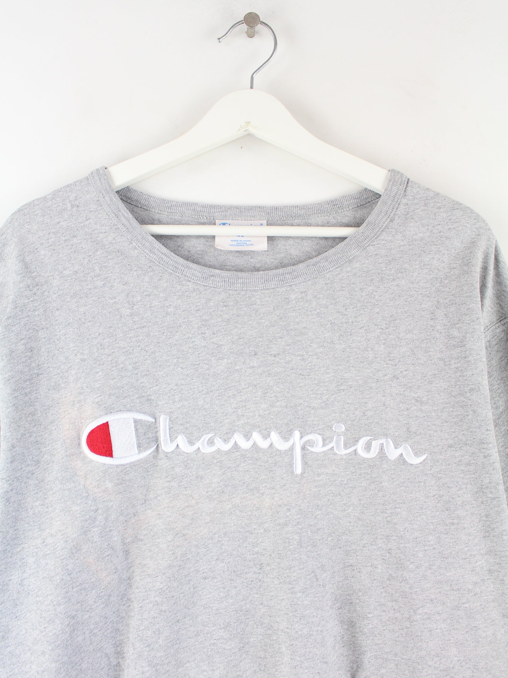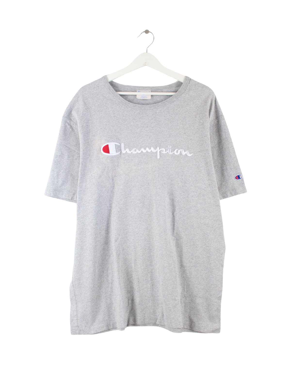 Grey T-shirt with embroidery from the brand Champion in size XL. It is made of cotton and is available in good condition.