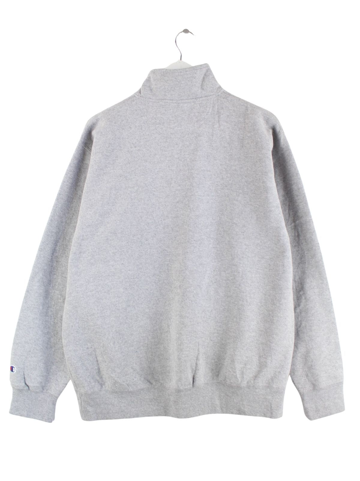 Grauer Sweater mit Stick und kurzem Reißverschluß des Labels Champion in Größe L. Er ist aus einer Baumwollmischung gefertigt und in sehr gutem Zustand im Bestand.