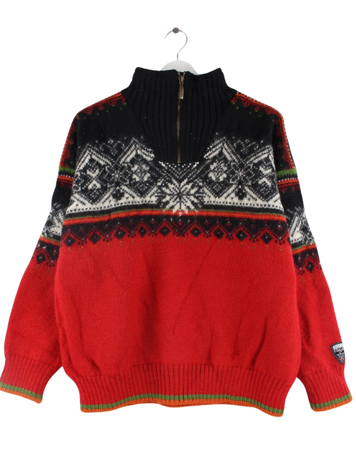 Roter Pullover mit halbem Reißverschluß vom Label Dale of Norway in Größe M. Er ist aus Baumwolle gefertigt und in sehr gutem Zustand in Stock.