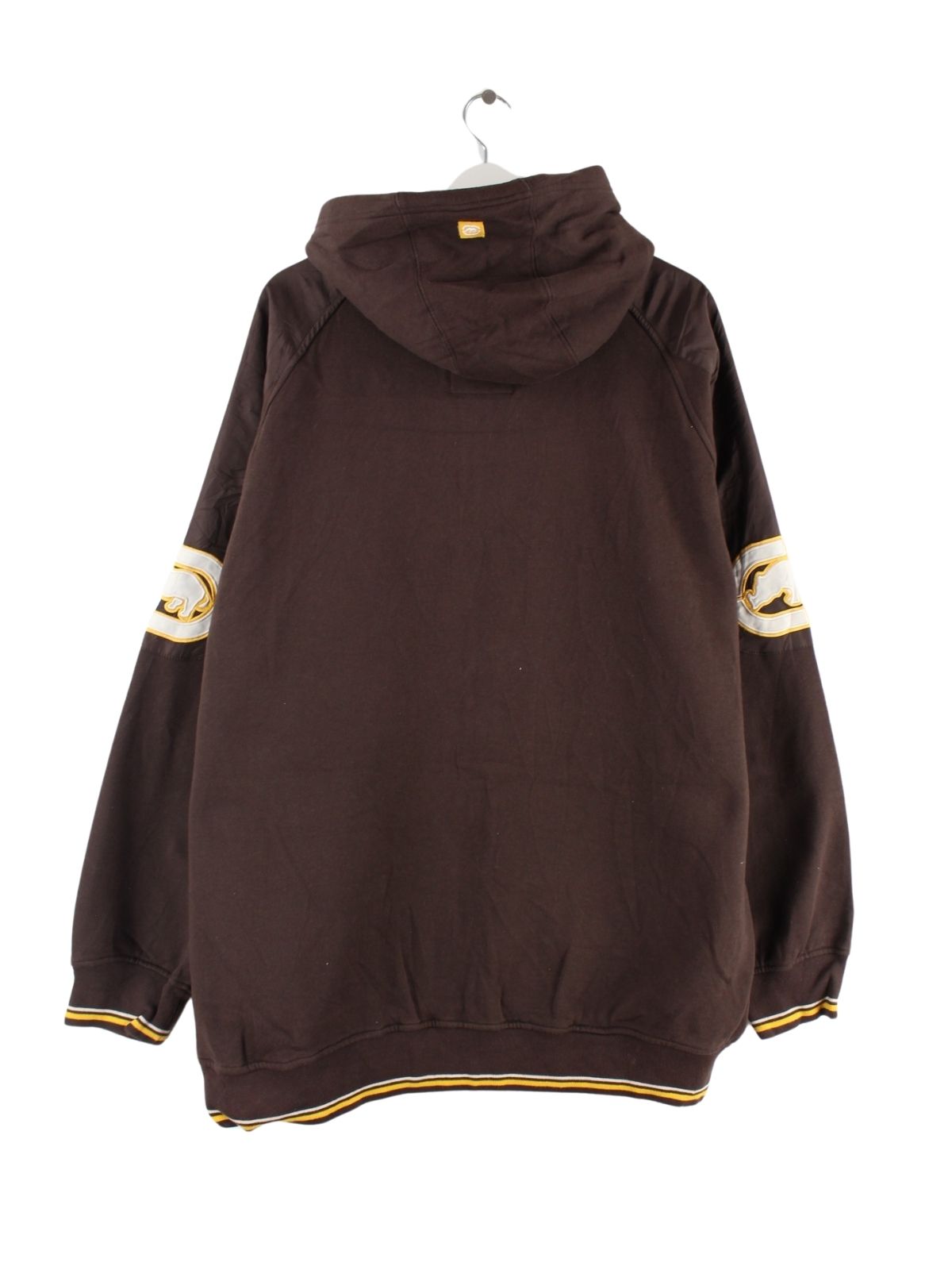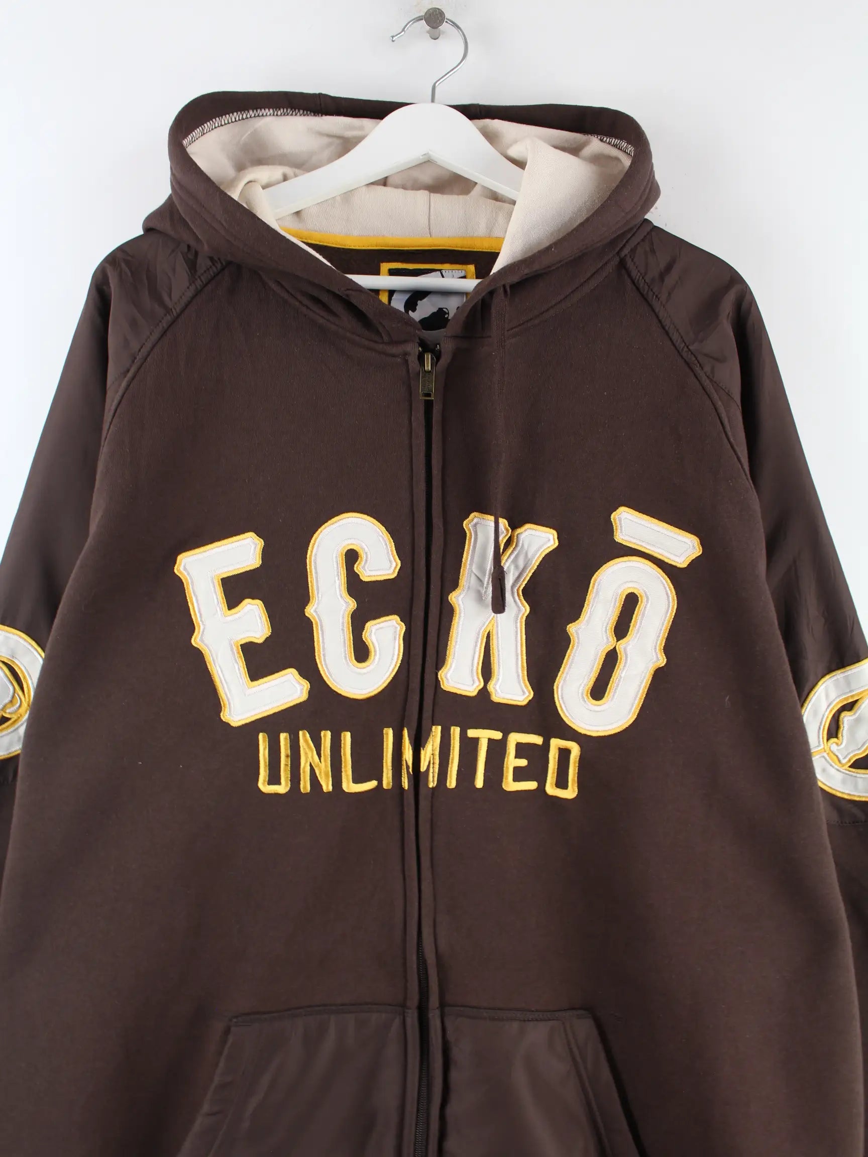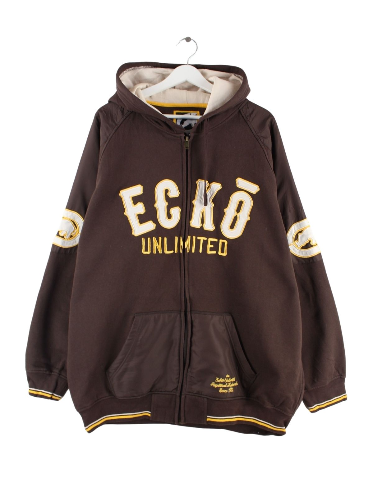 Hoodie der Marke Ecko mit Stick in Größe XXL aus Anfang der 2000'er. Er ist aus einer Baumwollmischung gemacht und in Braun lieferbar.