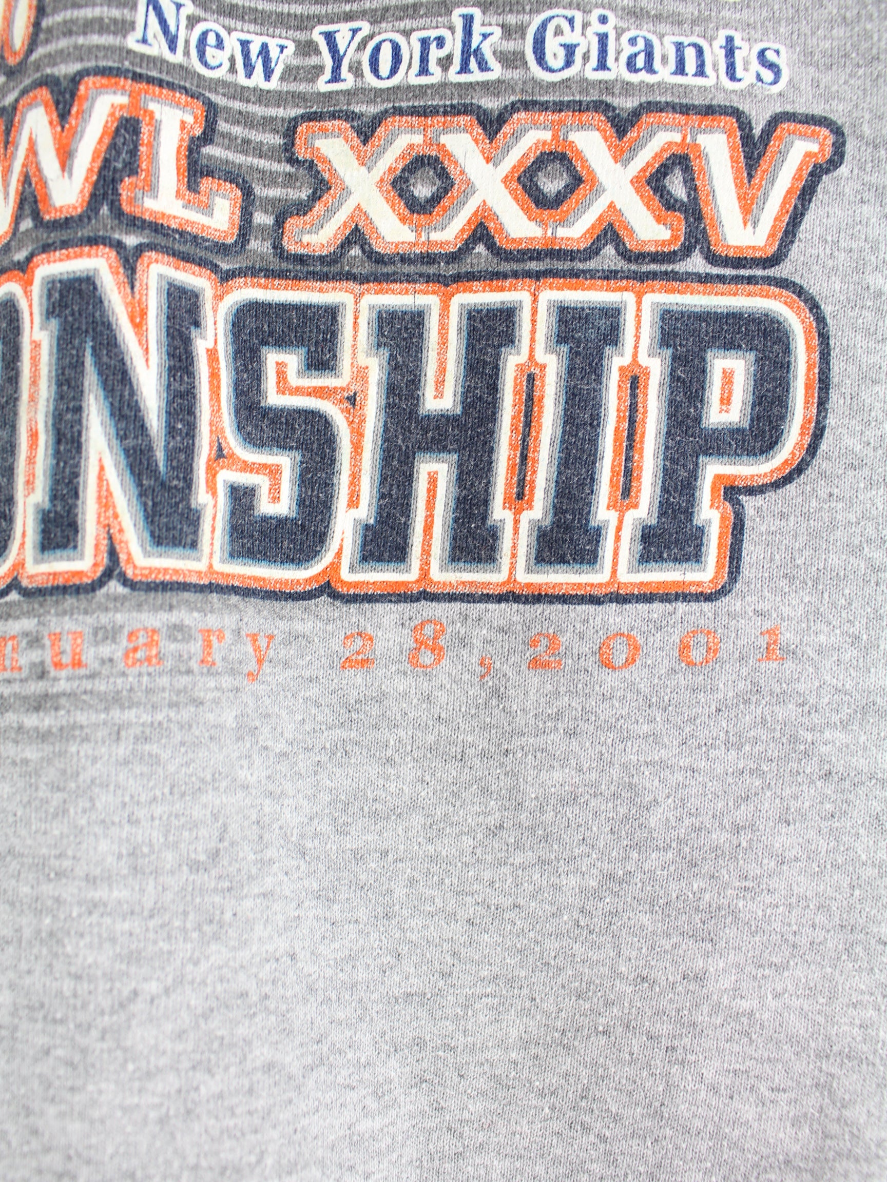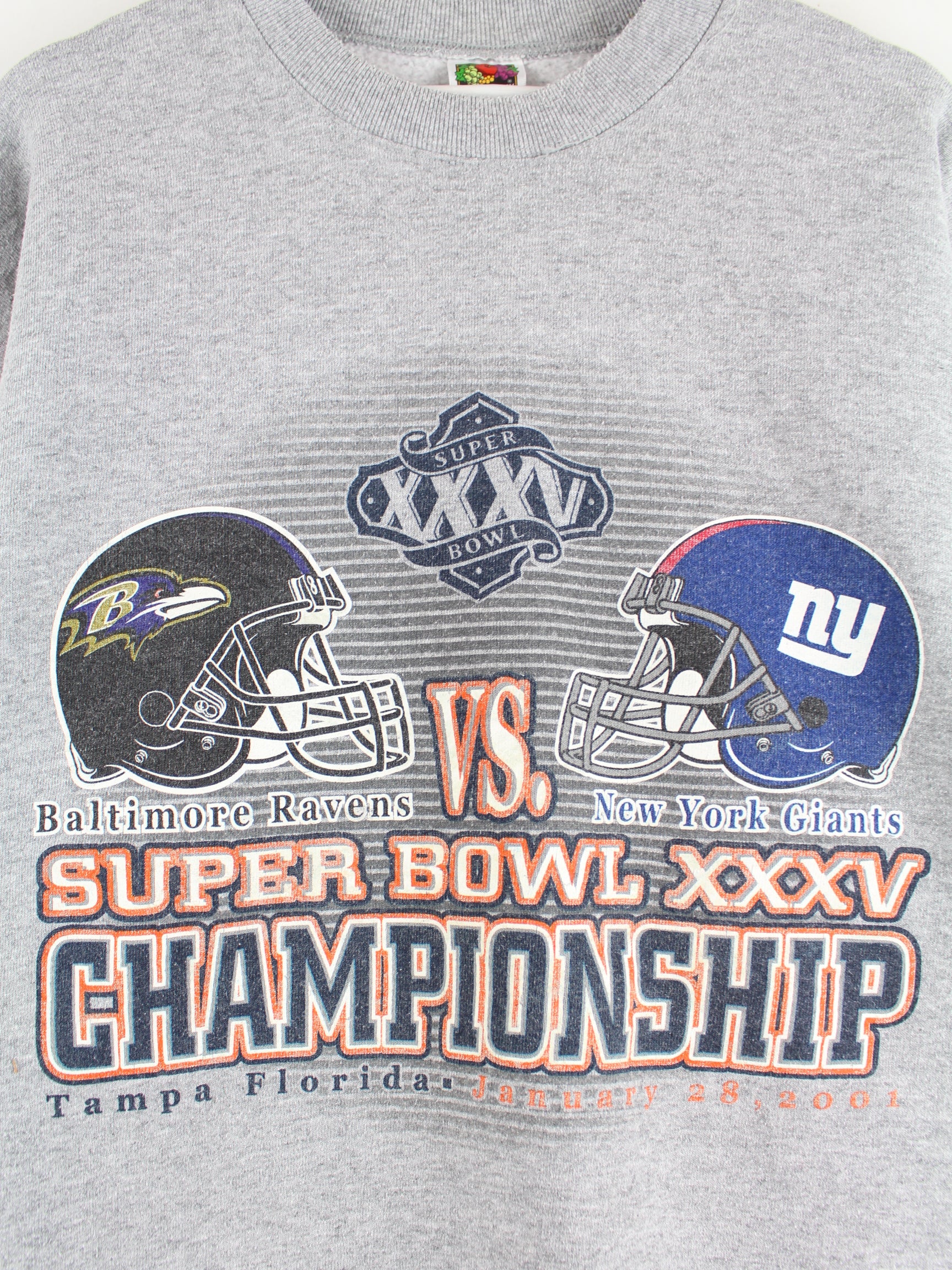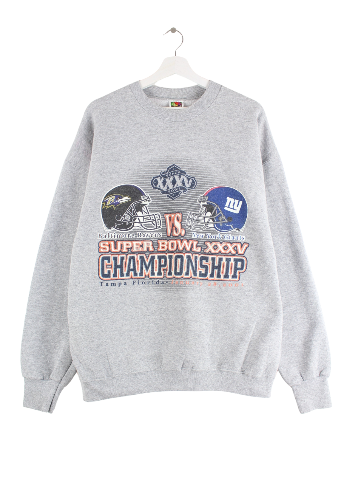 Gray sweater from the Fruit of the Loom label in size XL. It is made from a cotton blend and is in very good condition. With a rare Super Bowl Ravens vs. Giants print from 2001.