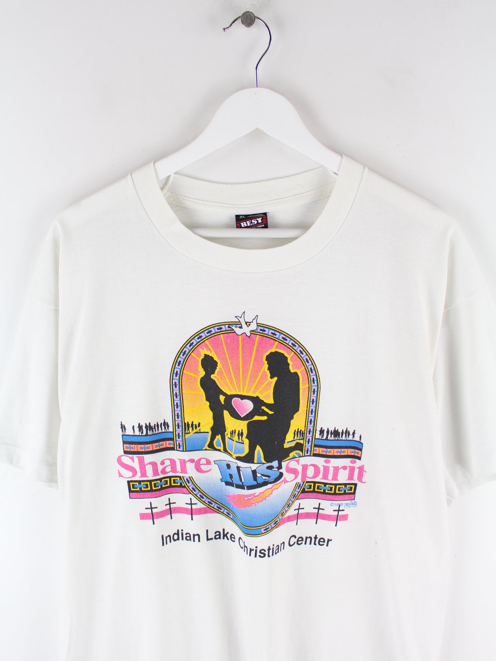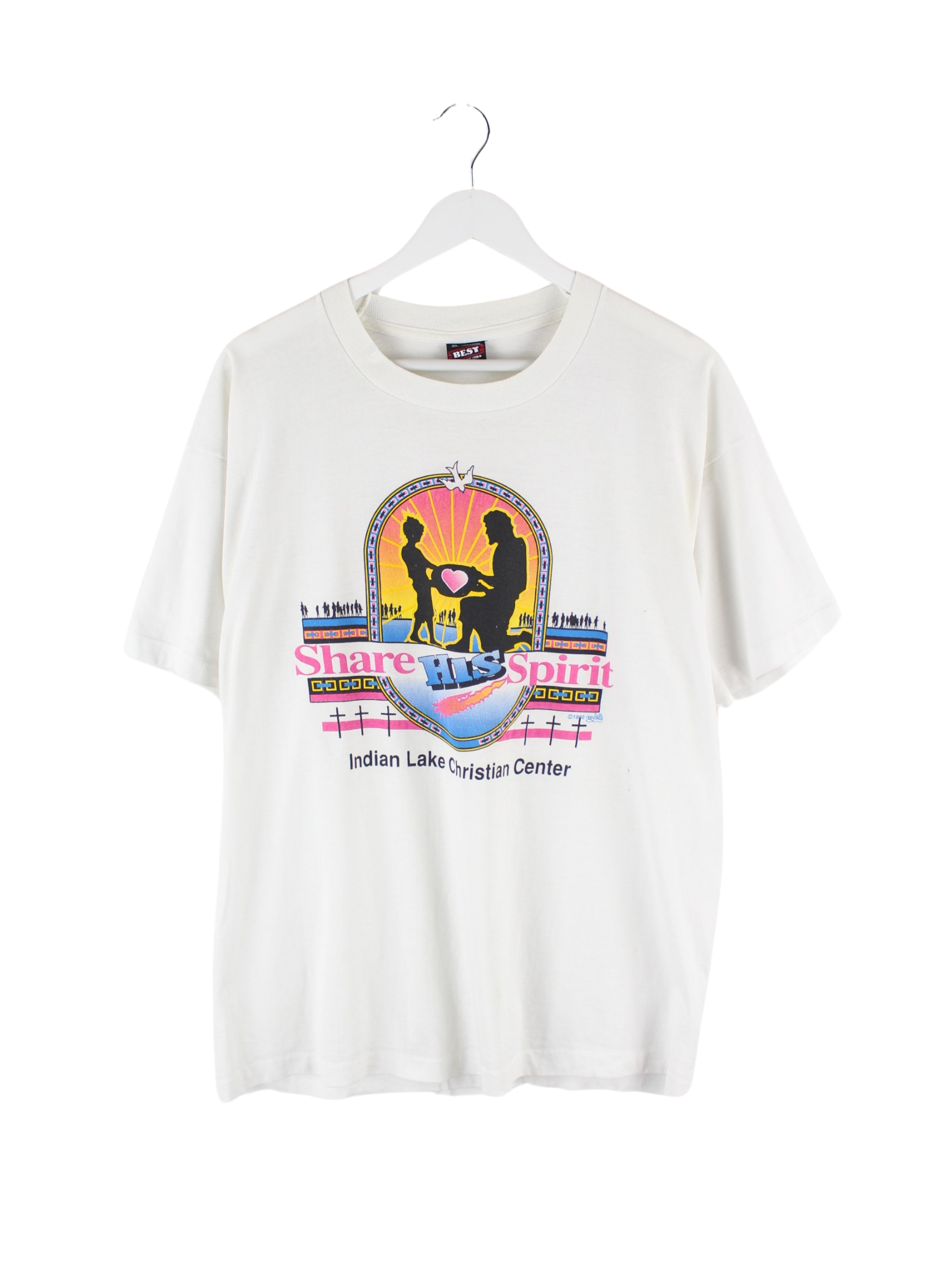 White T-shirt by Fruit of the Loom from the 90's in size XL. It is made of cotton and in good condition. With a rare stitch print.