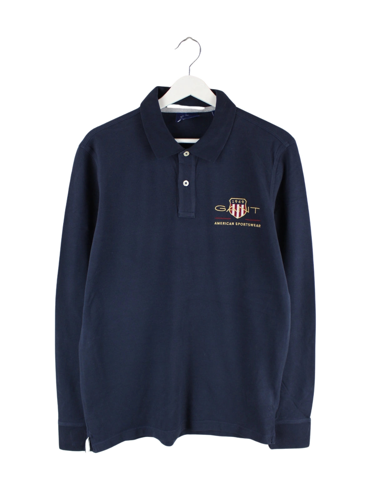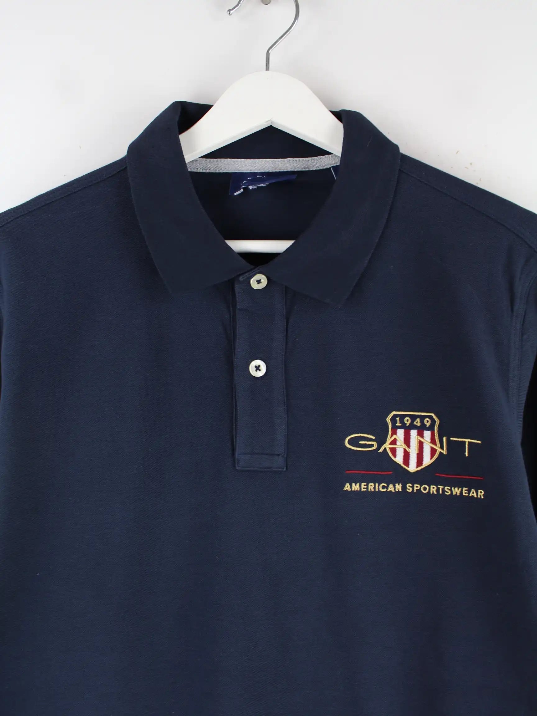 Blaues Poloshirt mit gestickten Motiven des Labels Gant in Größe M. Es ist aus Baumwolle gefertigt und in sehr gutem Zustand lieferbar.