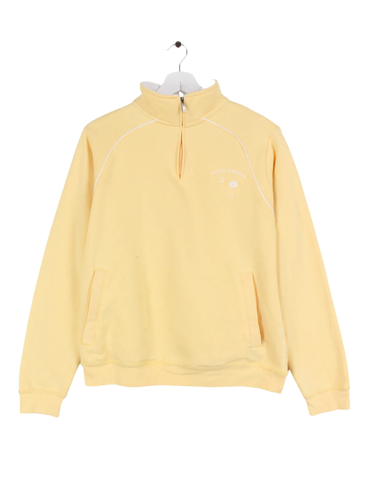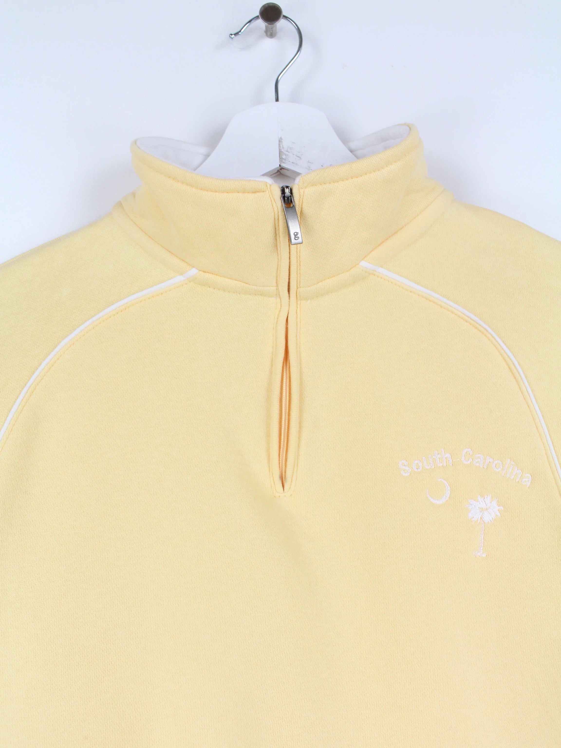 Yellow sweater with a small South Carolina print.