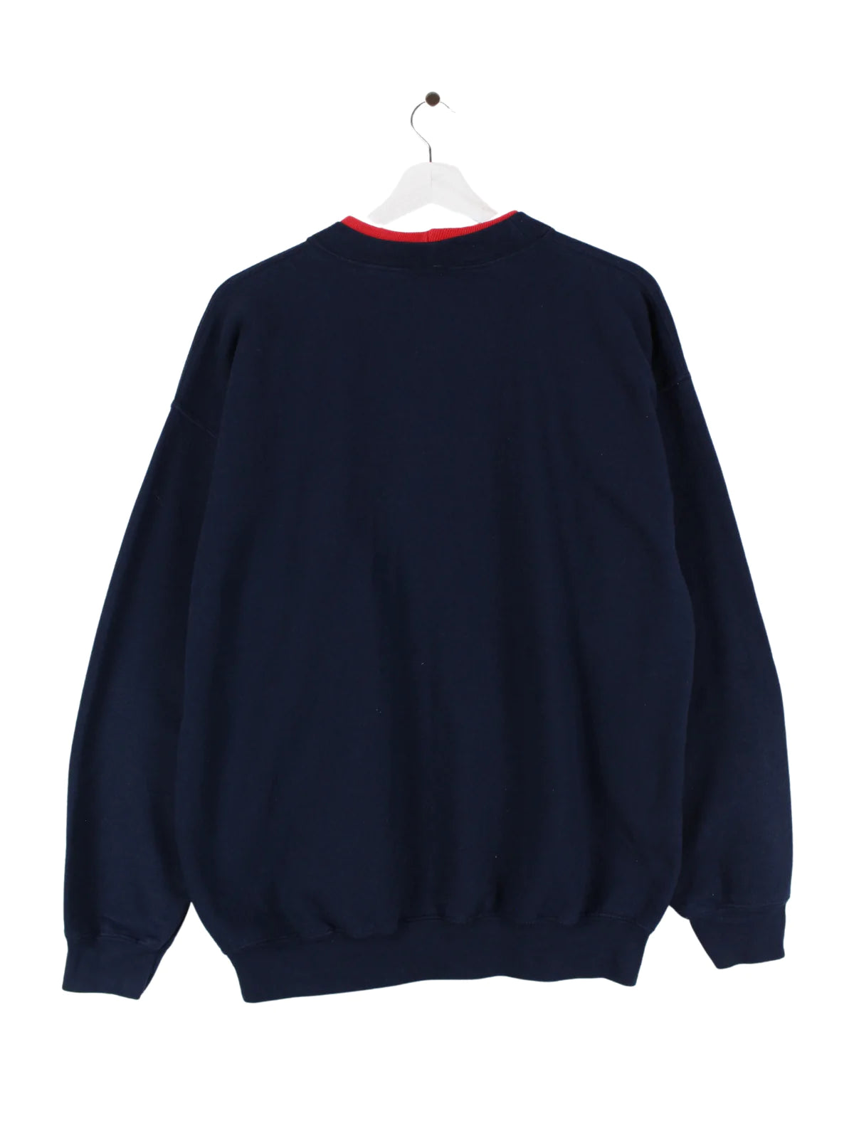 Blue sweater with a large embroidery on the front.
