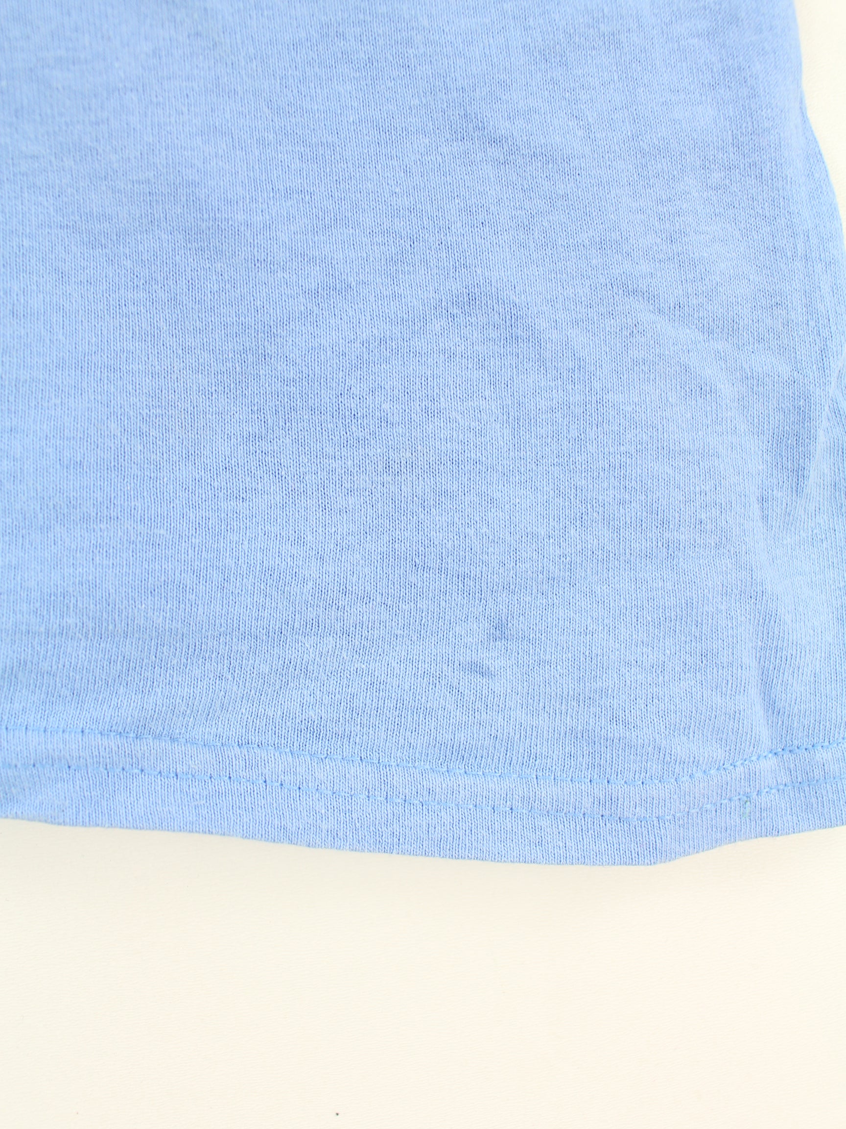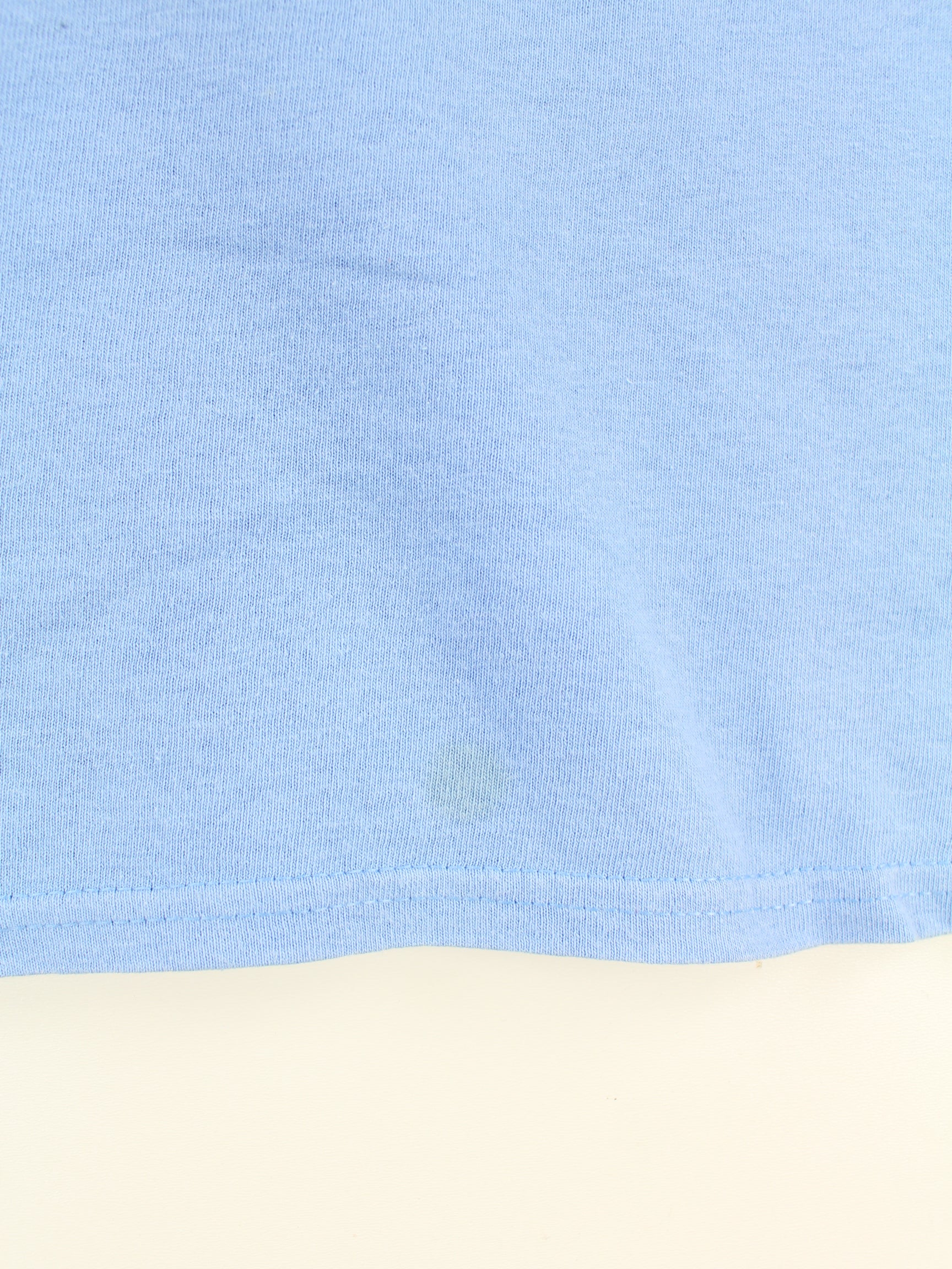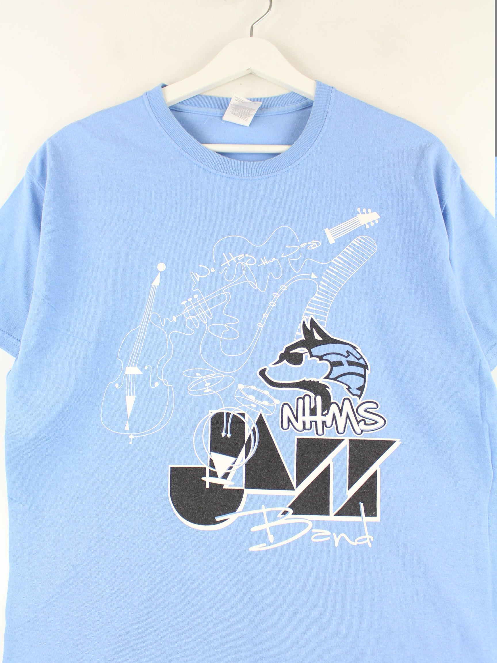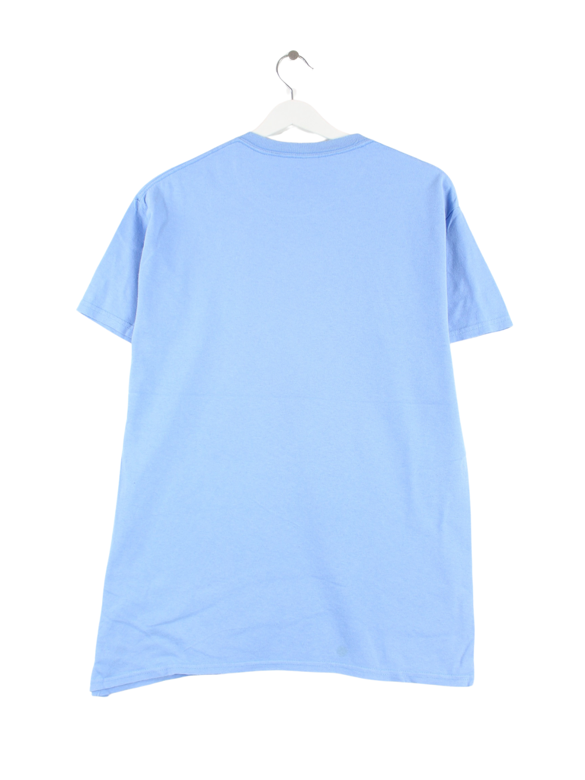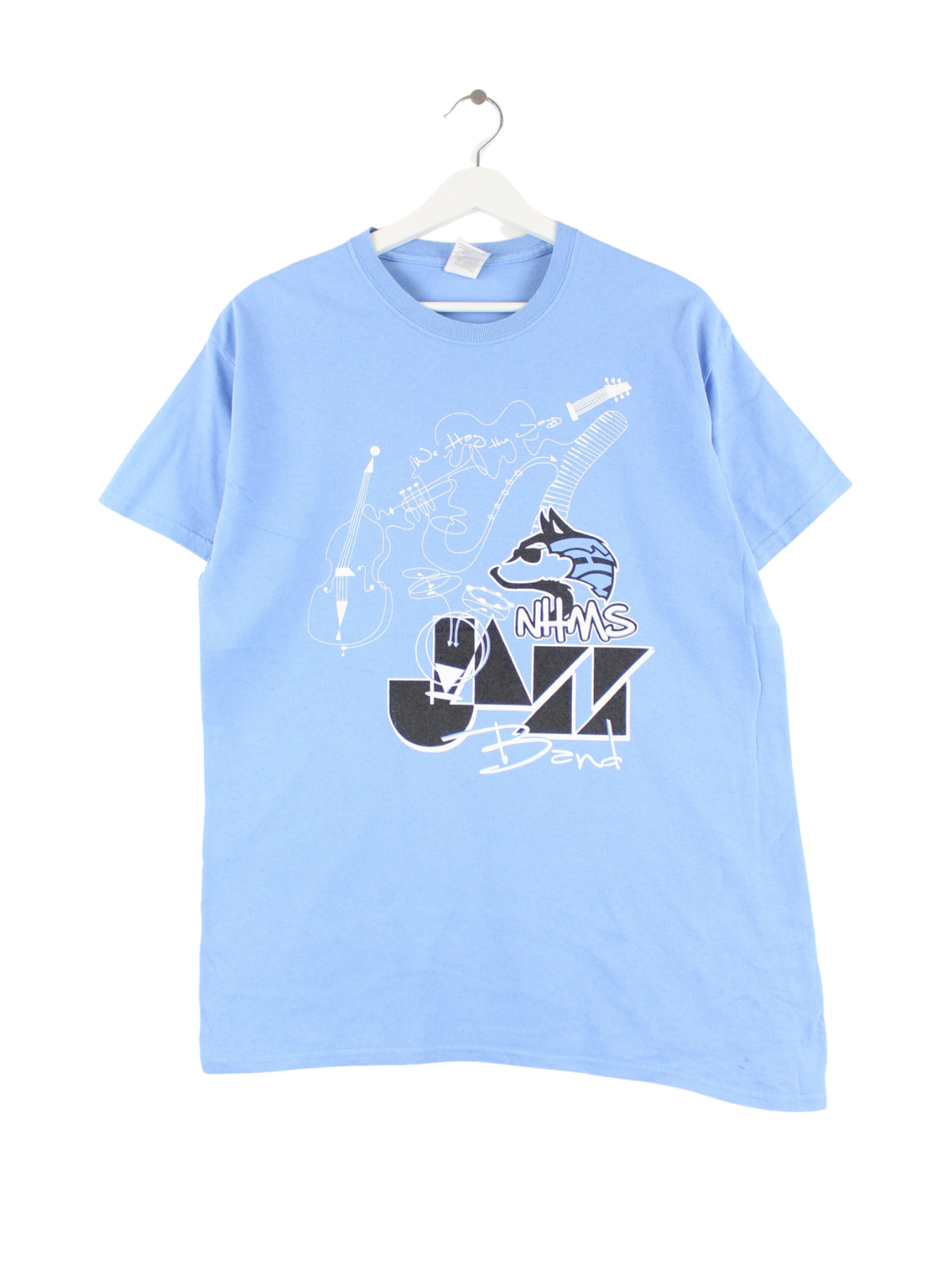 T-shirt from Gildan in size M. It is made of cotton and available in blue. With a chic band print.