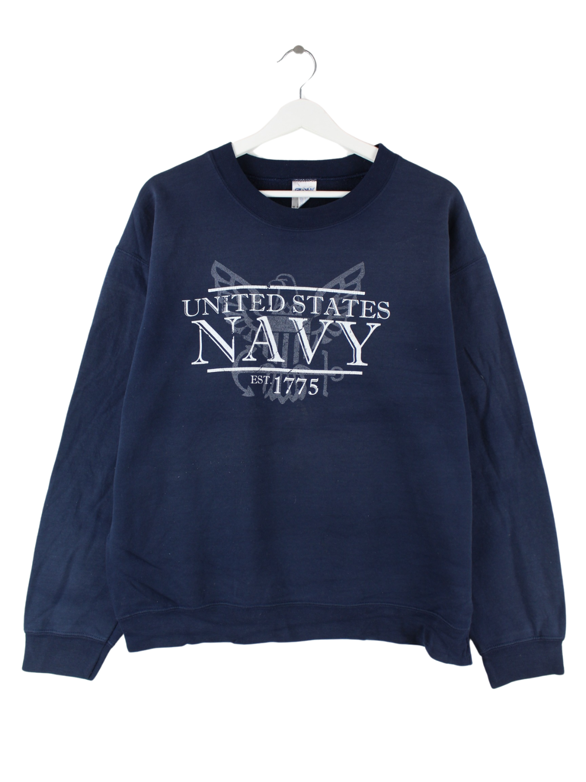 Sweater der Brand Gildan in Größe M. Er ist aus einer Baumwollmischung gemacht und in Blau bei uns vorrätig. Mit chiquem Navy Print.