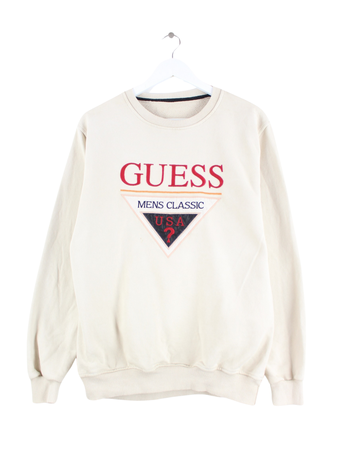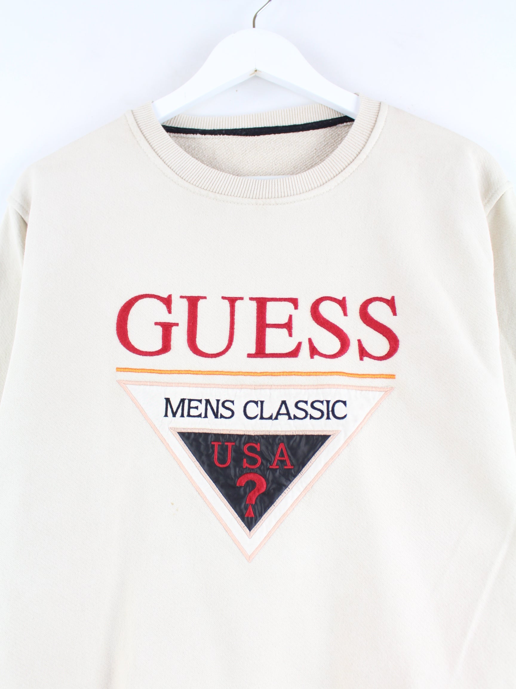 Sweater by Guess with embroidered logo in size M. It is made of a cotton blend and comes in beige.