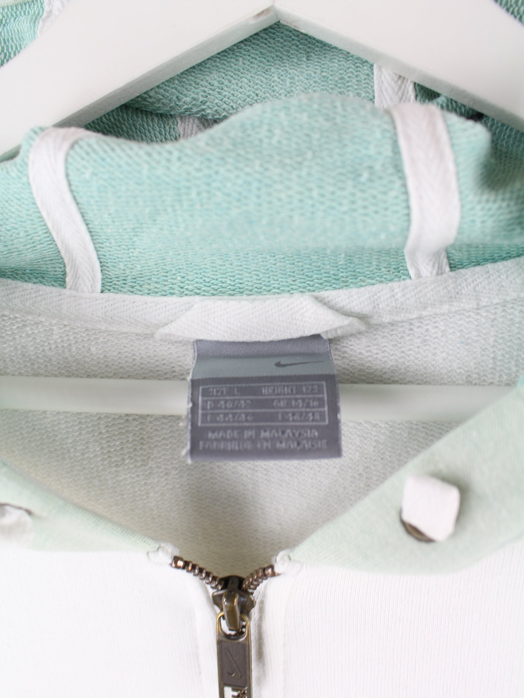 Weißer Hoodie mit gesticktem Logo und langem Reißverschluß der Marke Nike in Größe L. Er ist aus einer Baumwollmischung gemacht und in sehr gutem Zustand auf Lager.