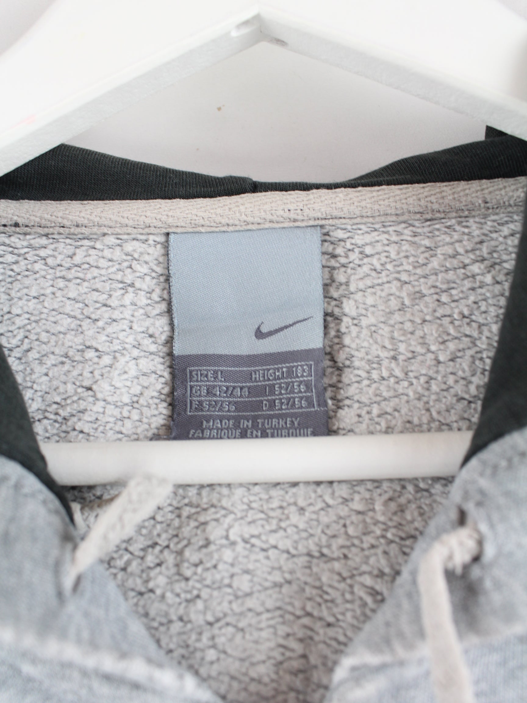 Gray hoodie with embroidered logo and full-length zipper from Nike from the early 2000s in size L. It is made of a cotton blend and in good condition in stock.