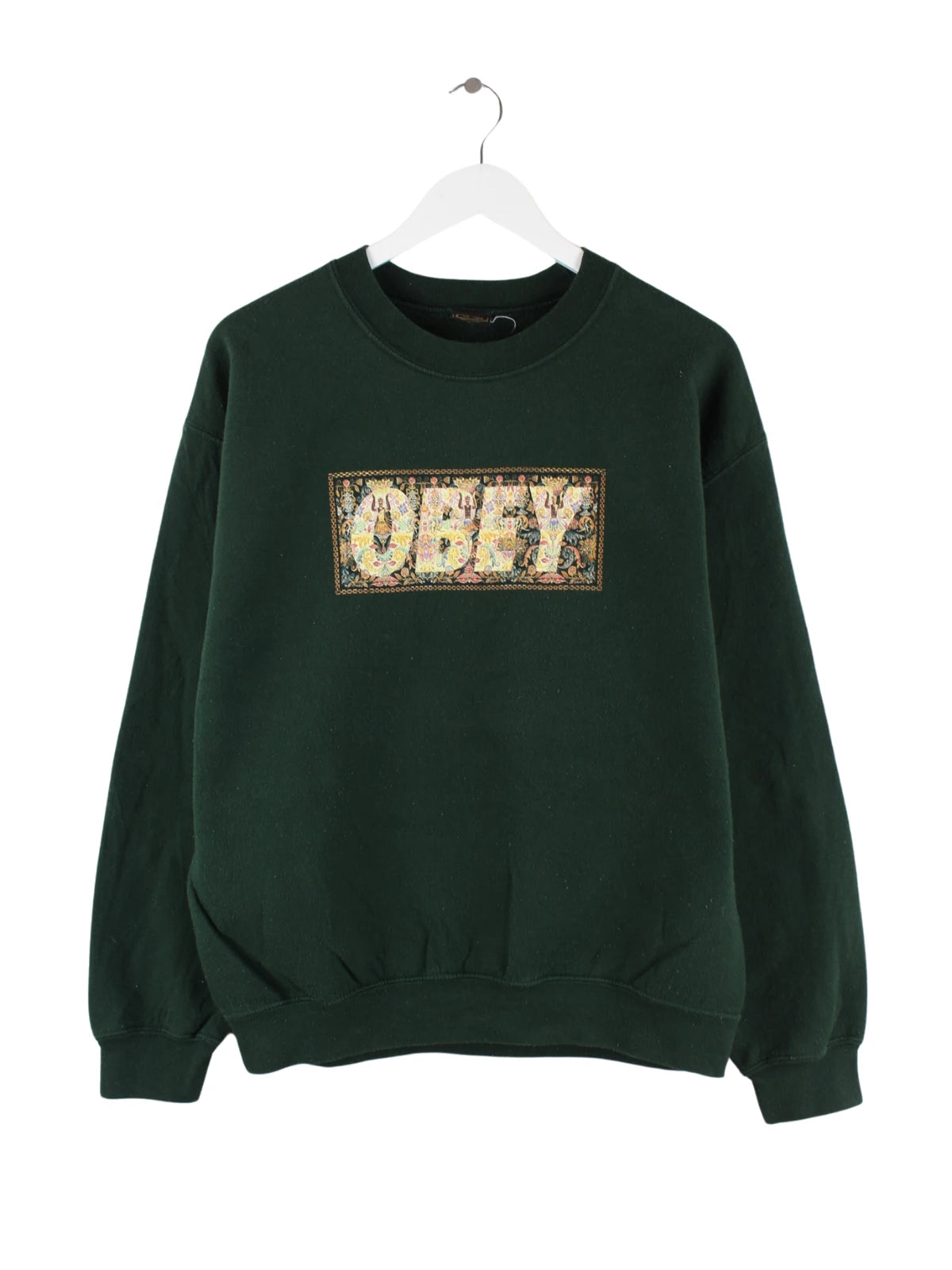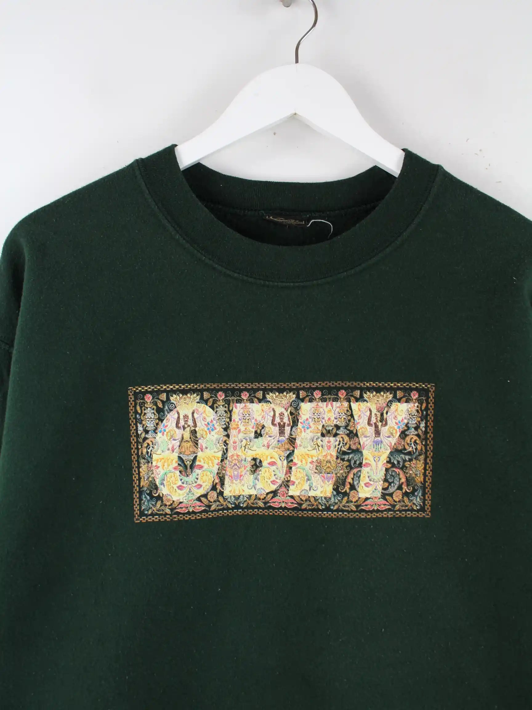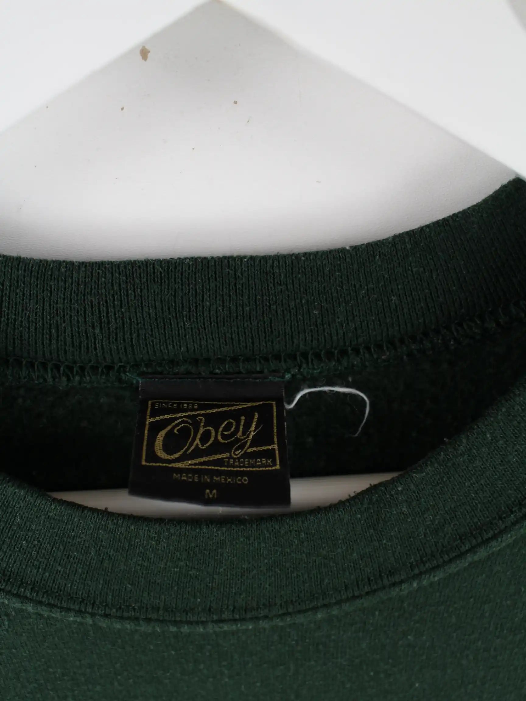 Grüner Sweater vom Label Obey in Größe M. Er ist aus einer Baumwollmischung angefertigt und in sehr gutem Zustand bei uns zu bekommen. Mit tollem 00s Print.