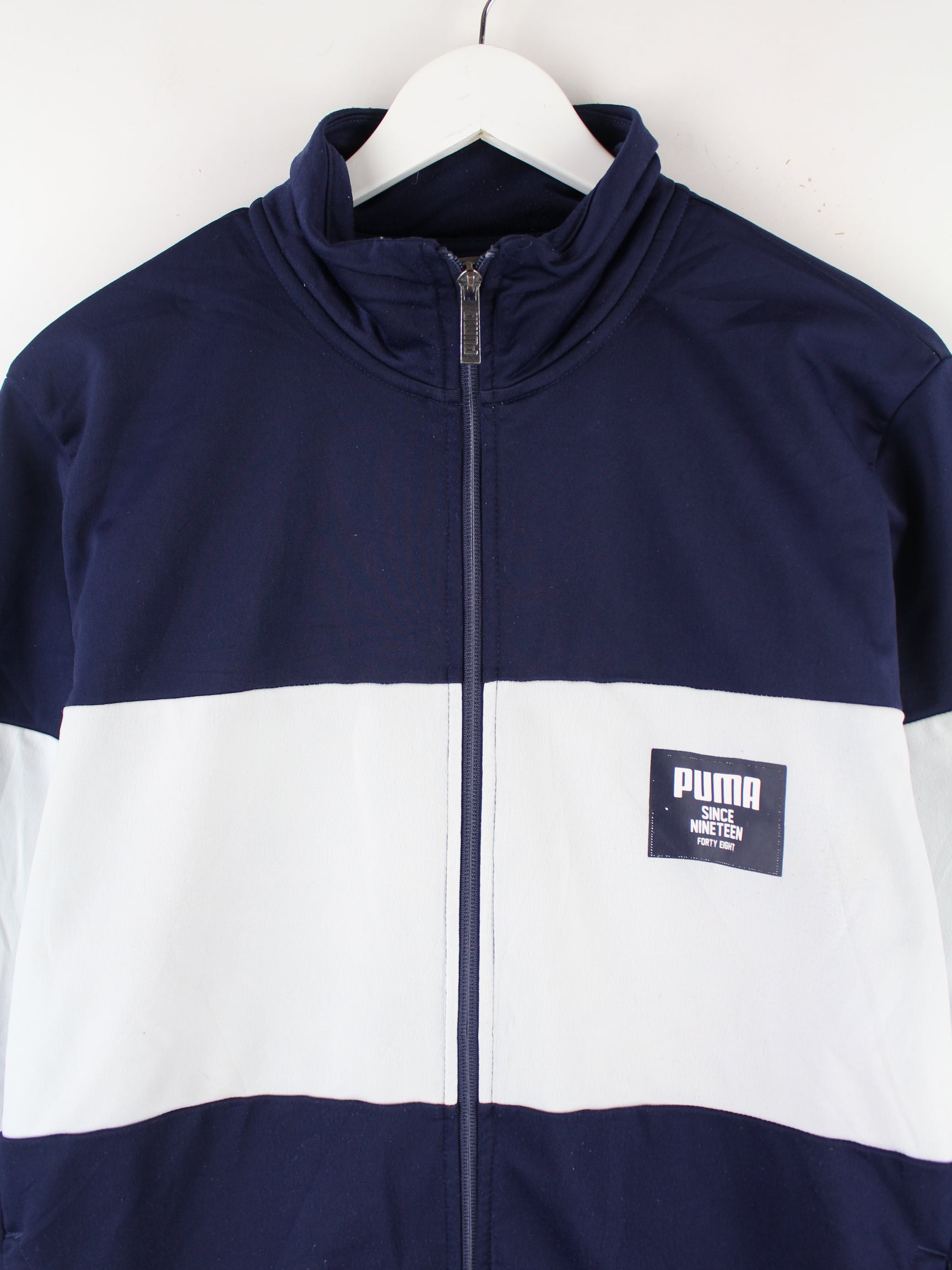 Blaue Trainingsjacke vom Label Puma in Größe L. Sie ist aus Synthetik produziert und in gutem Zustand vorrätig.