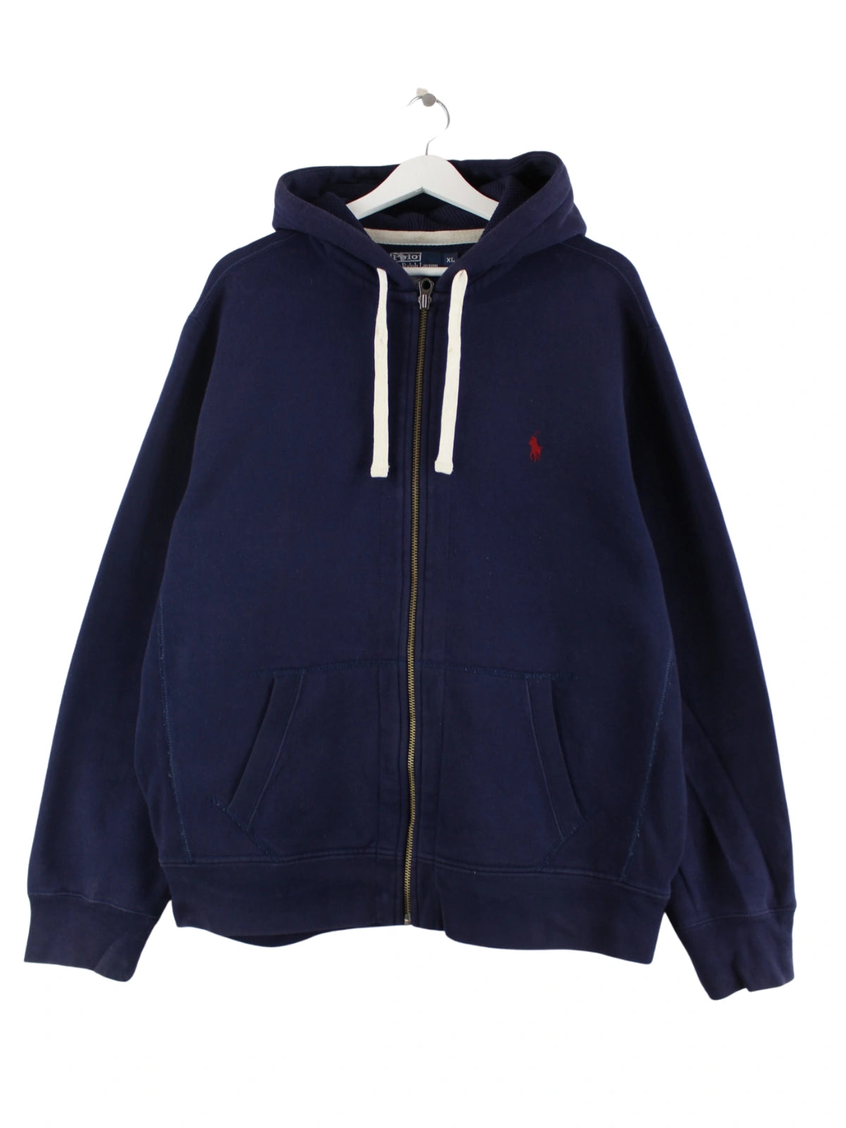 Blauer Hoodie mit durchgehendem Reißverschluß des Labels Ralph Lauren in Größe XL. Er ist aus einer Baumwollmischung und in sehr gutem Zustand vorrätig.