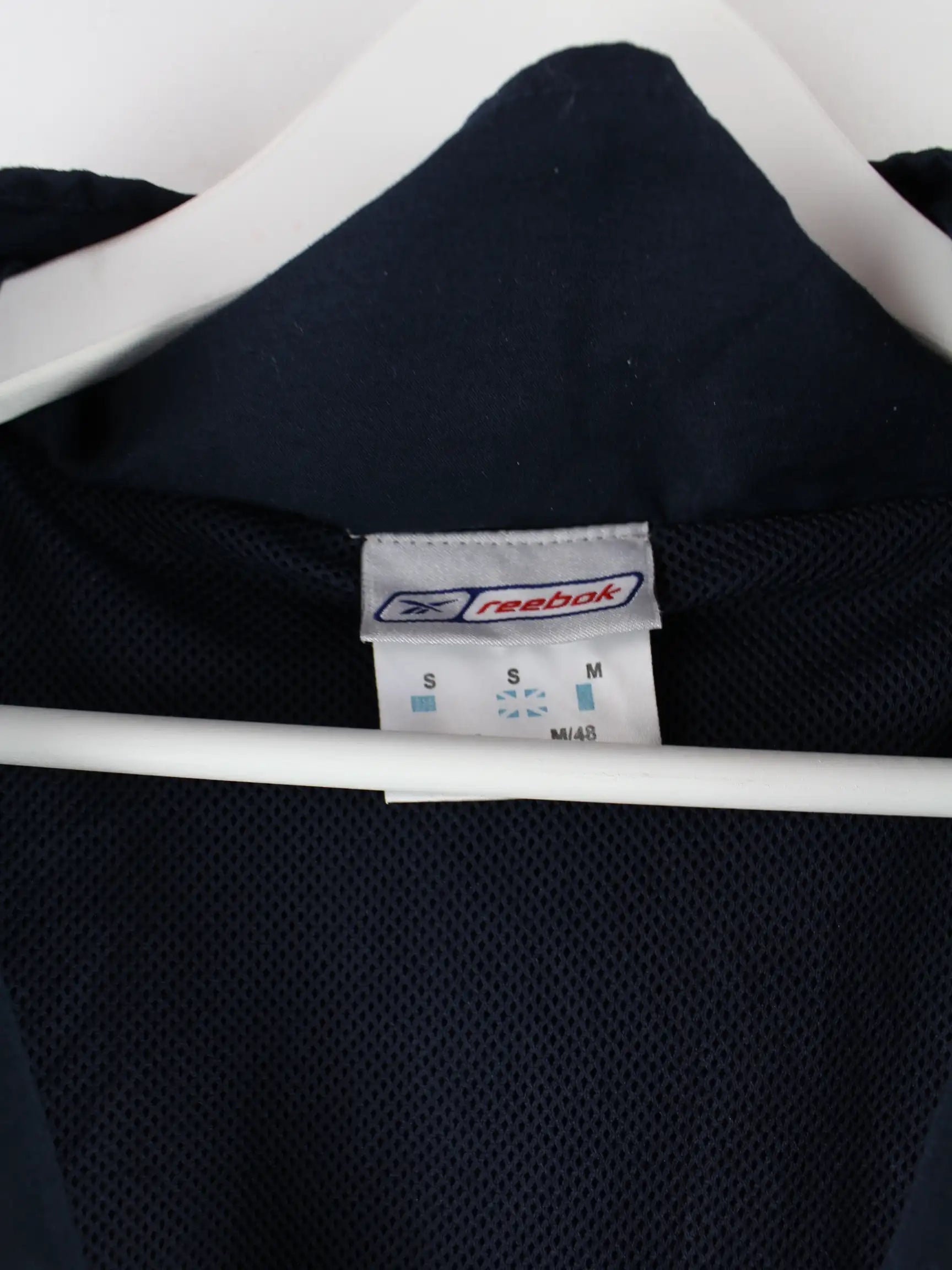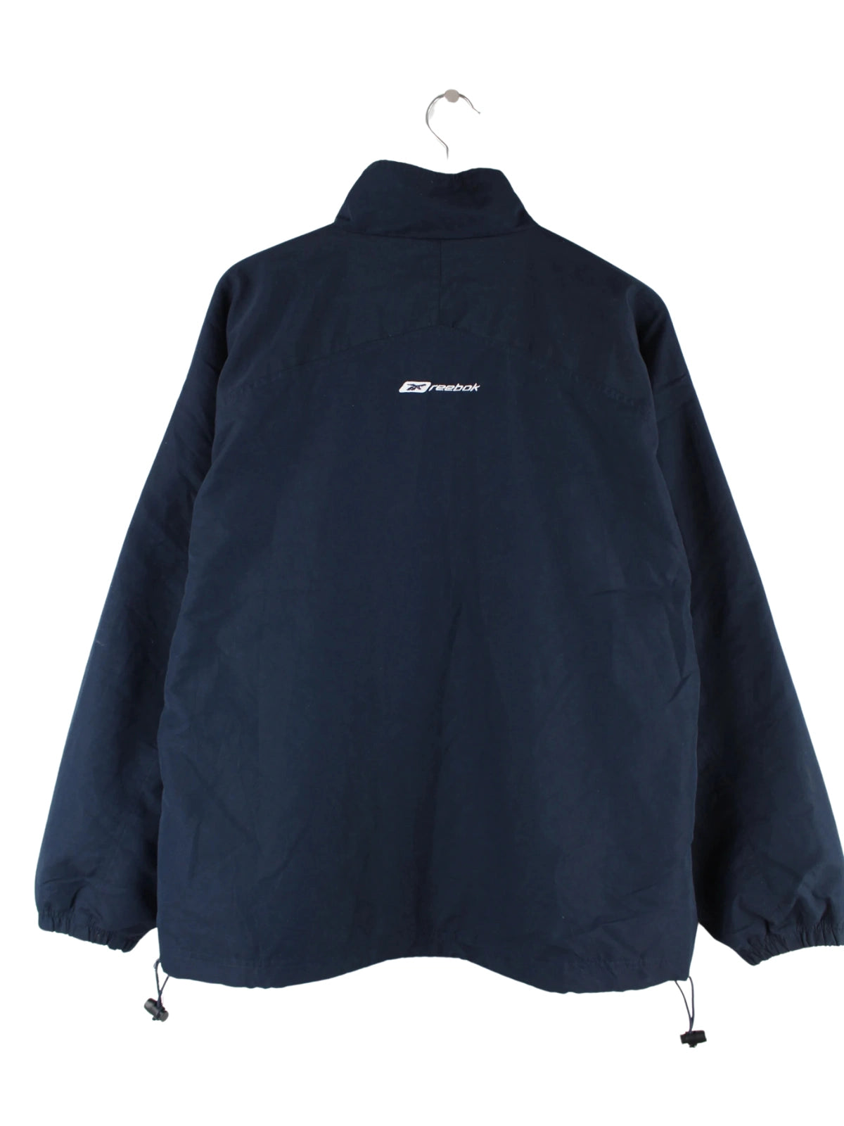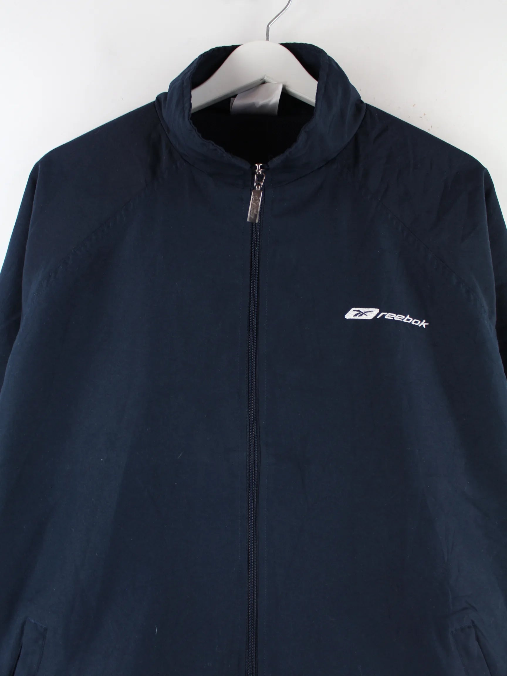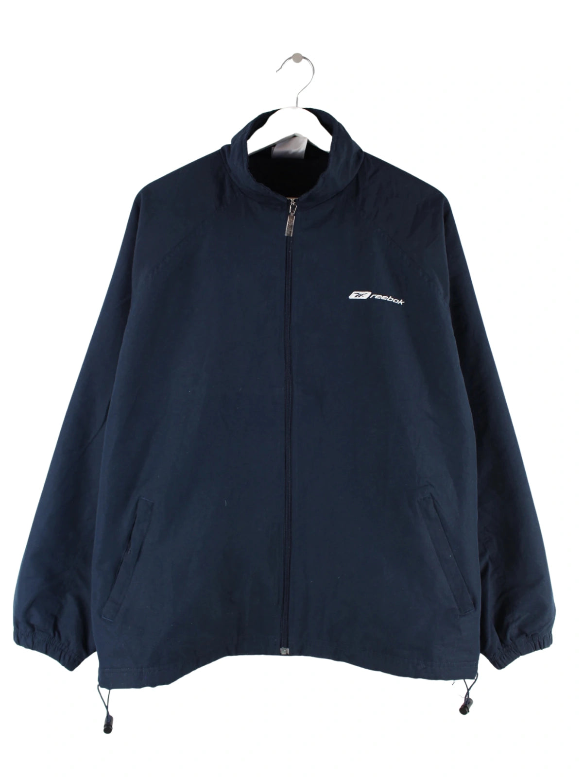 Blaue Trainingsjacke der Brand Reebok in Größe L. Sie ist aus Synthetik angefertigt und in sehr gutem Zustand bei uns zu bekommen.