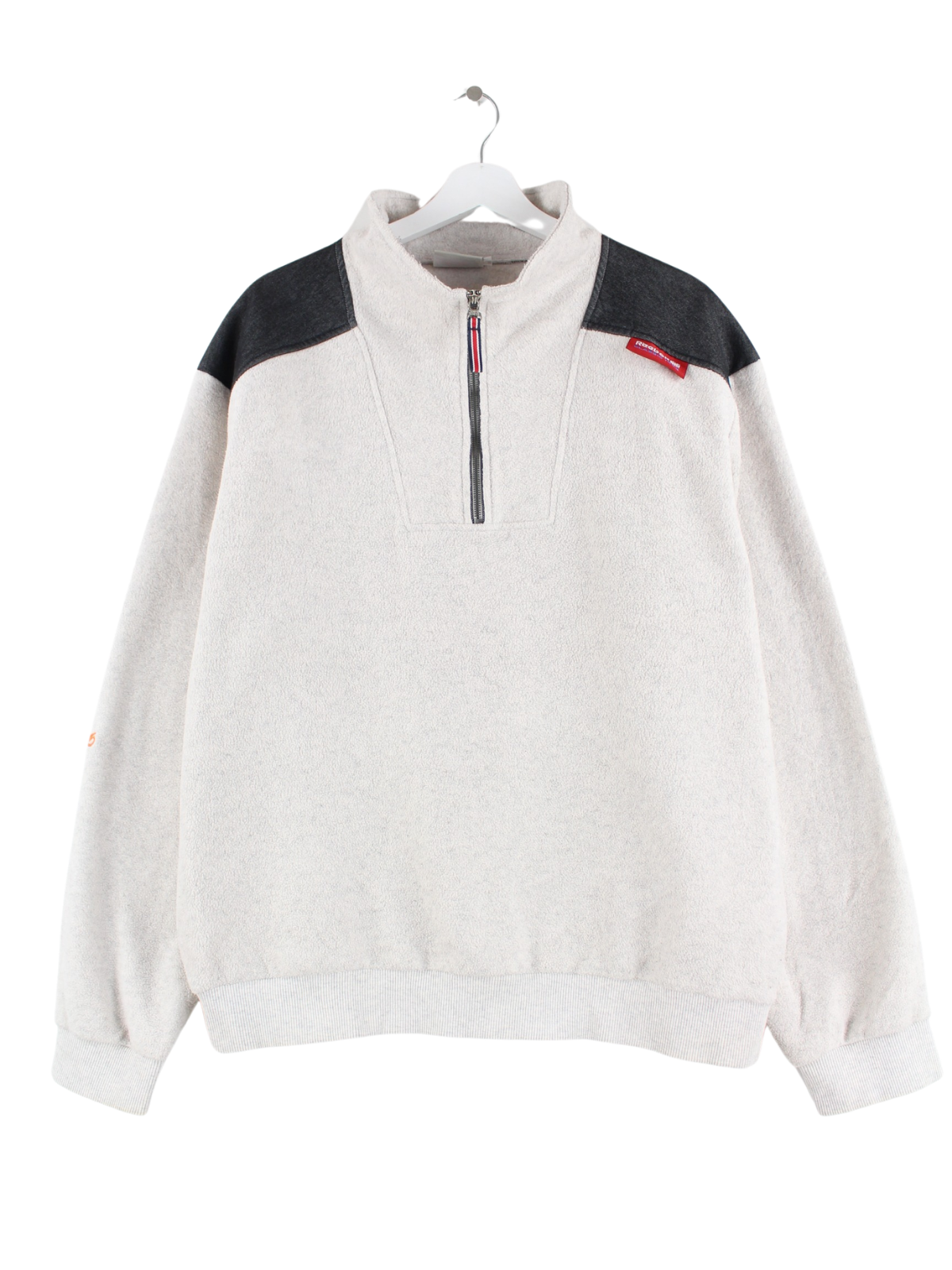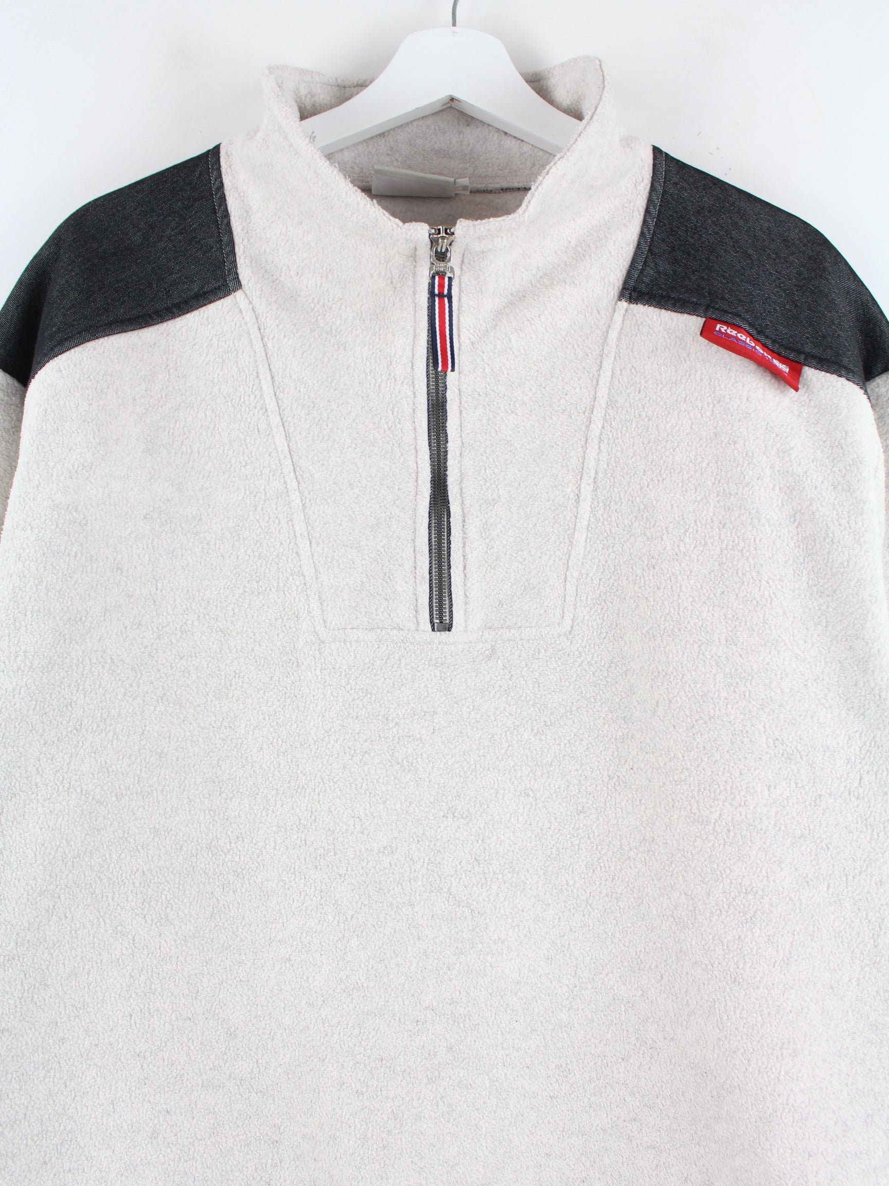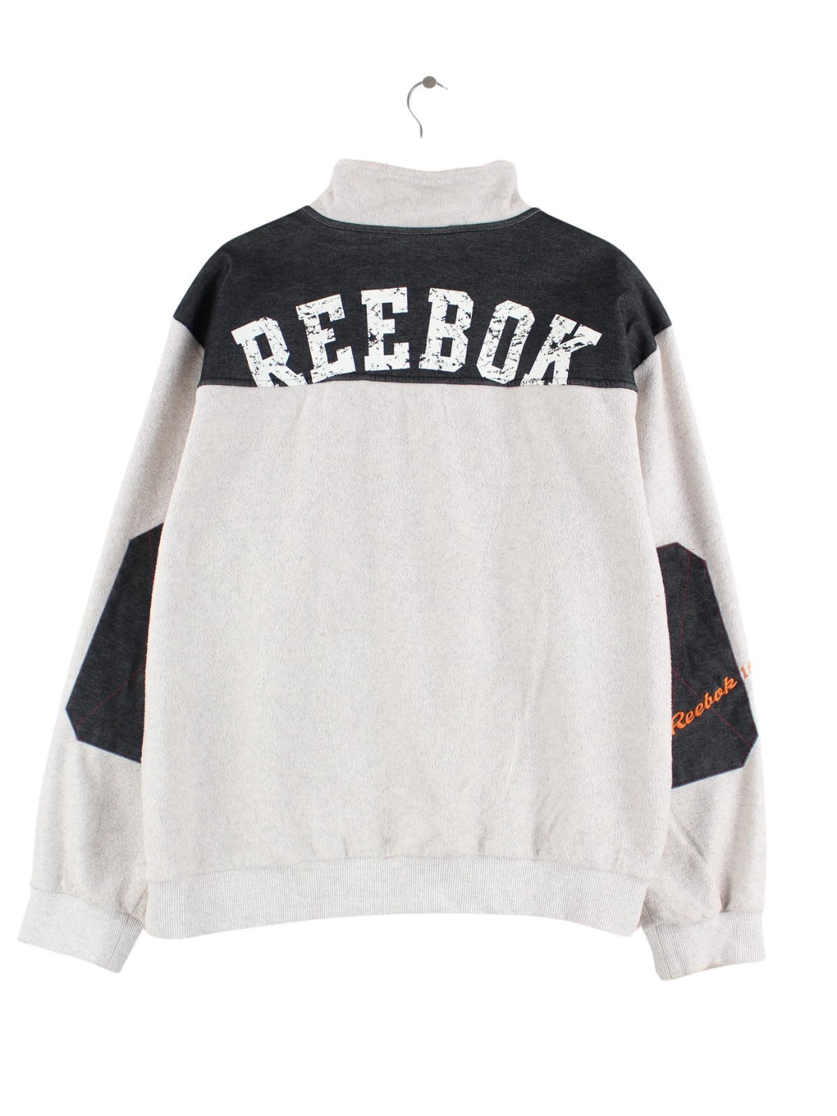 Grauer Sweater mit half Zip vom Brand Reebok in Größe XL. Er ist aus kuscheligem Fleece und in sehr gutem Zustand bei uns vorrätig. Mit schönem undefined Print.