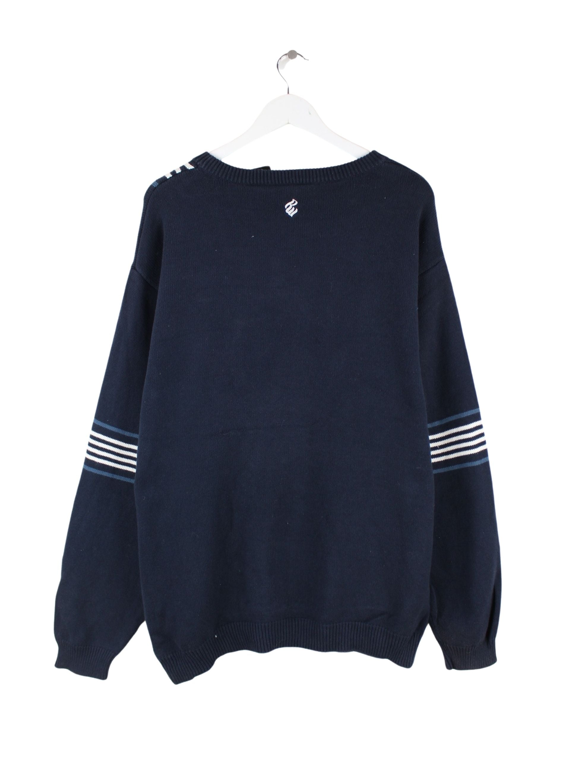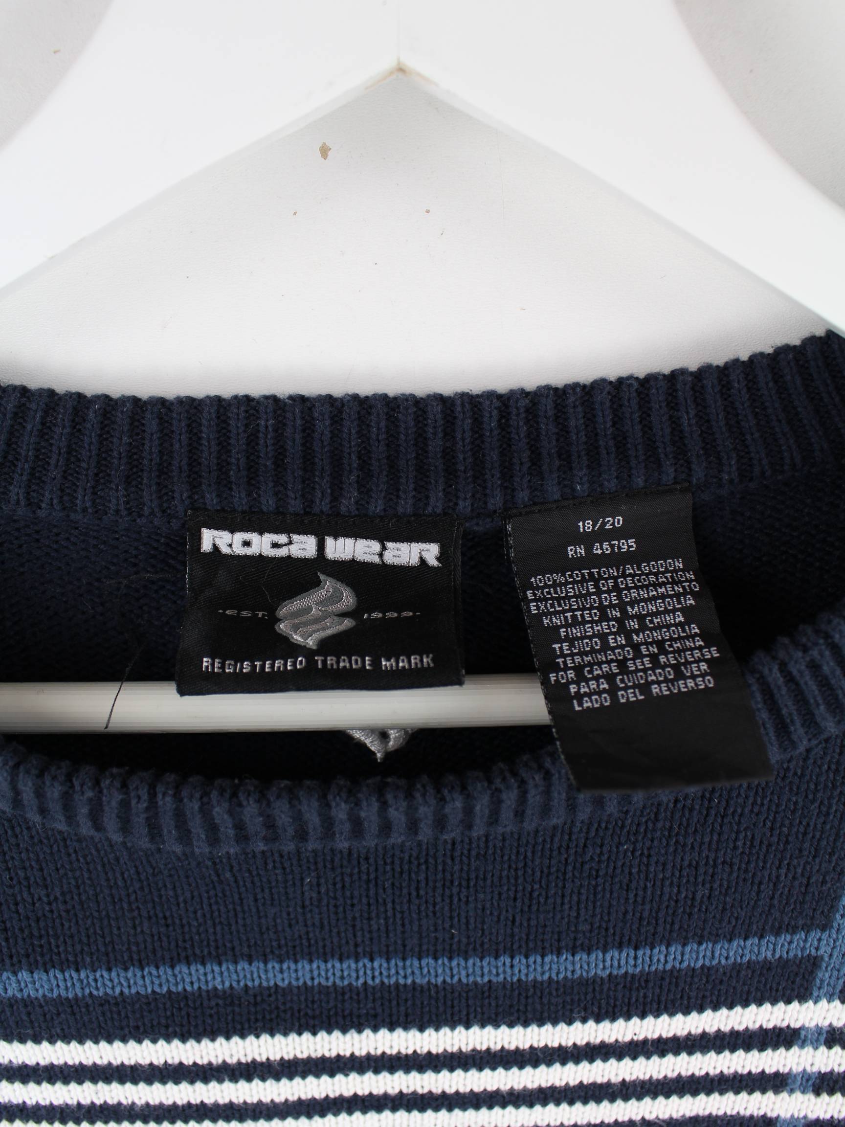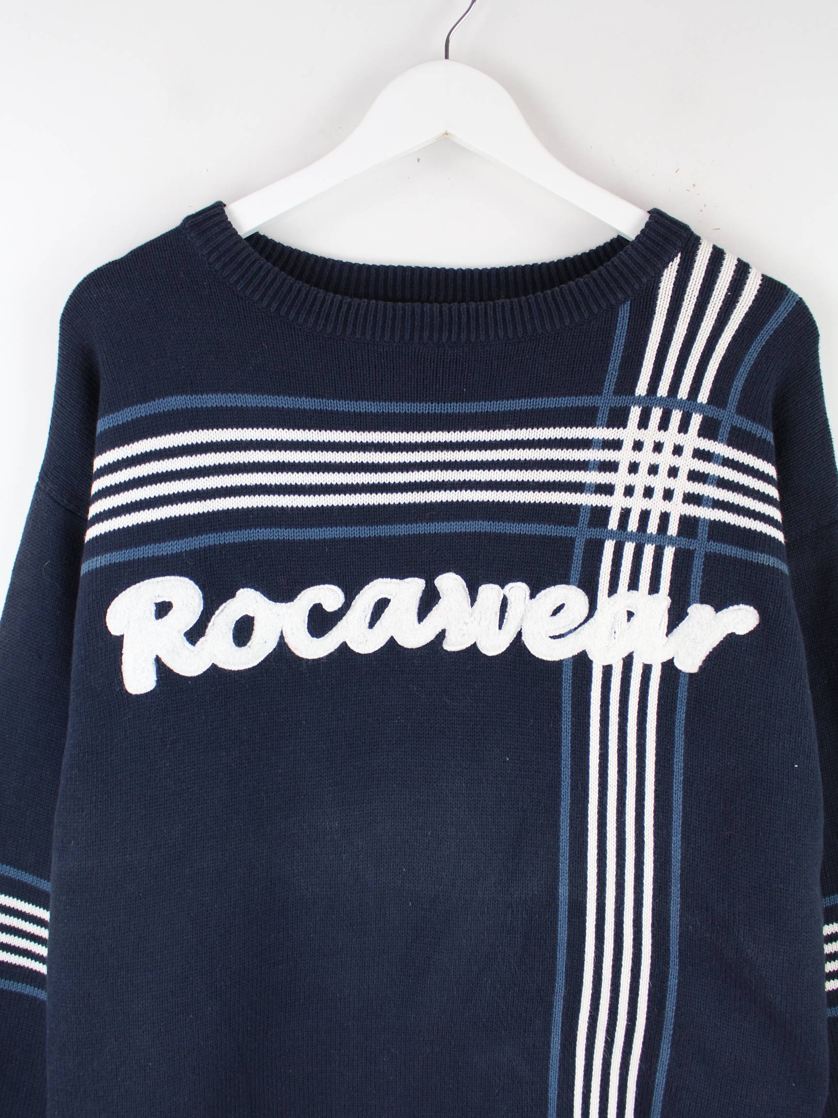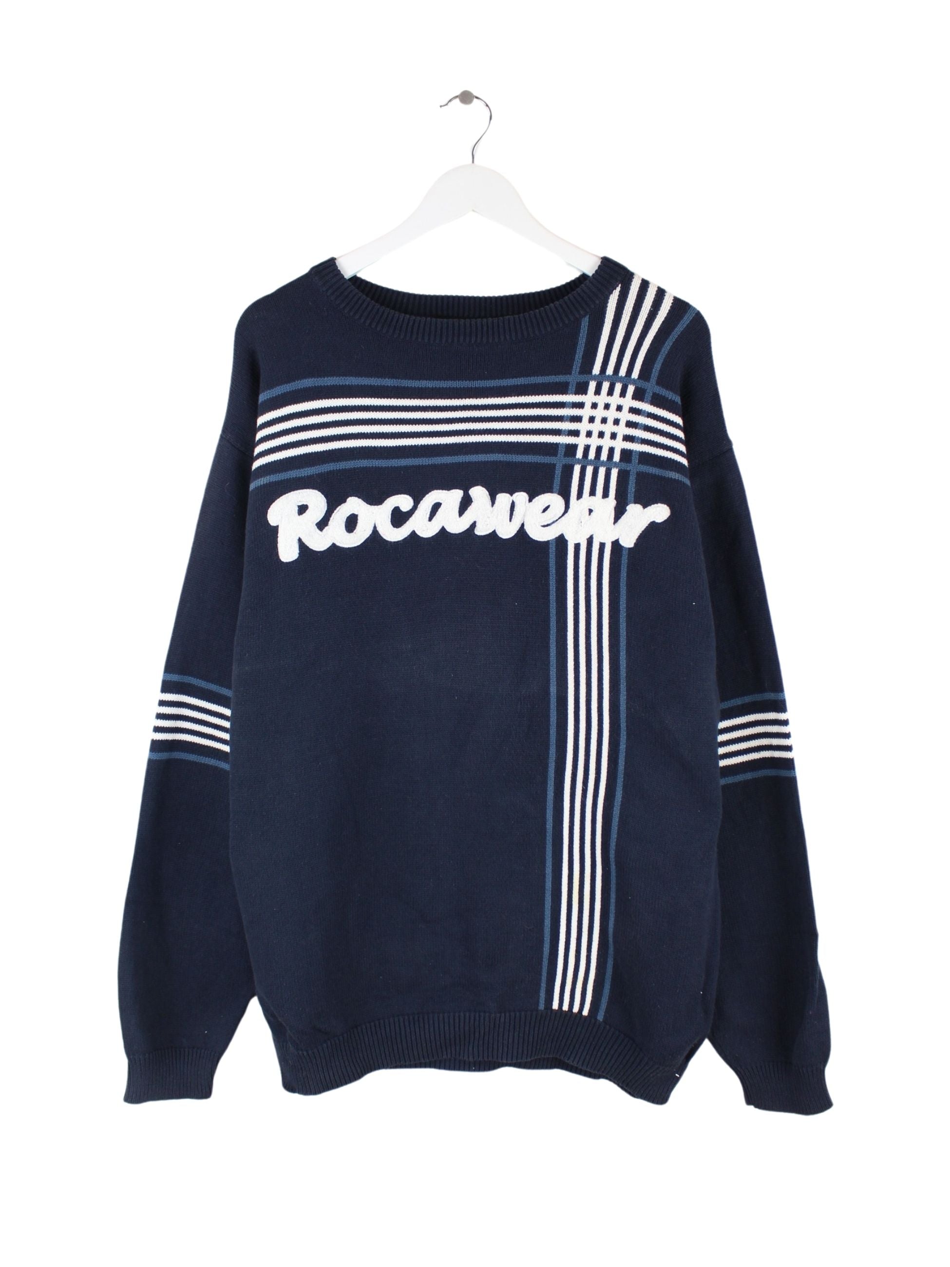 Blauer Pullover mit gesticktem Logo der Marke Roca Wear in Größe XL. Er ist aus Baumwolle produziert und in gutem Zustand zu bekommen.