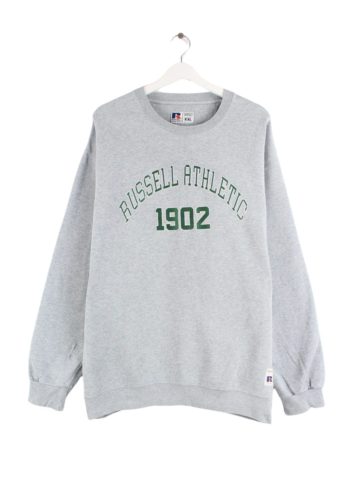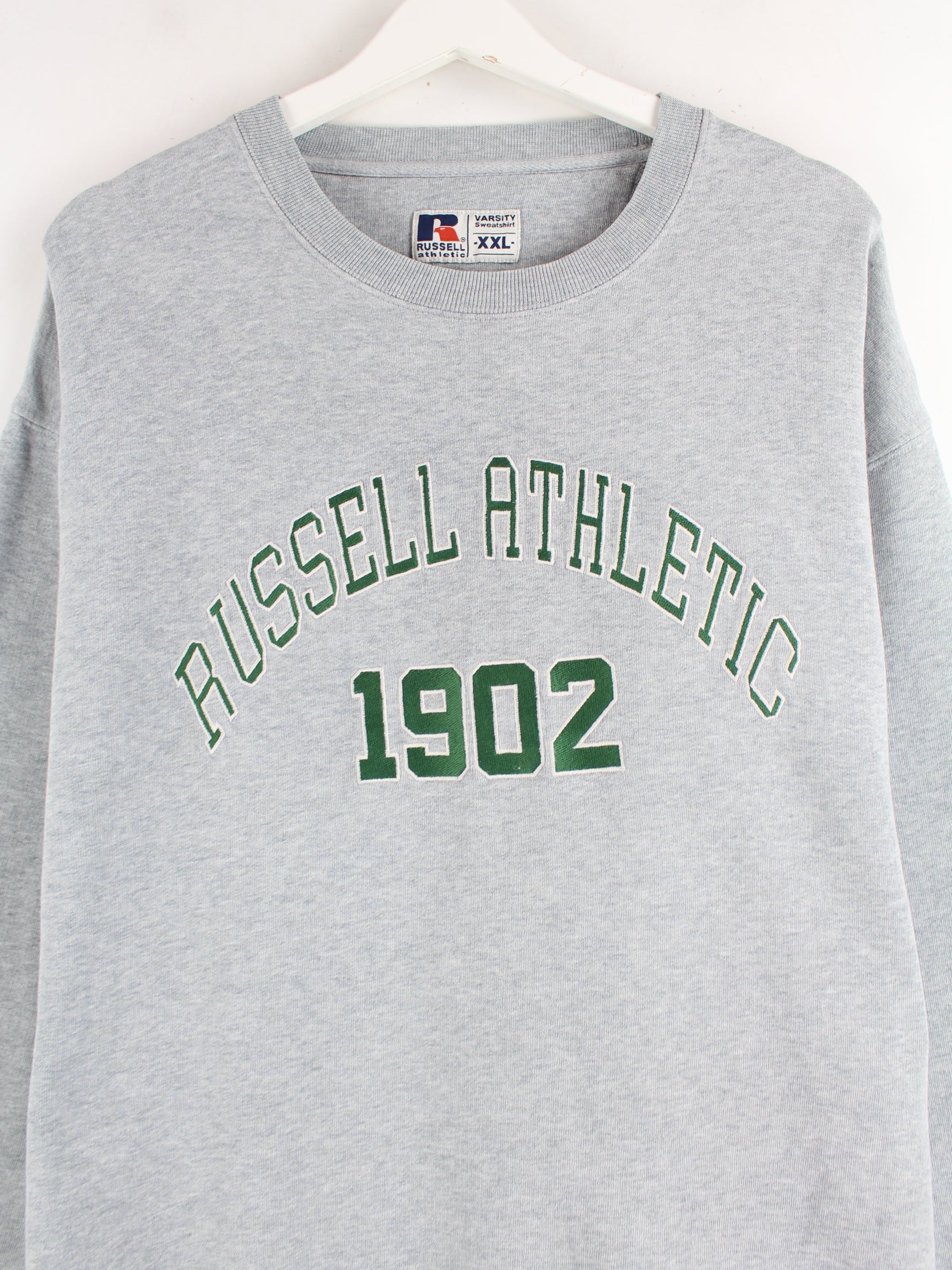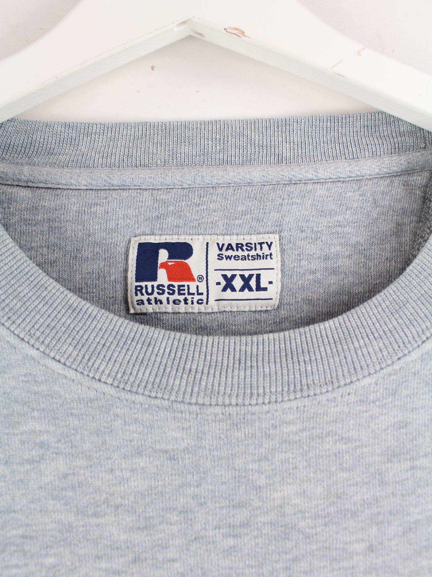 Grey sweater with embroidery from the brand Russell Athletic in size XXL. It is made from a cotton blend and is in very good condition.
