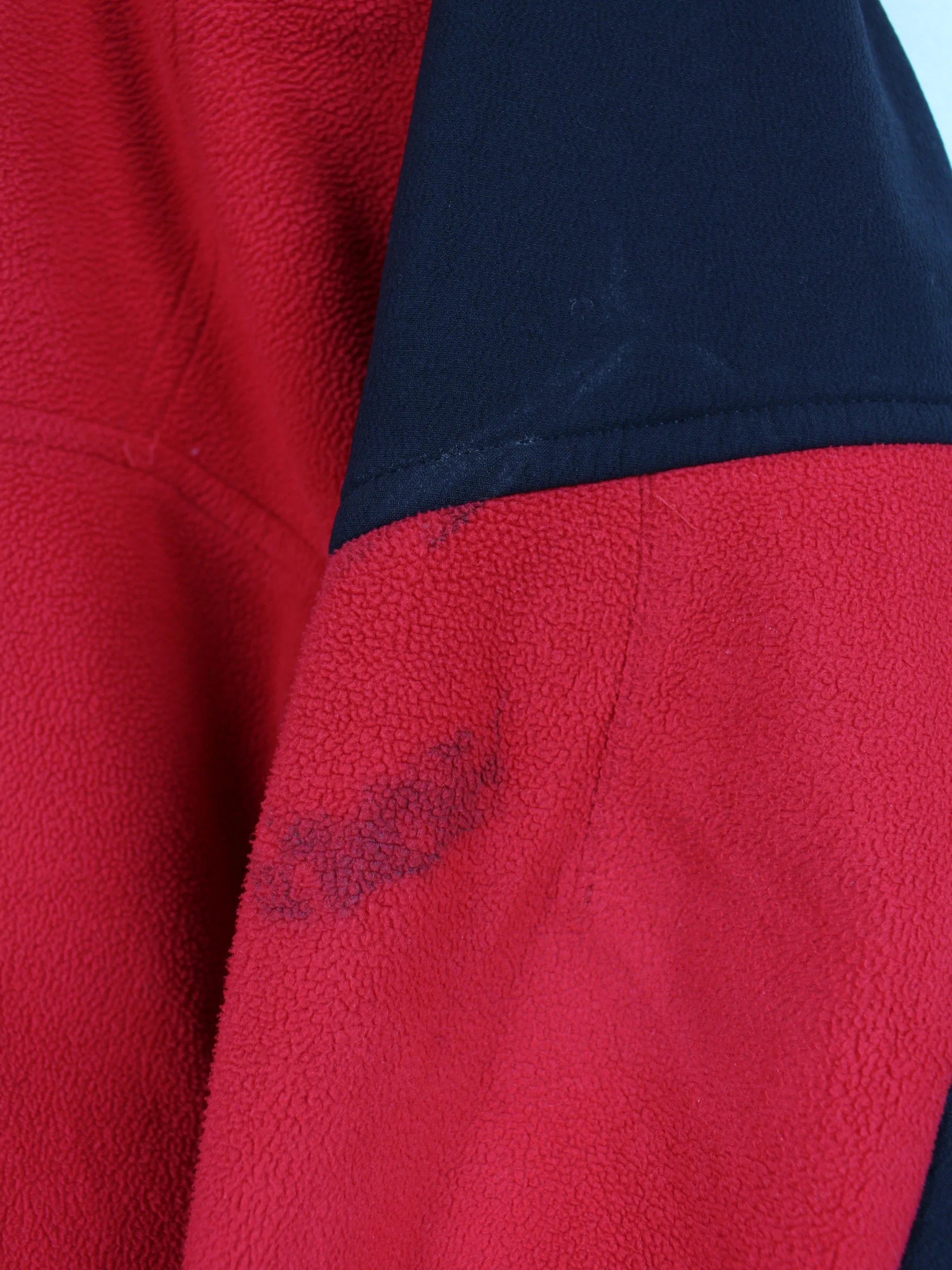 Defects: Has a large stain on the sleeve and a small one on the front (see pictures)