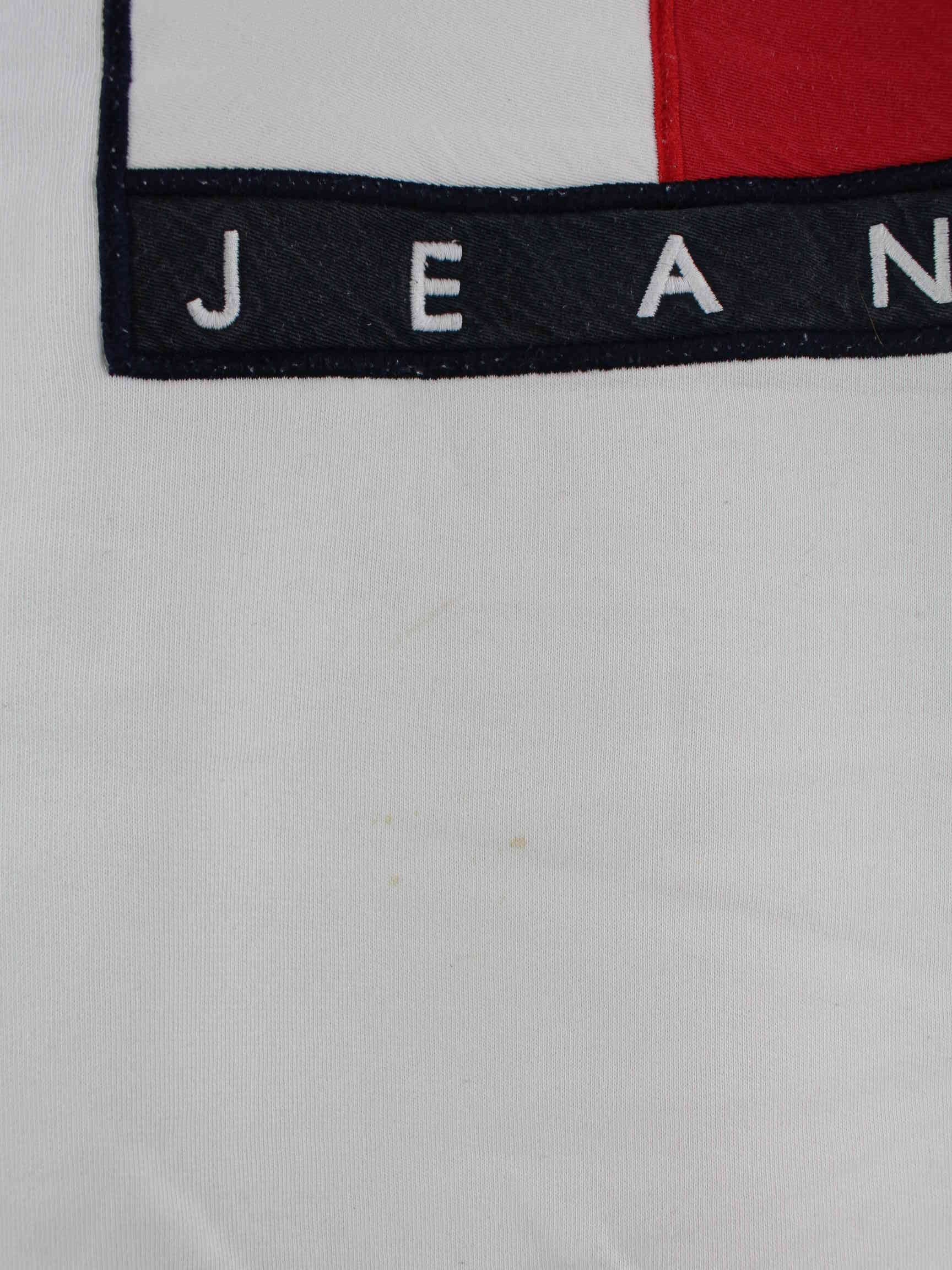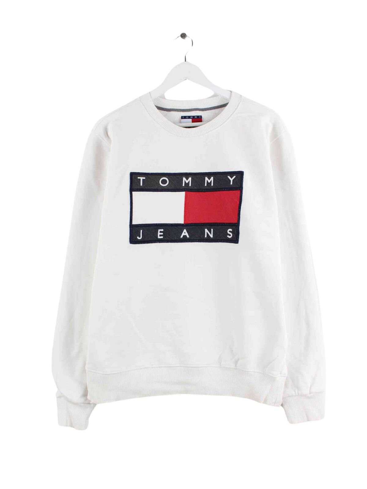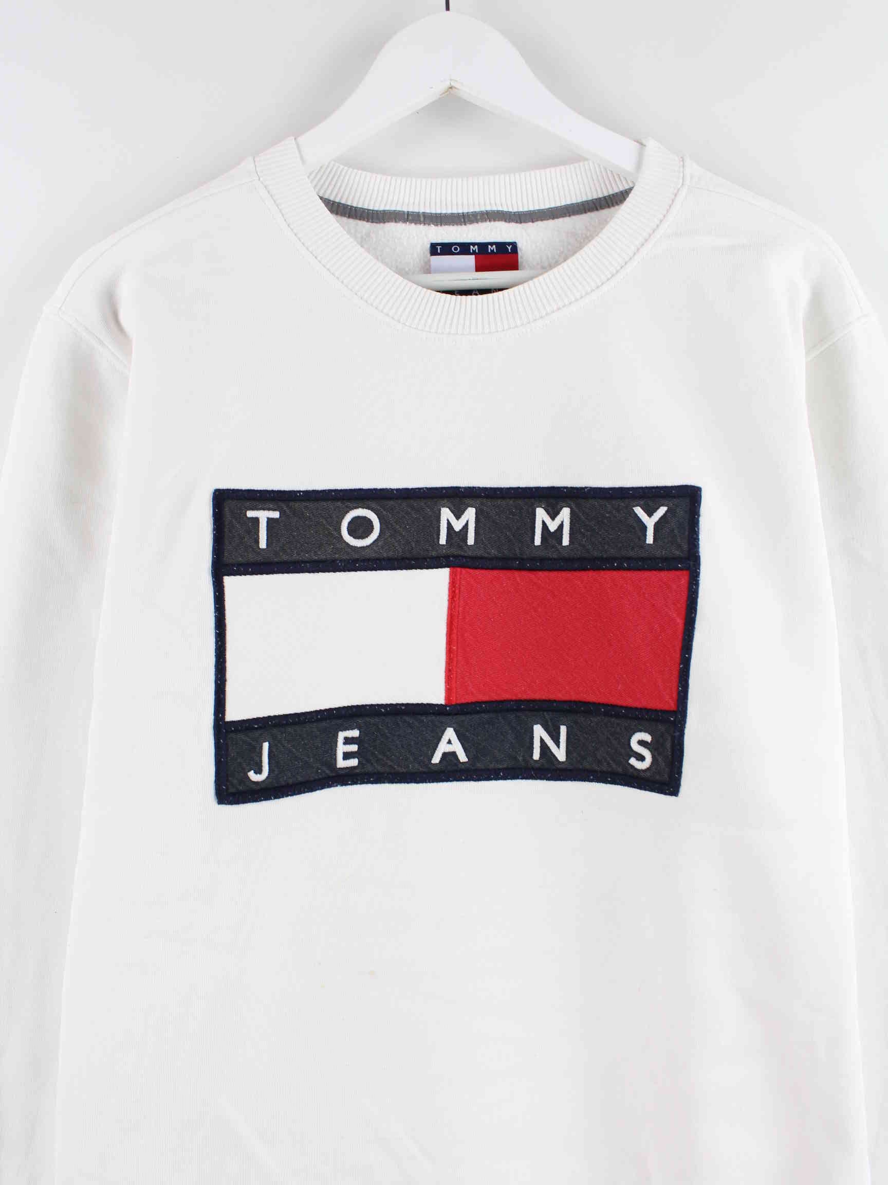 Tommy Hilfiger brand sweater with embroidered logo in size L. It is made of a cotton blend and is available in white.