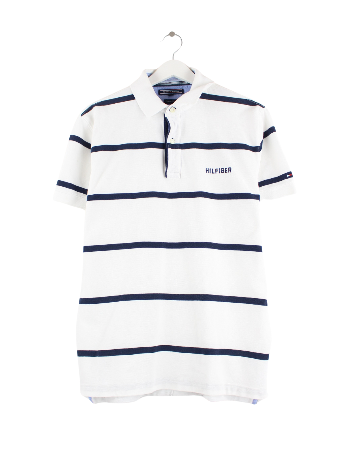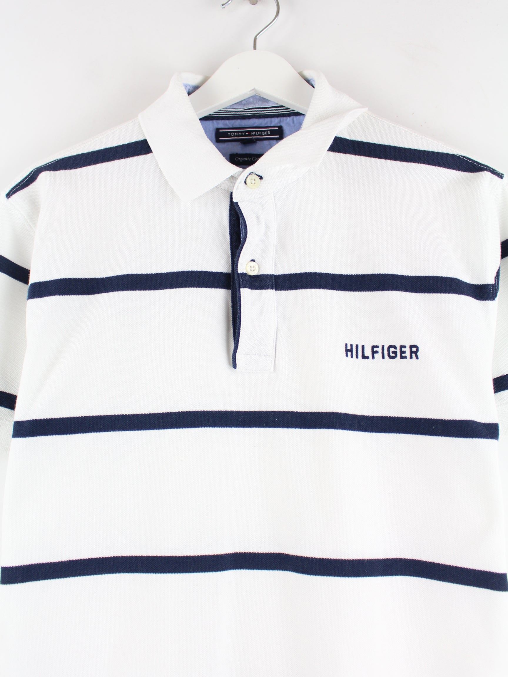 White polo shirt with embroidery from the brand Tommy Hilfiger in size M. It is made of cotton and in good condition in stock.