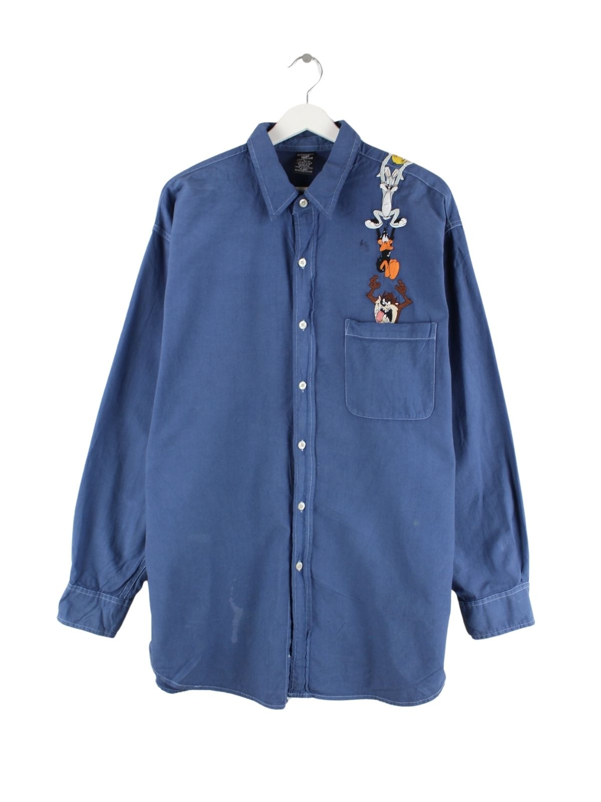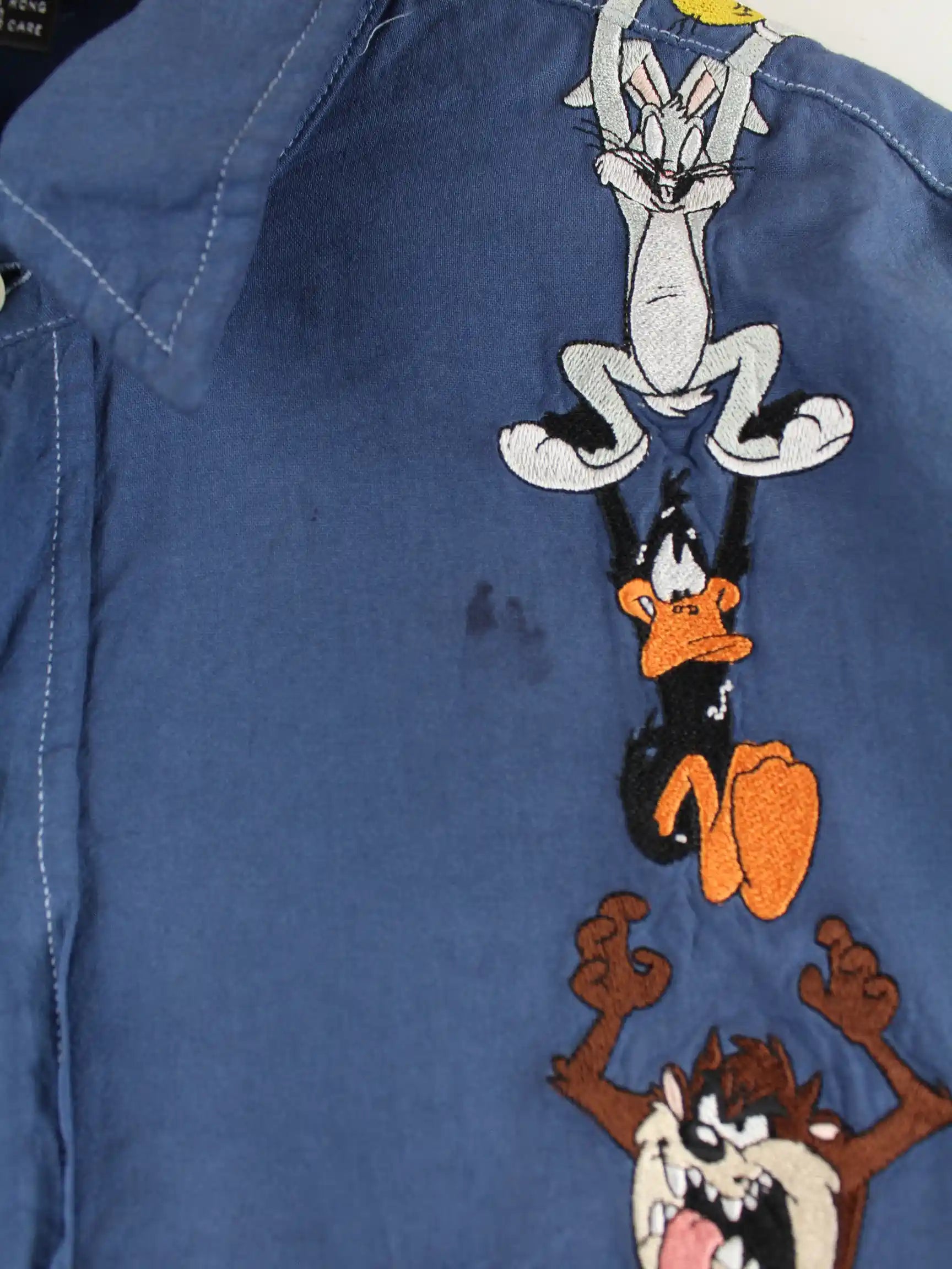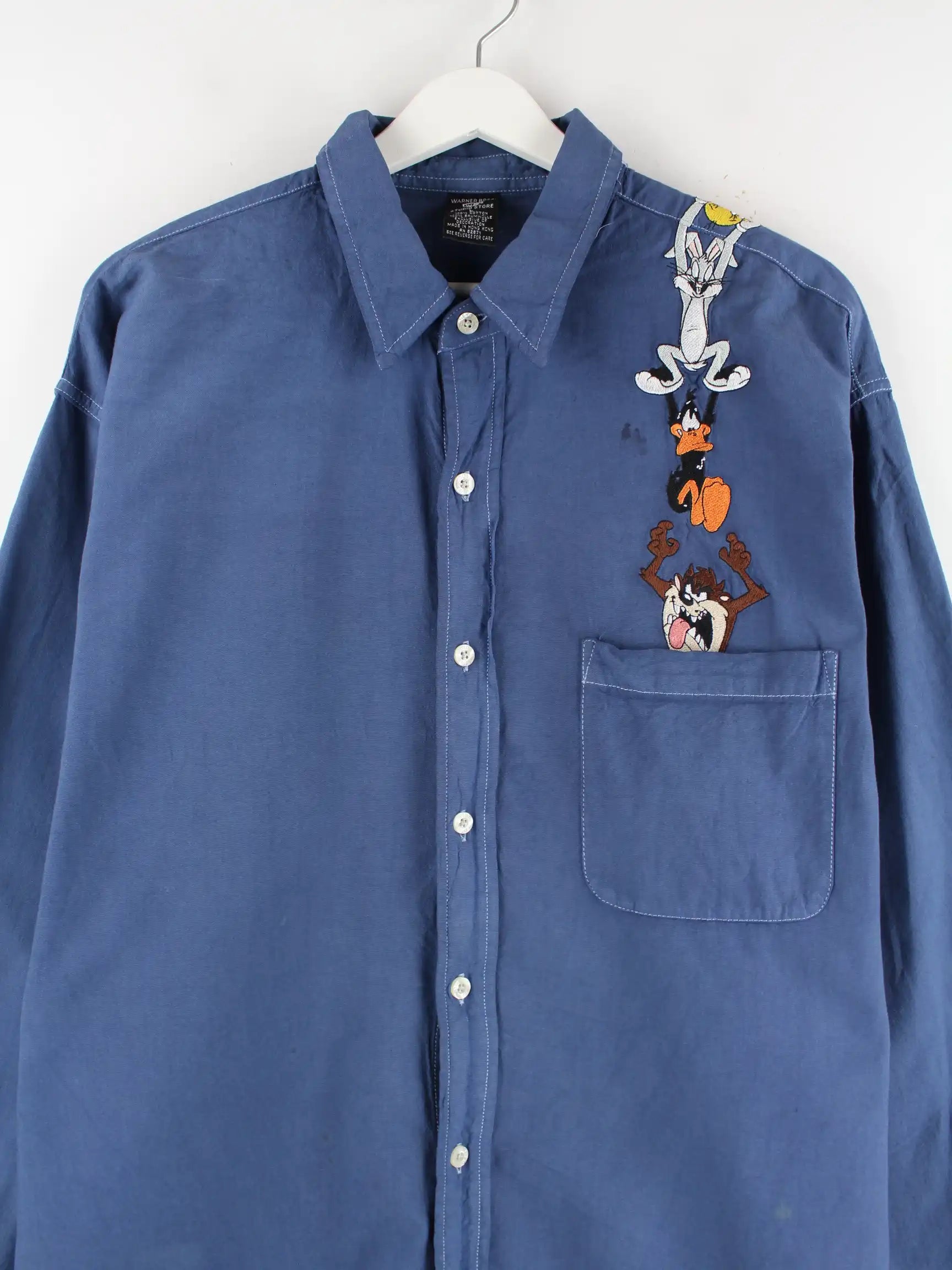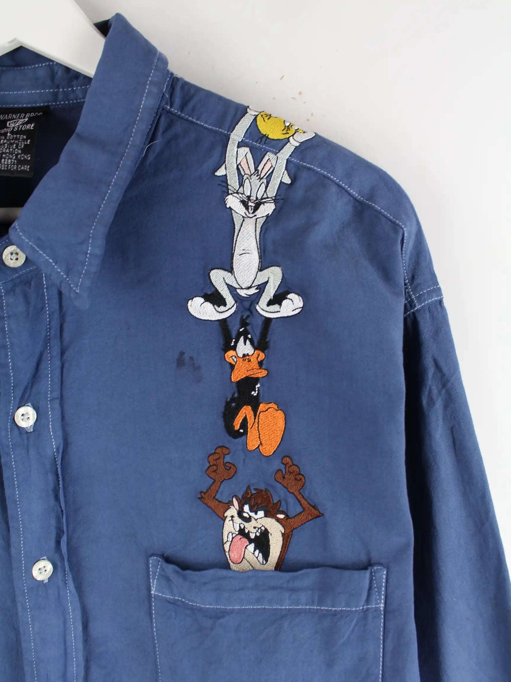 Freizeit Hemd vom Brand Warner Bros mit gestickten Motiven in Größe L. Es ist aus Baumwolle produziert und in Blau bei uns zu bekommen.