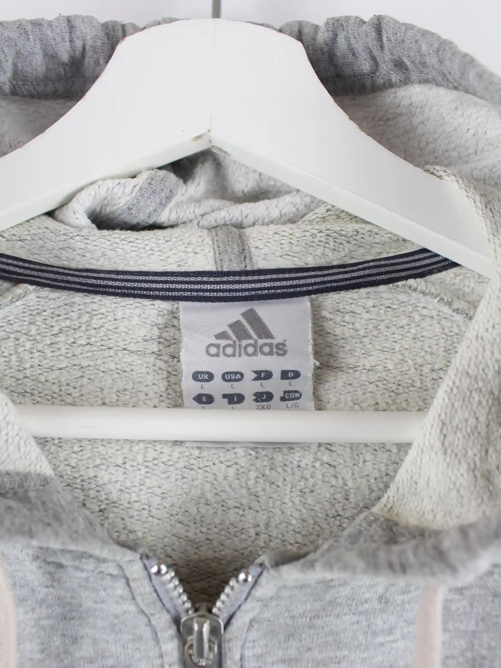 Hoodie des Labels Adidas mit durchgehendem Reißverschluß in Größe L. Er ist aus einer Baumwollmischung hergestellt und in Grau zu bekommen.