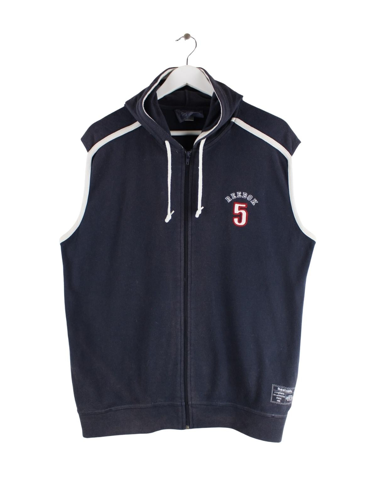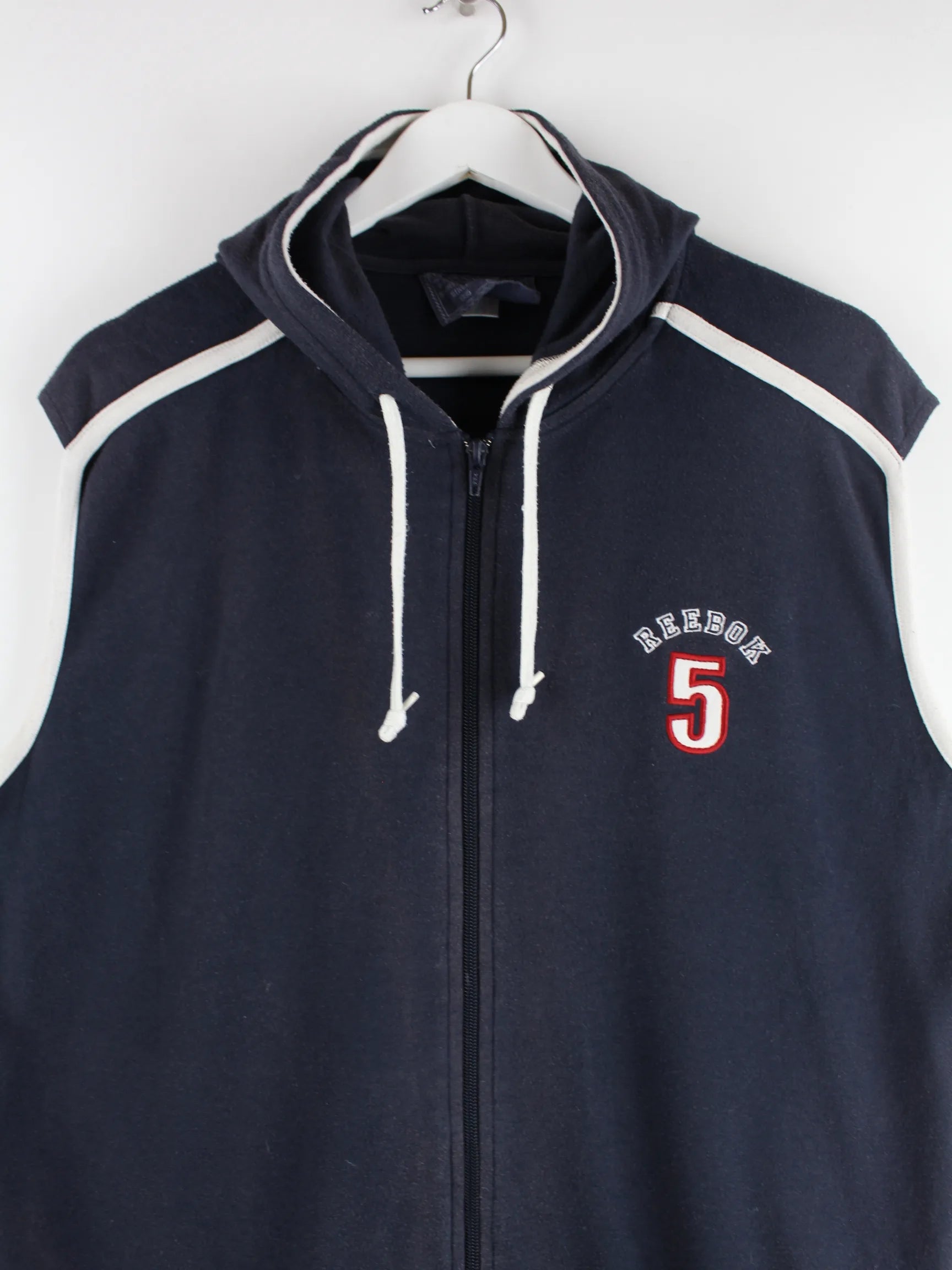 Blauer Hoodie mit langem Reißverschluß der Brand Reebok in Größe M. Er ist aus einer Baumwollmischung hergestellt und in gutem Zustand in Stock.