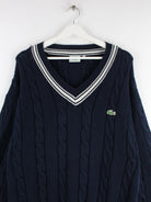 Blauer Pullover vom Label Lacoste in Größe XL. Er ist aus Baumwolle und in sehr gutem Zustand bei uns vorrätig.