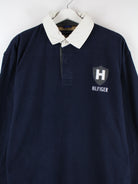 Blaues Poloshirt mit gesticktem Logo vom Label Tommy Hilfiger in Größe XL. Es ist aus Baumwolle hergestellt und in gutem Zustand zu haben.