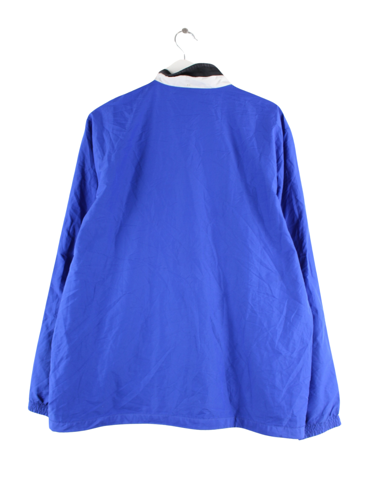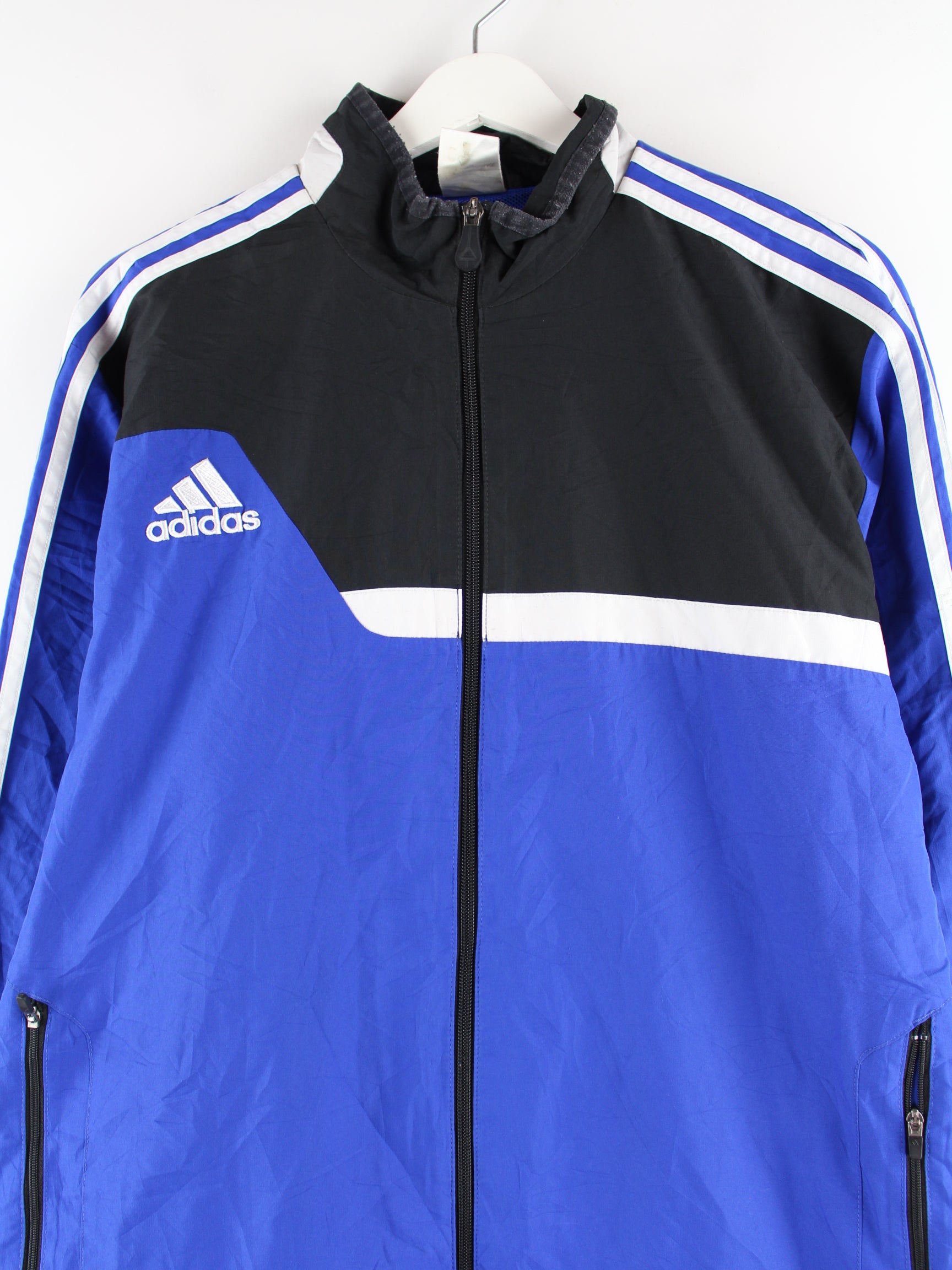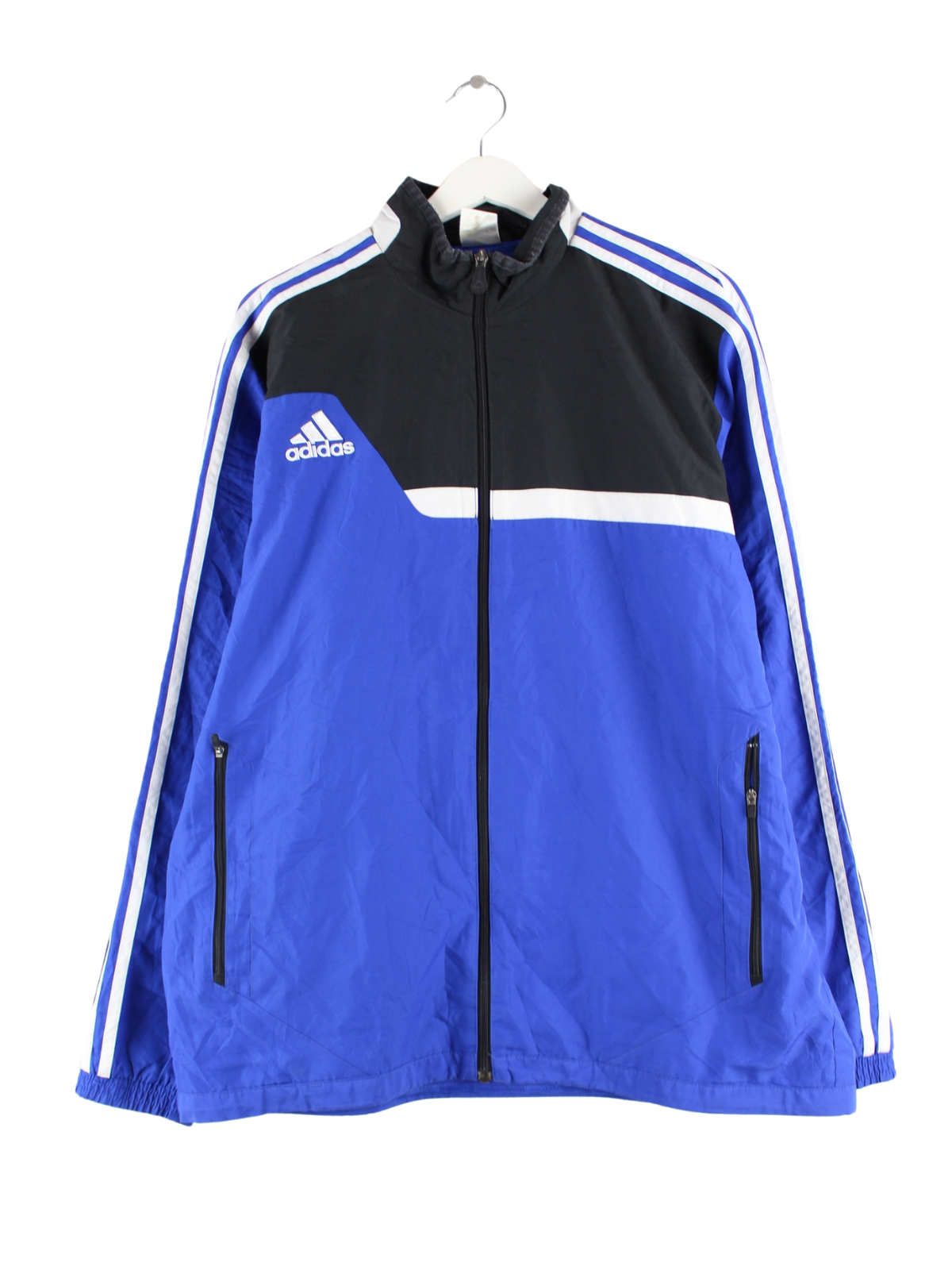 Training jacket from the label Adidas in size L. It is made of synthetic material and is available in blue.