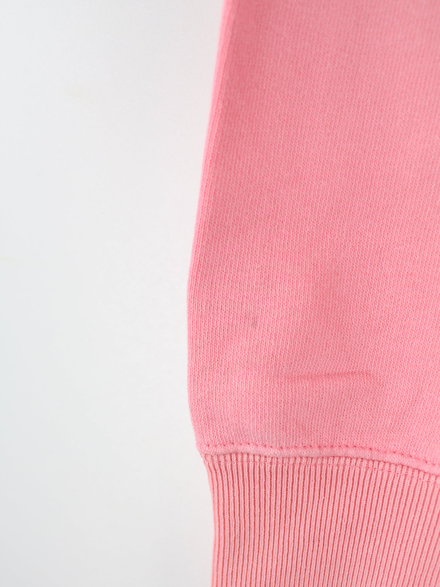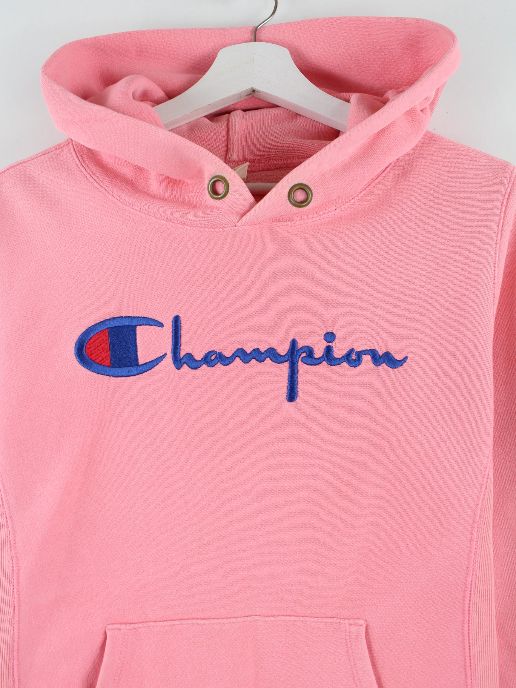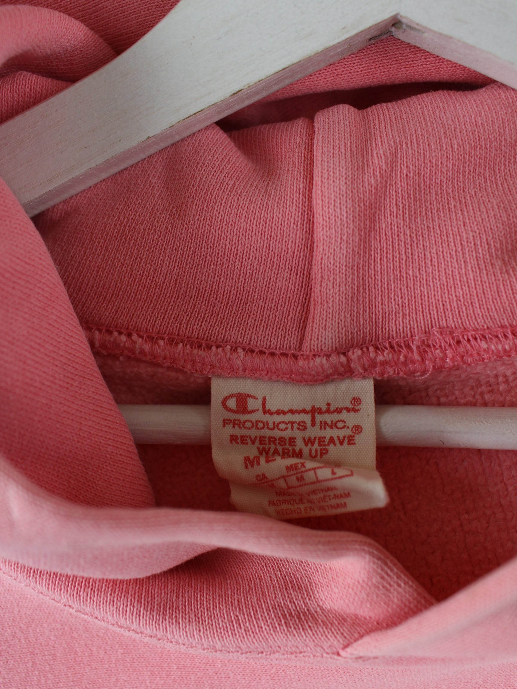 Pink hoodie with embroidered motifs from the Champion label in size M. It is made from a cotton blend and is available in good condition.