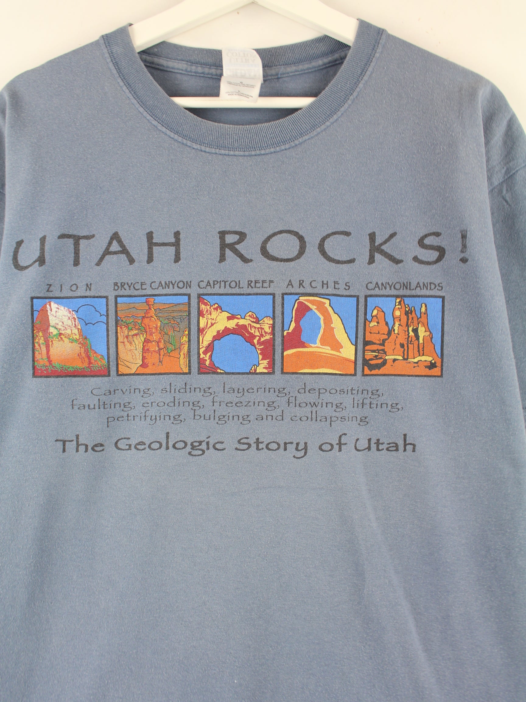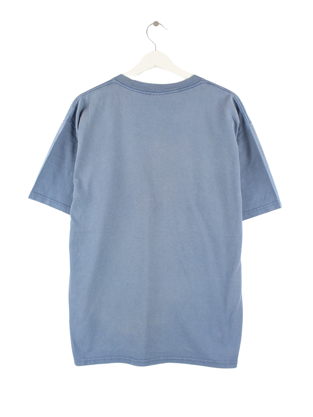 T-shirt from Gildan in size L. It is made of cotton and available in blue. With a chic rocks print.