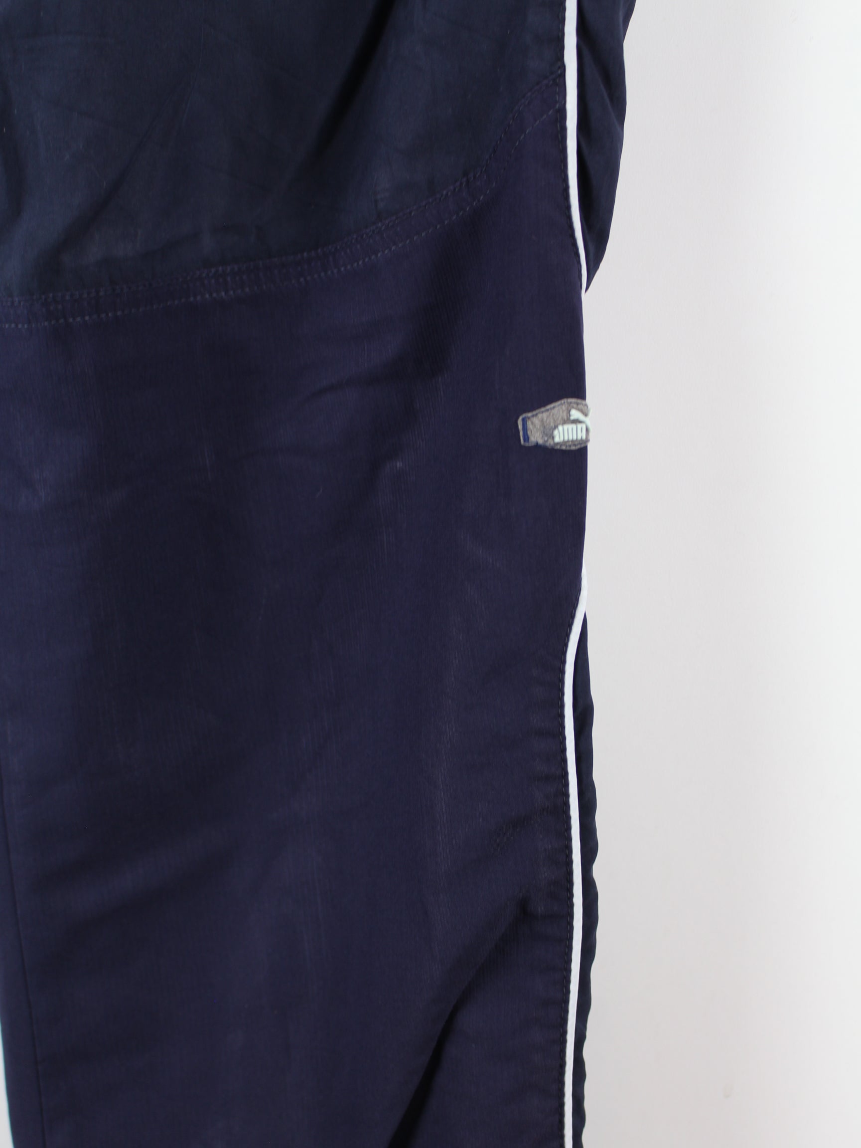 Blue track pants from the brand Puma in size S. They are made of synthetic material and are in good condition in stock.