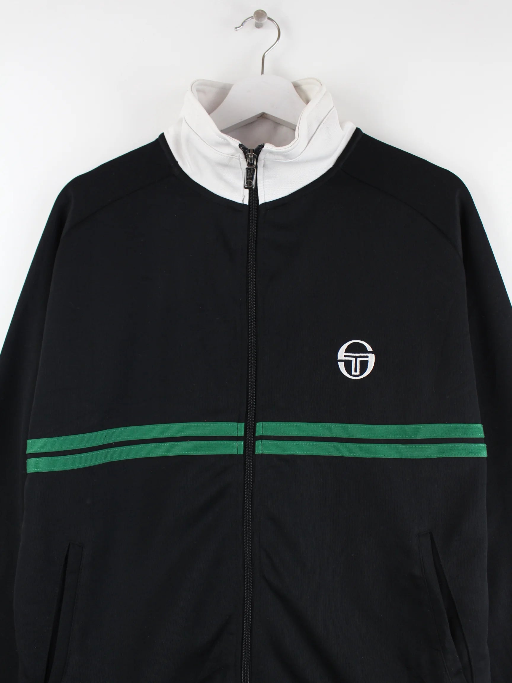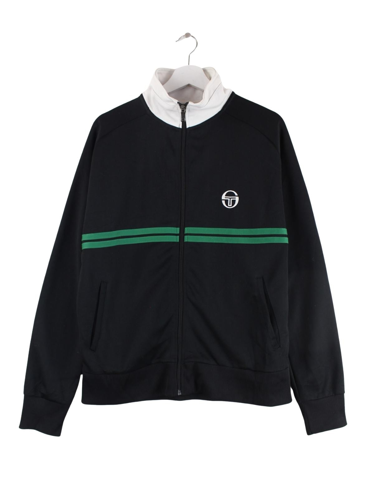 Trainingsjacke des Labels Sergio Tacchini in Größe M. Sie ist aus Synthetik hergestellt und in Schwarz bei uns vorrätig.