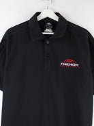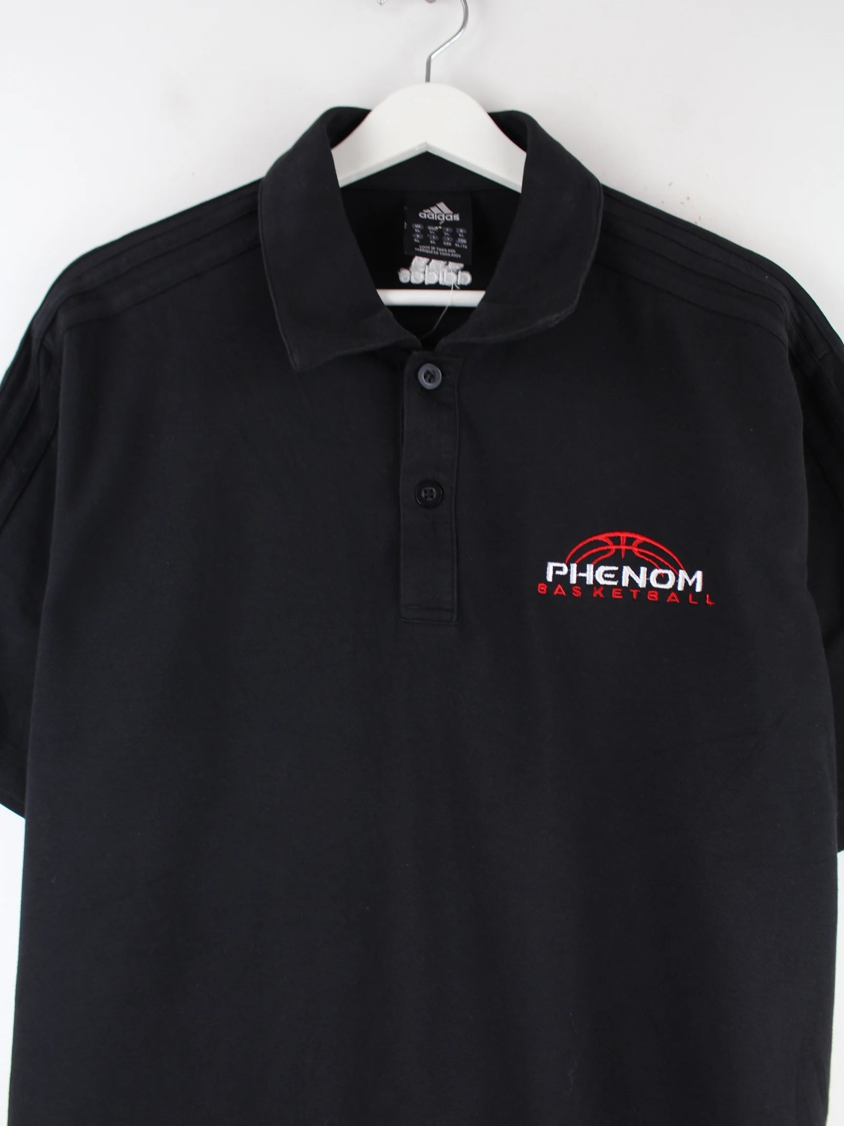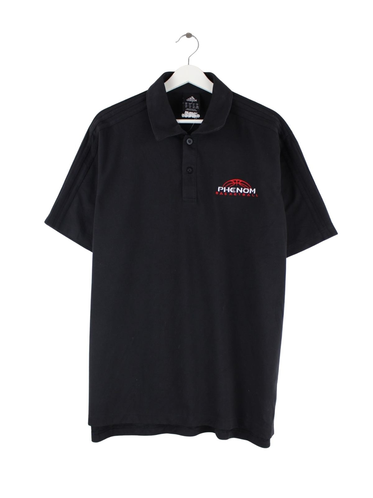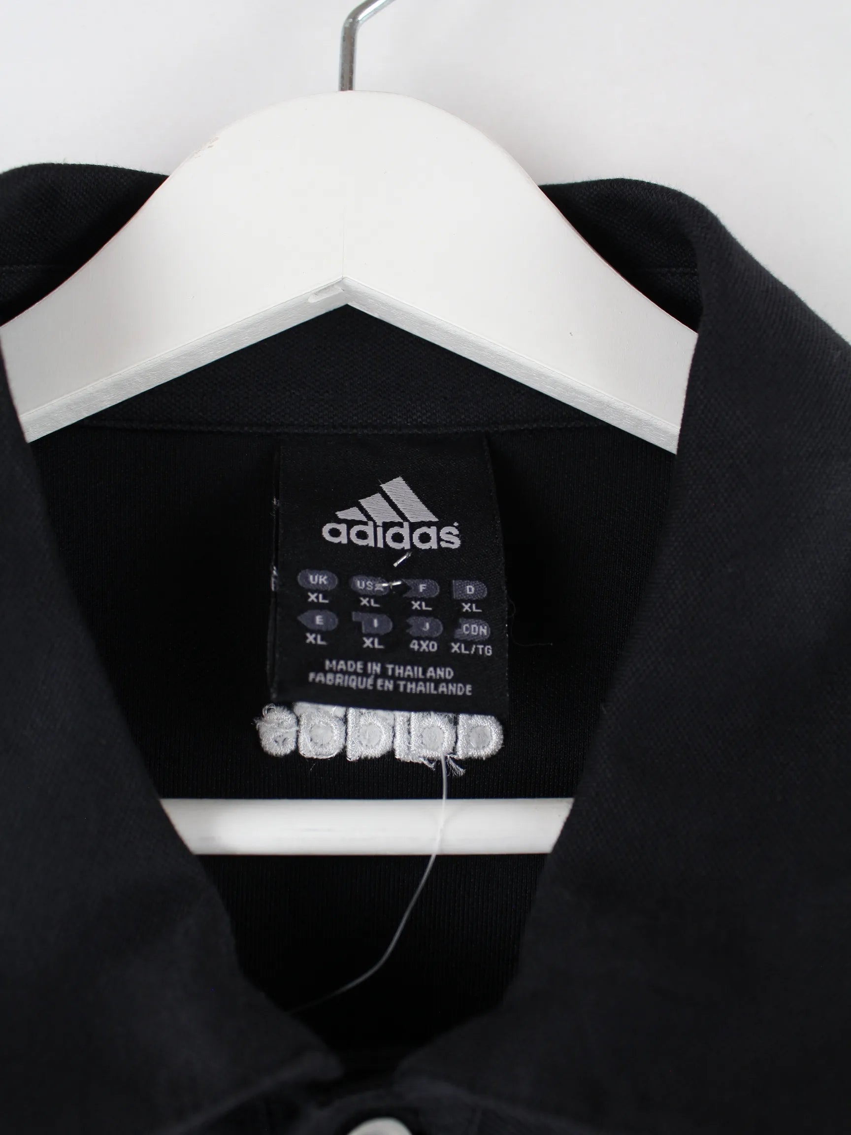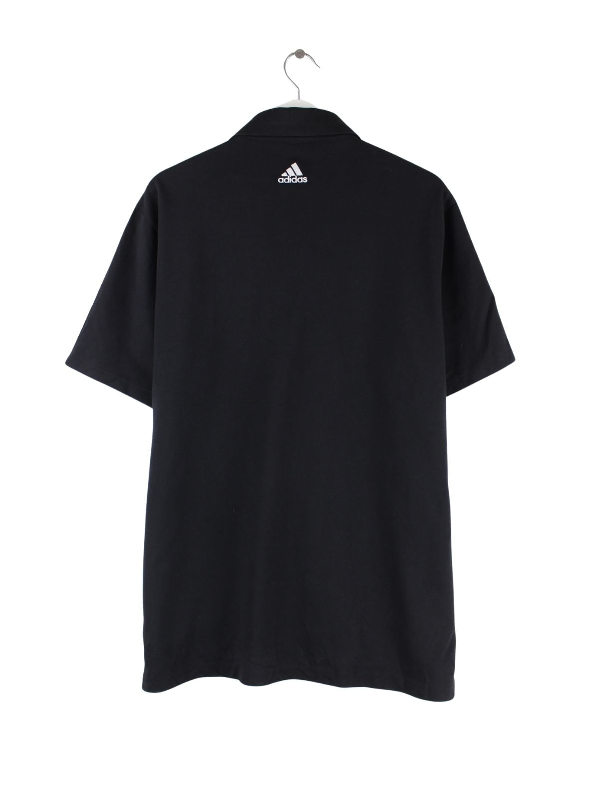 Poloshirt vom Label Adidas mit Stickereien in Größe XL. Es ist aus Baumwolle angefertigt und in Schwarz im Bestand.