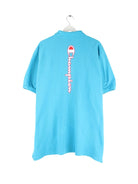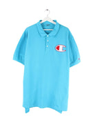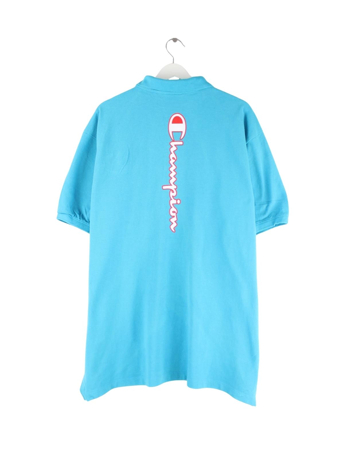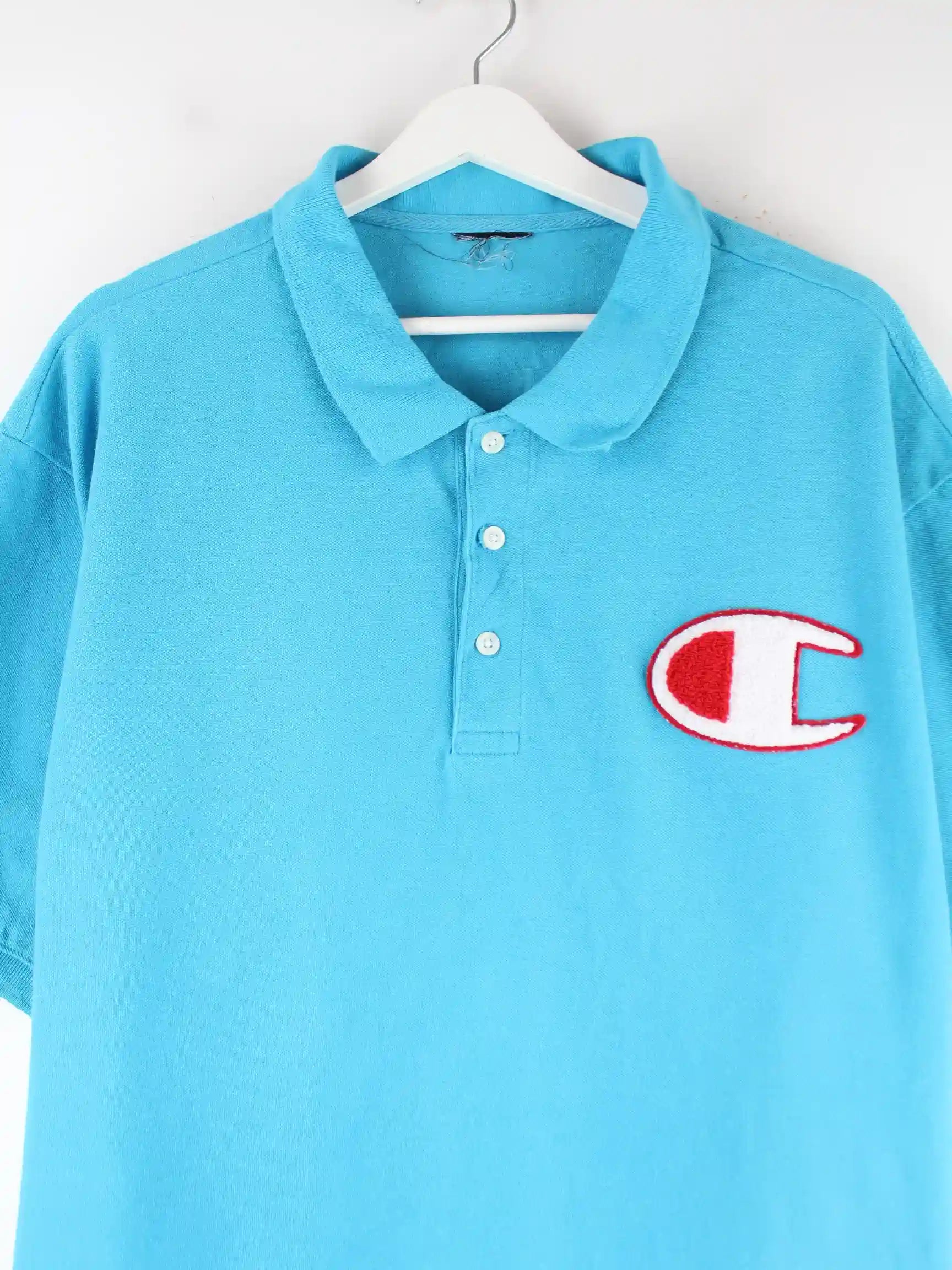 Blaues Poloshirt mit gesticktem Logo vom Brand Champion in Größe XXL. Es ist aus Baumwolle produziert. Den Zustand würden wir als 'In Ordnung' bezeichnen (vergl. Bilder).