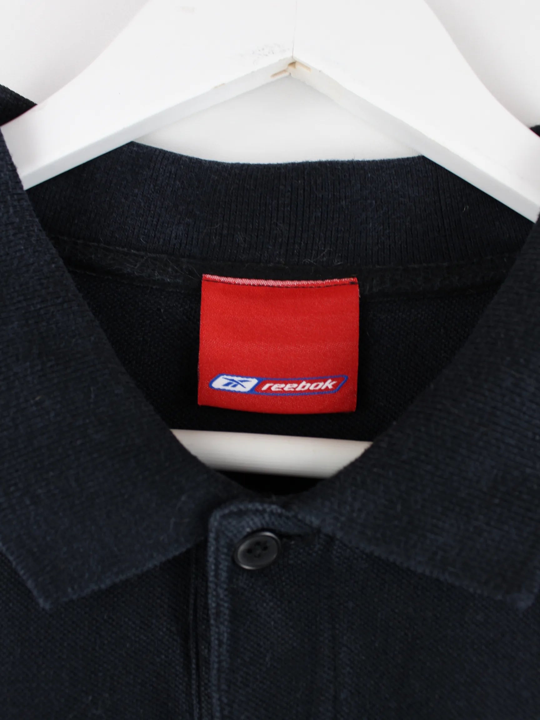 Poloshirt der Brand Reebok in Größe L. Es ist aus Baumwolle und in Schwarz auf Lager.
