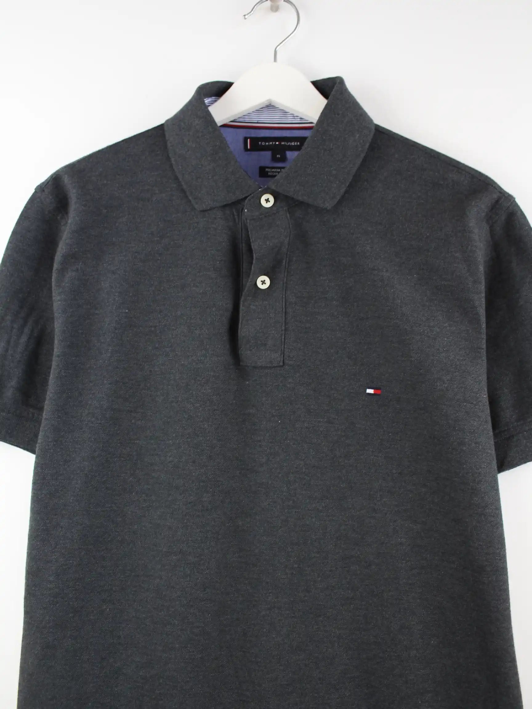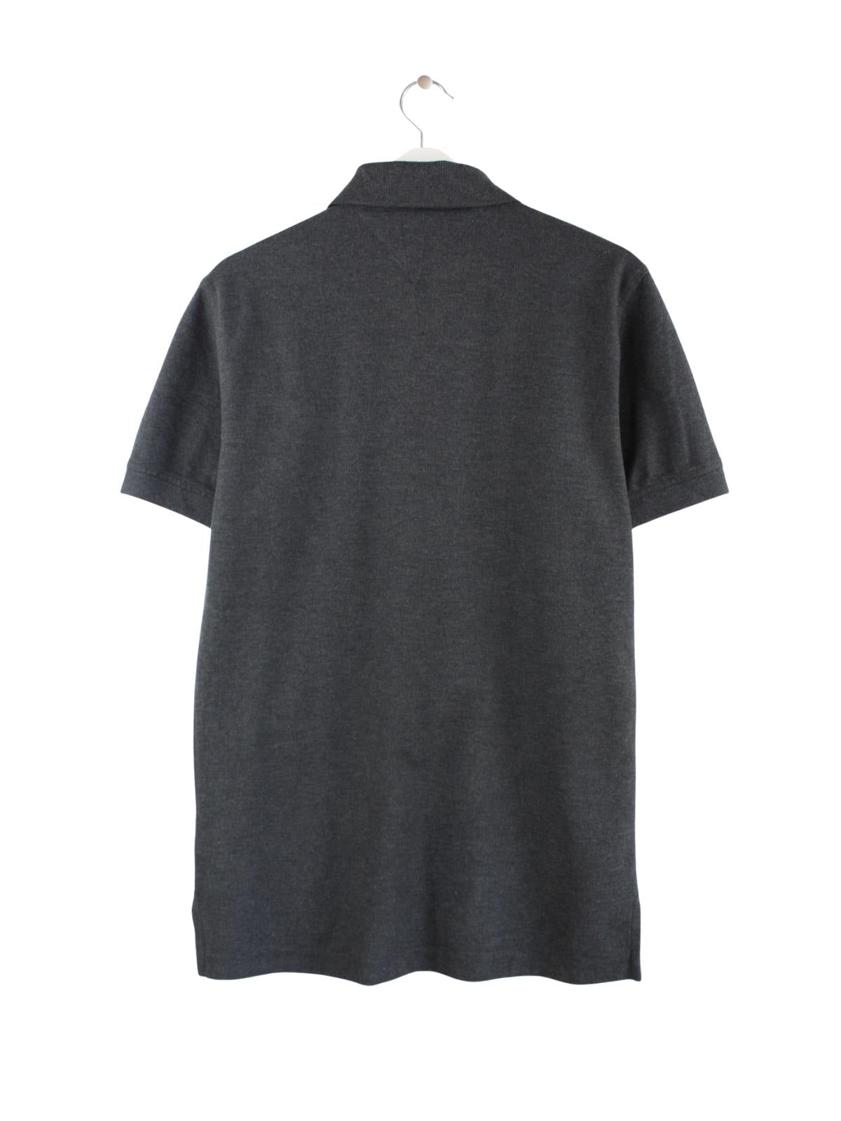 Graues Poloshirt vom Label Tommy Hilfiger in Größe M. Es ist aus Baumwolle und in sehr gutem Zustand vorrätig.